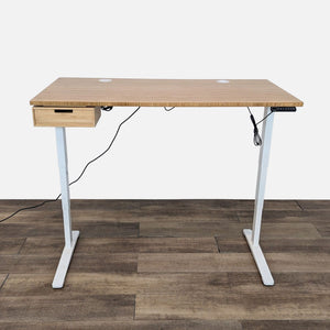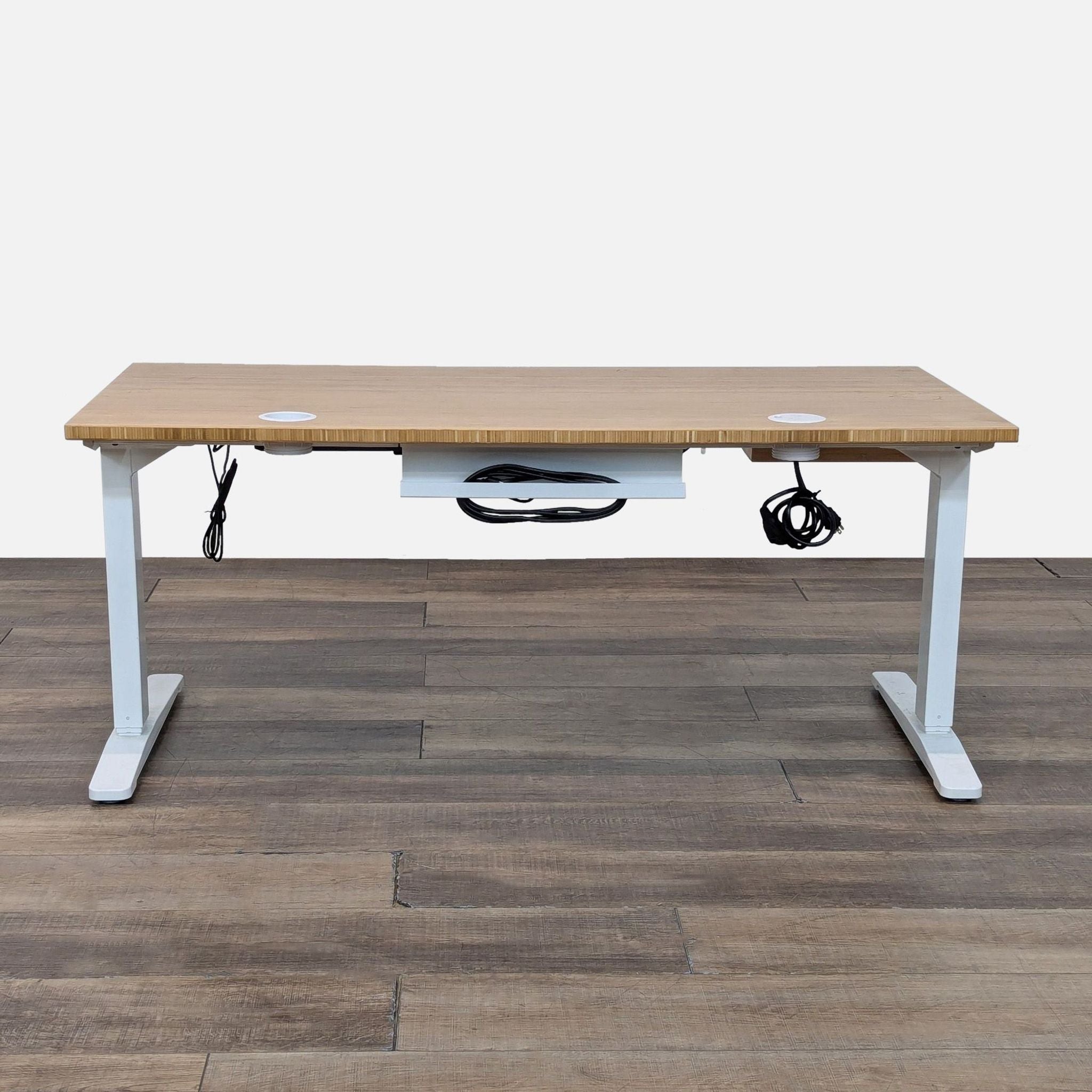 This Uplift V2 standing desk features a white metal T frame base with able management, bamboo top and drawer, two power grommets with usb port, and programmable keypad.