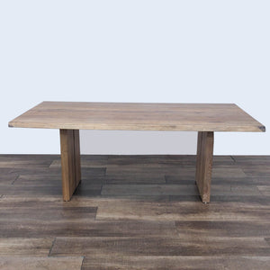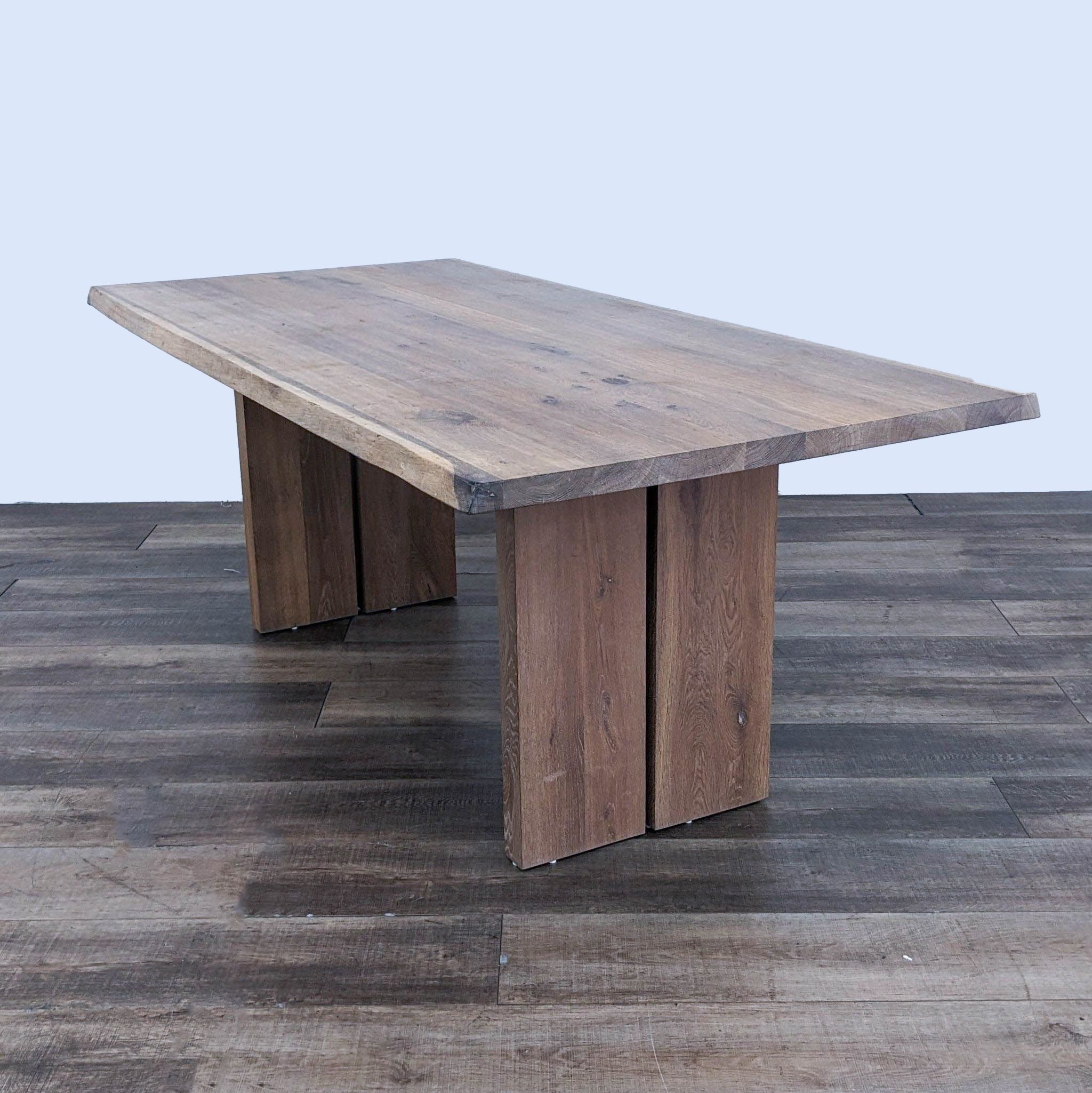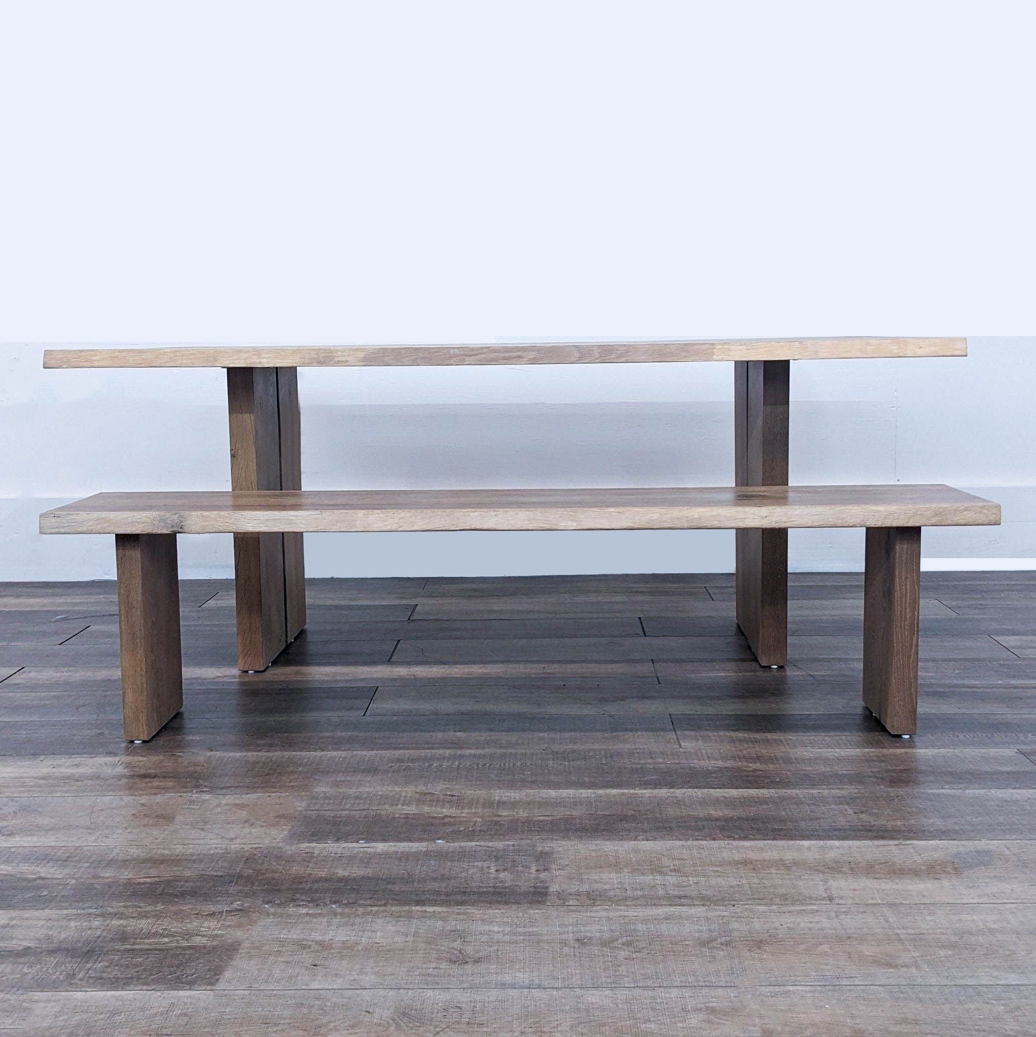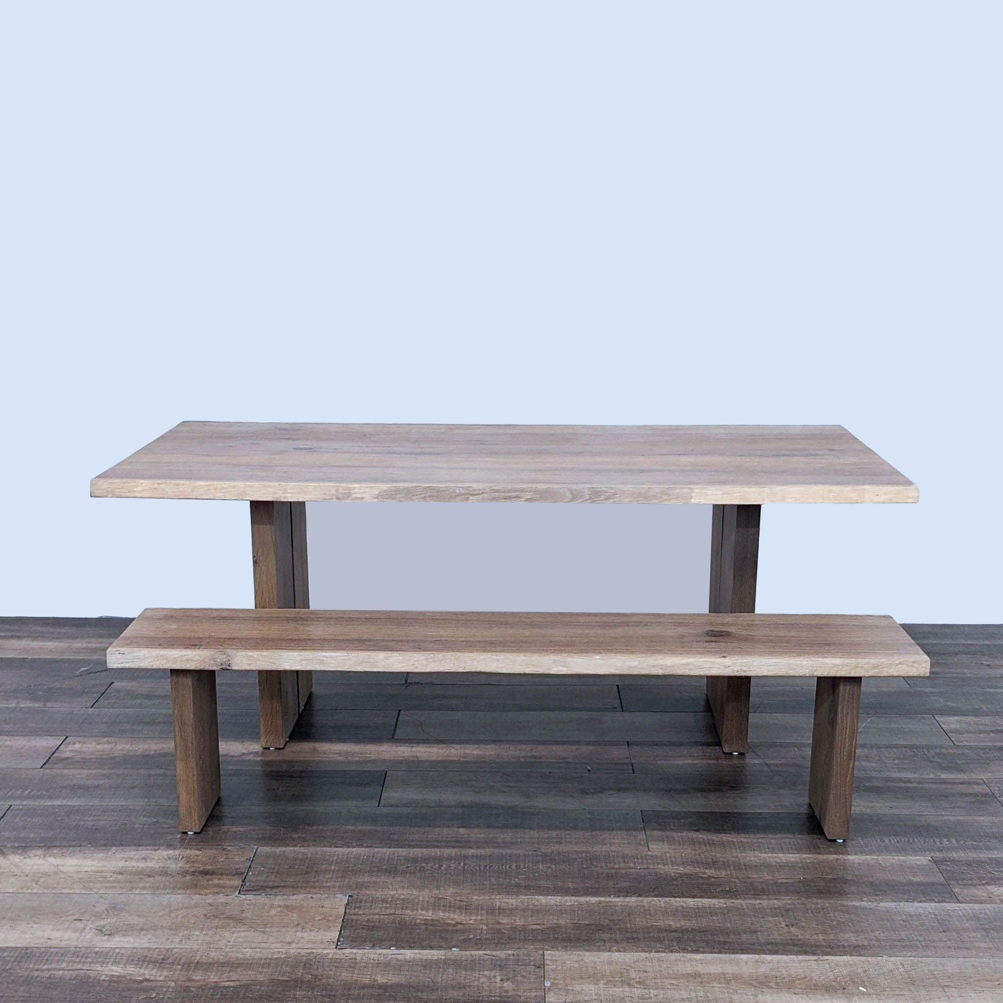 This Crate and Barrel Dakota dining set includes a stunning rustic wooden table and matching bench. Made with Solid European White Oak with fumed finish.