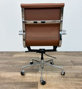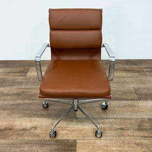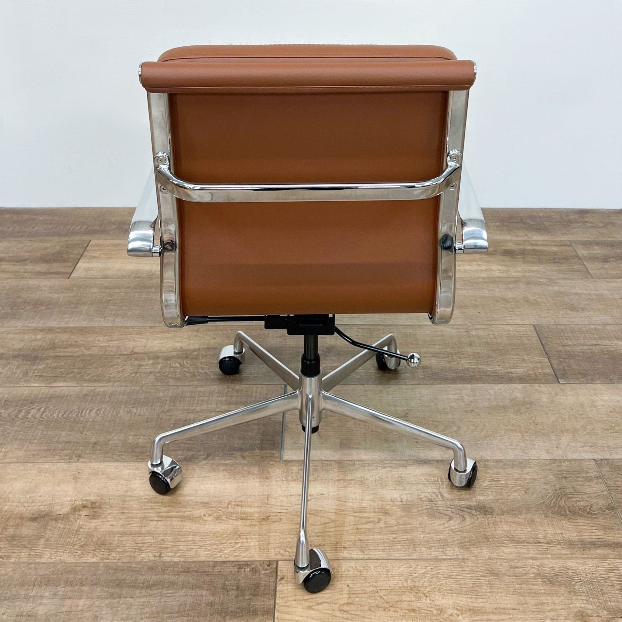 The Soho Management Chair by Laura Davidson displays mid-century modern design with padded seating upholstered in vegan leather, a sturdy aluminum frame and a class 4 gas lift for raising and lowering the seat.