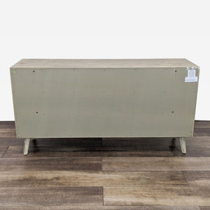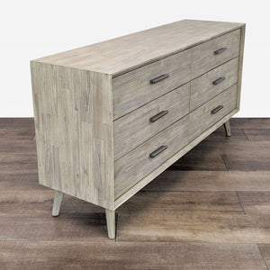 The Allen 6 Drawer Dresser by Living Spaces has mid- century style with tapered legs, solid wood construction, a sand blasted finish and understated handles.