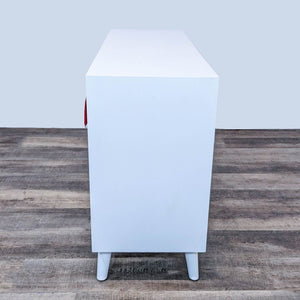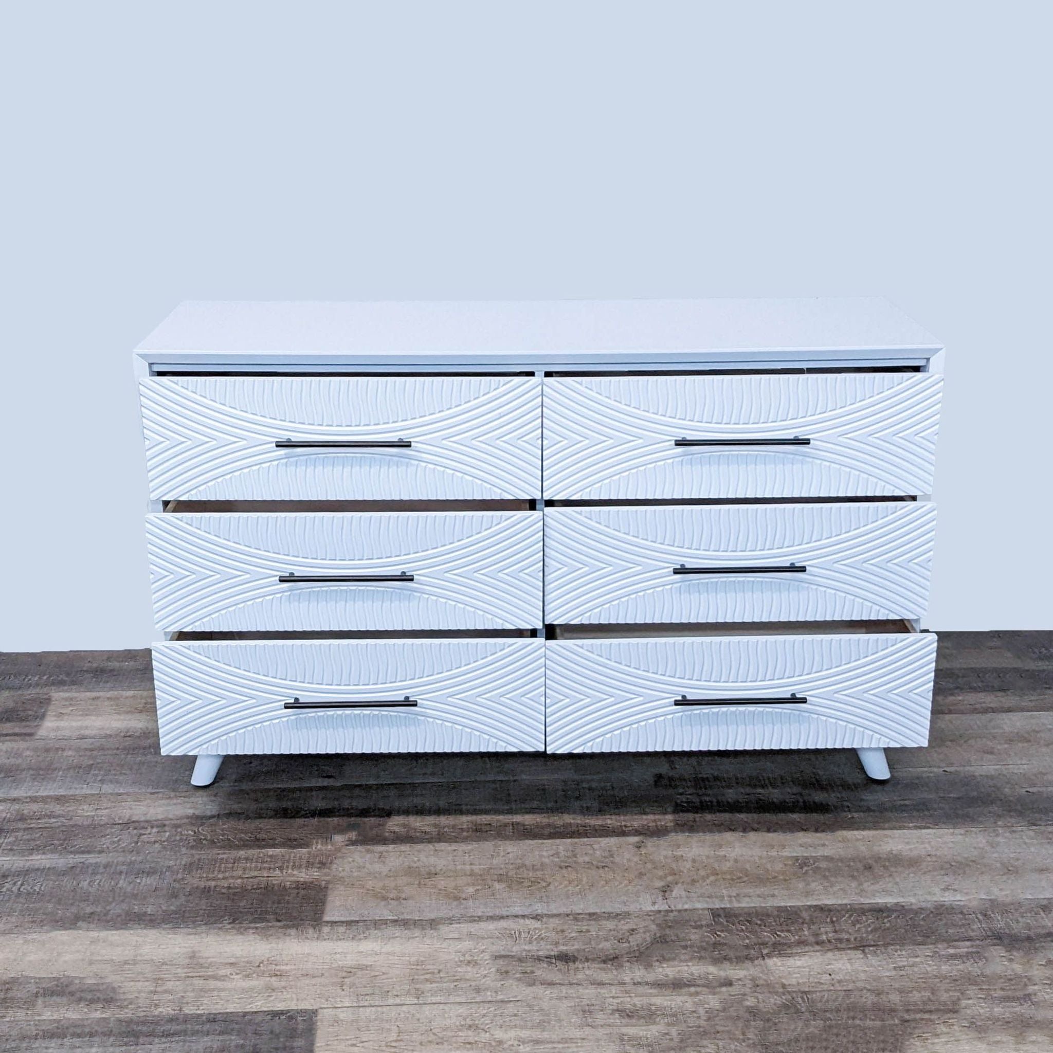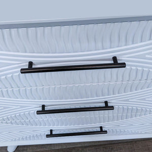 The Tranquility dresser by Alpine Furniture is crafted from solid mahogany with wood veneers in a white finish and features 6 drawers constructed with dovetail joinery, ball bearing glides and metal rod pulls in a black finish.
