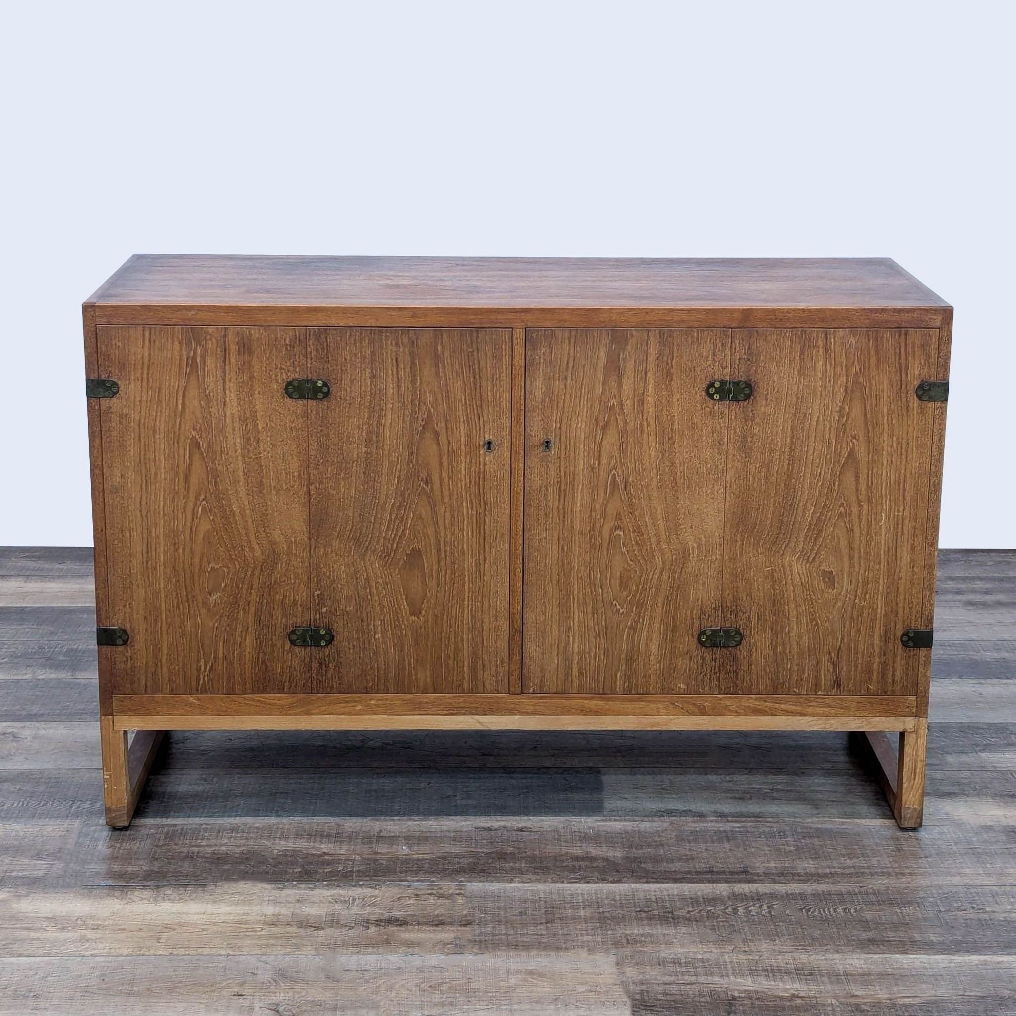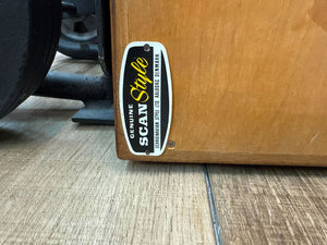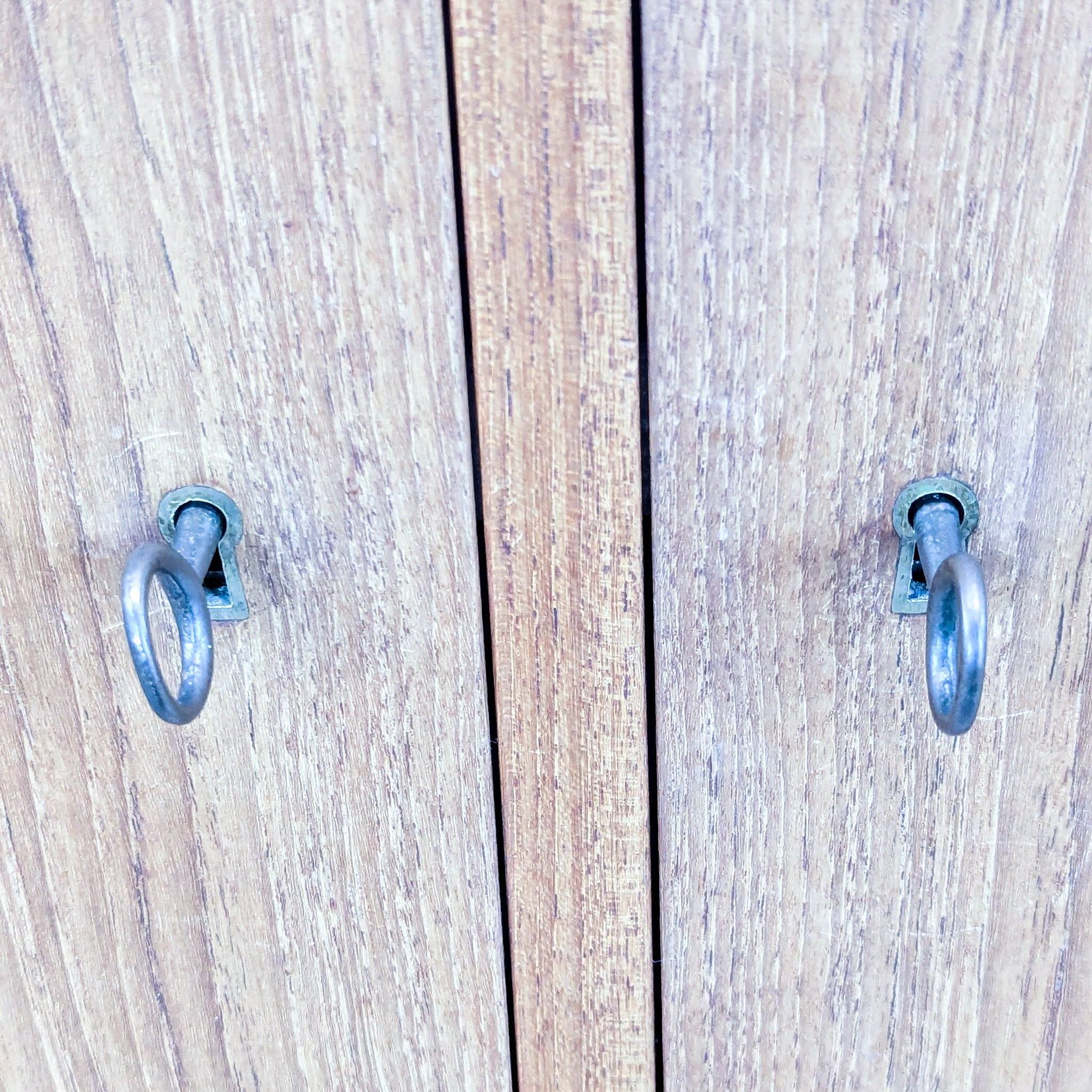 Refined cabinet designed by Borge Mogensen for P. Lauritsen & Sons, Denmark 1957. This cabinet is made of oak veneer, partly solid with metal detail. The cabinet has 2 double folding doors and 2 drawers plus 4 shelves behind. Shelves can be adjusted in height. It is mounted on a runner frame.
