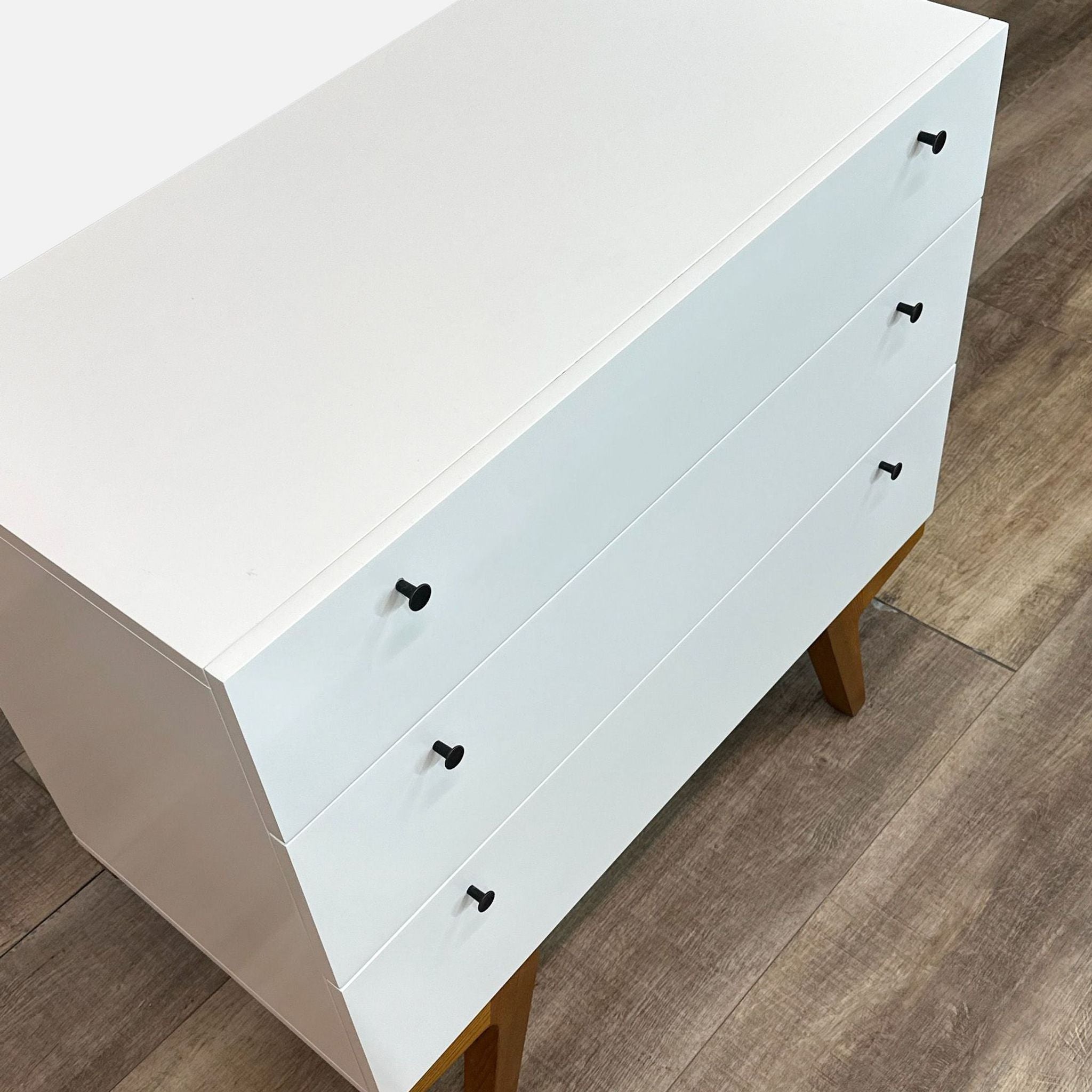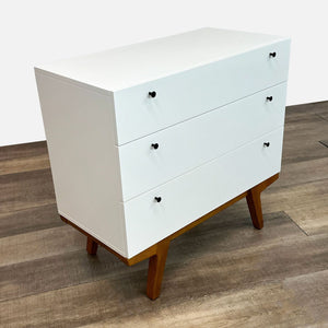 This Modern Dresser features a white lacquer body, pecan base and dark hardware pair on each of the 3 spacious drawers.