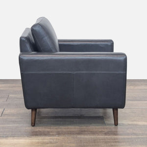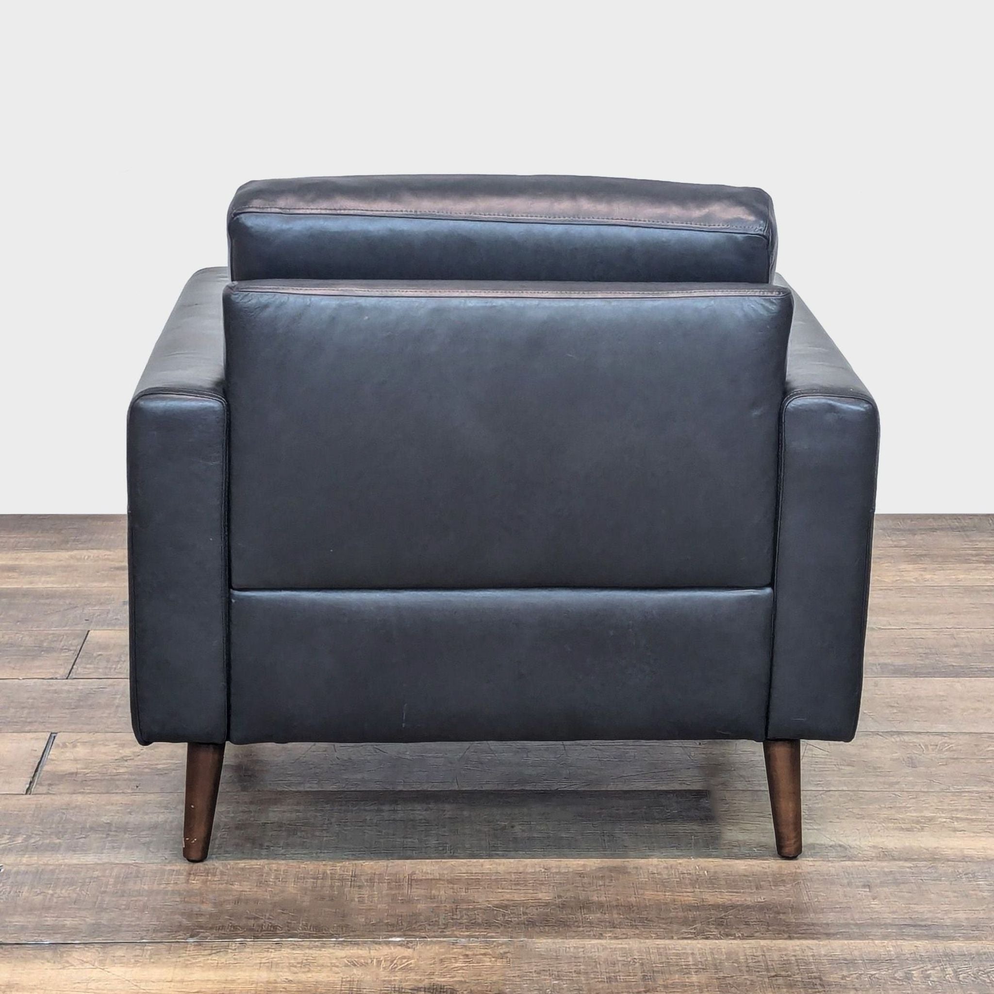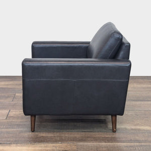 The Nomad lounge chair features black leather upholstery, track arms and wood legs.