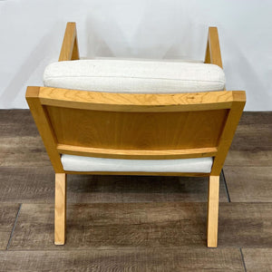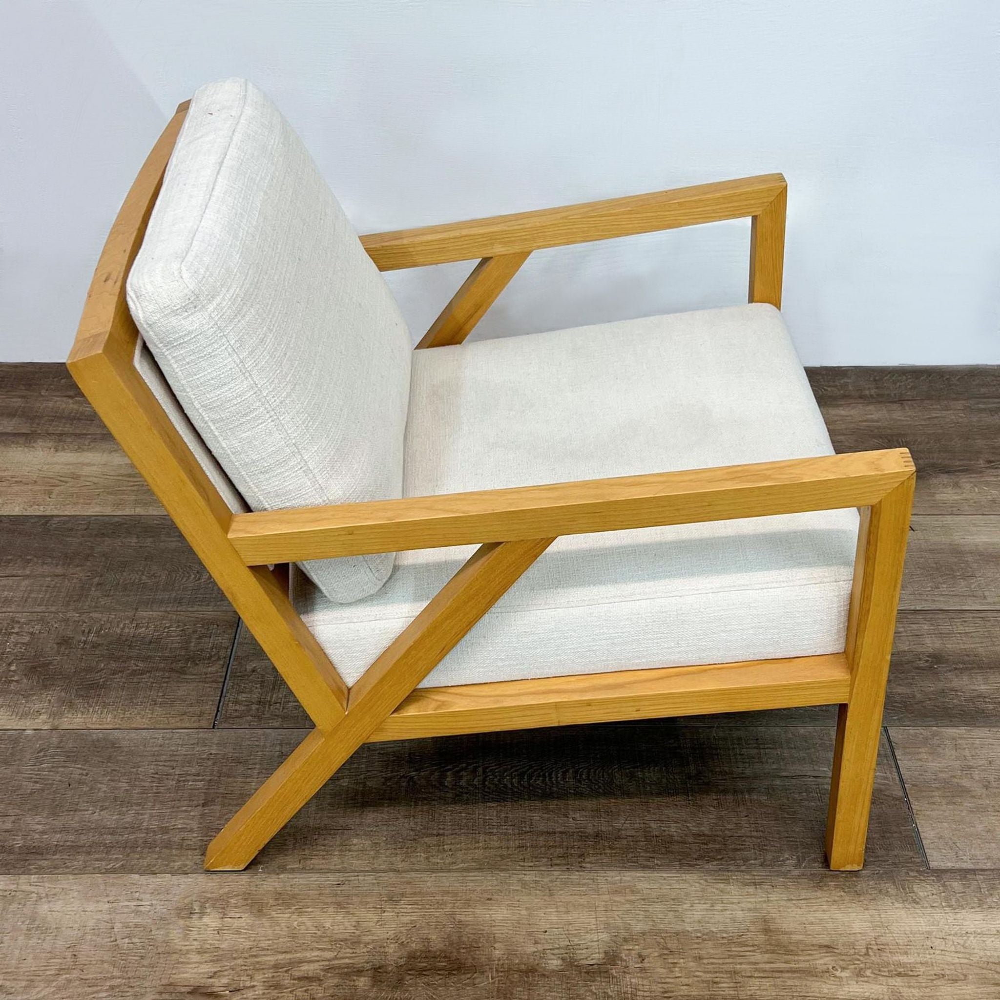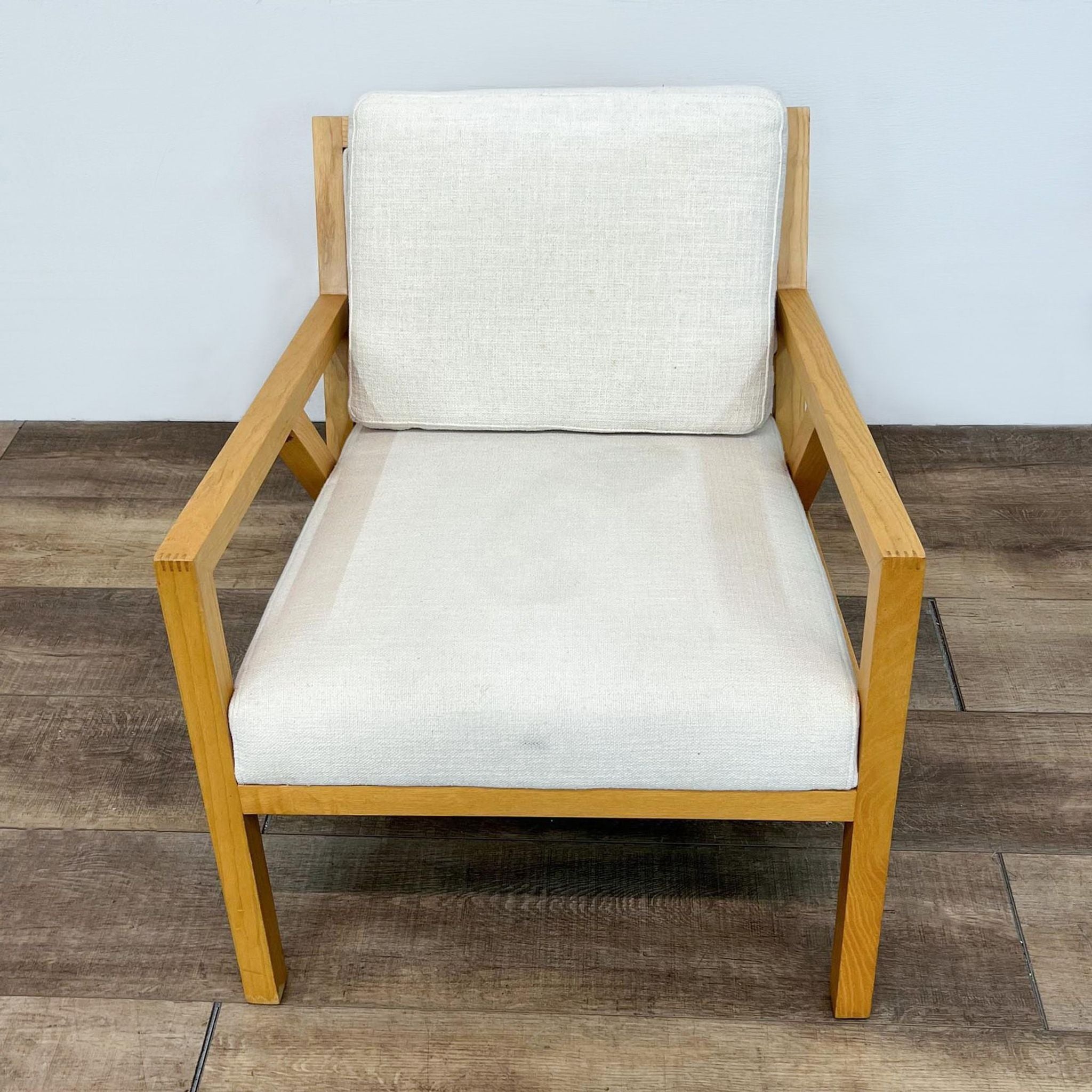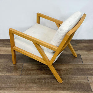 This mid-century modern inspired chair features a solid wood frame with a natural finish and upholstered removable cushions.