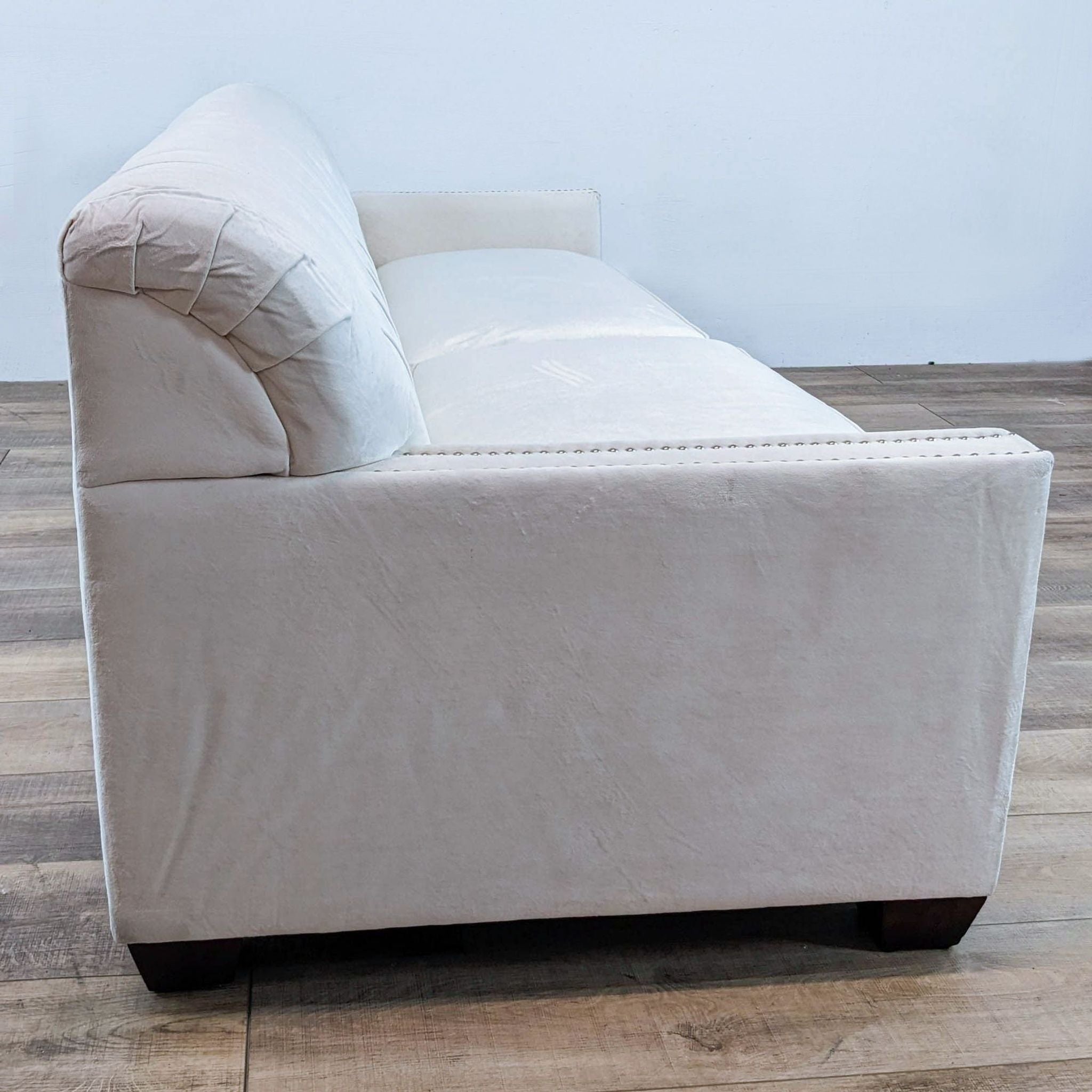 Large Off White Sofa With Narrow Track Arms, Dark Finish Feet, Tufted Back And Nail Head Detailing On Arms