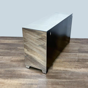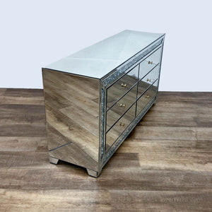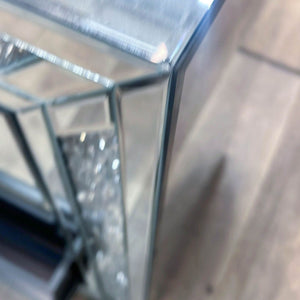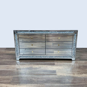 This sleek and modern 6 Drawer dresser is constructed of solid and engineered wood and is covered in a variation of acrylic and glass mirrors and faux diamonds.