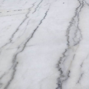 This modern dining table by Mitchell Gold Bob Williams features a X-Shaped Polished Stainless Steel base with a round white marble top.
