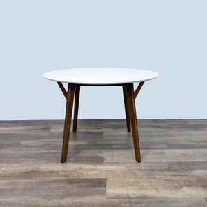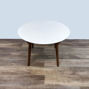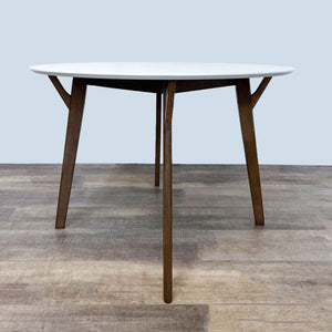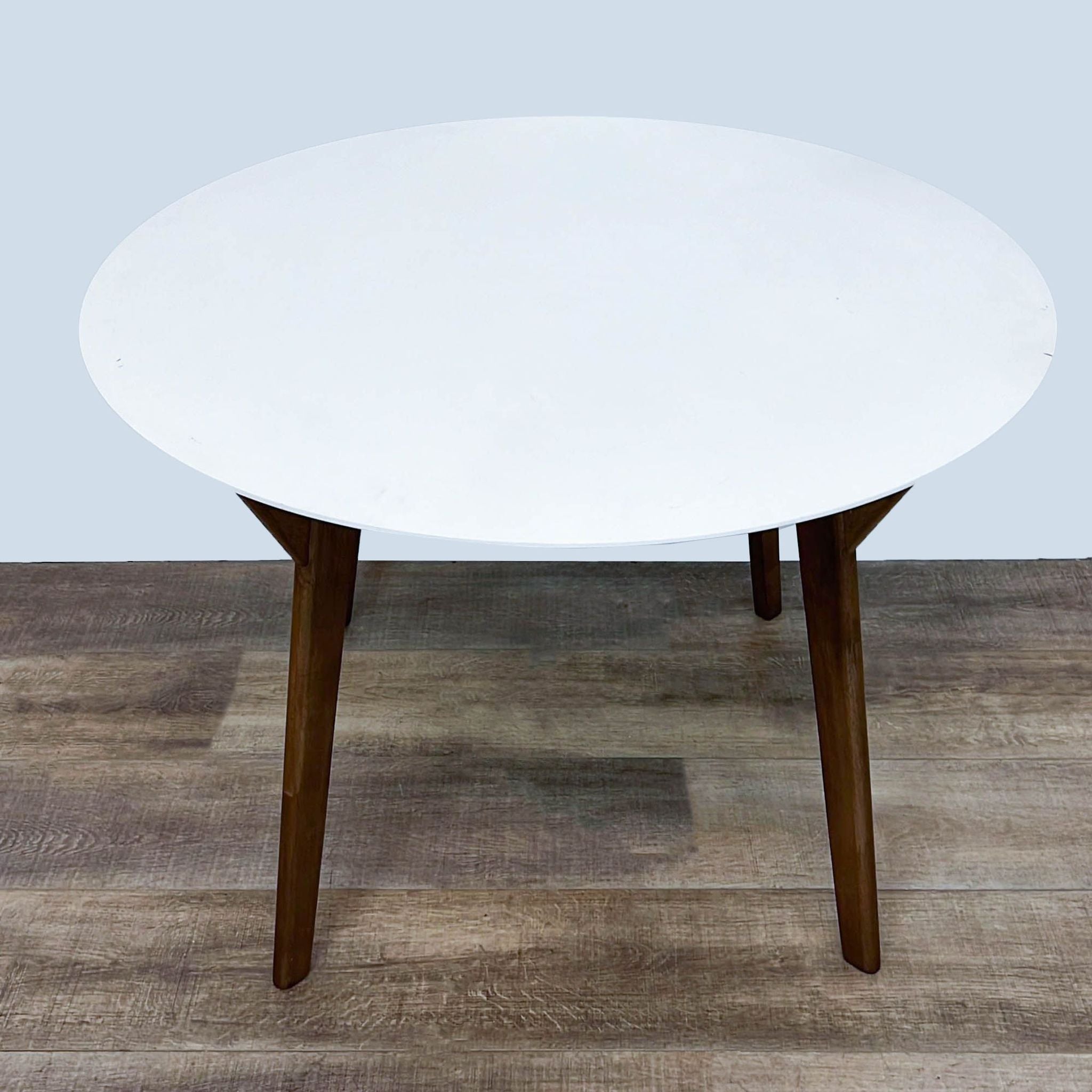 This dining table by Wegmans Furniture features timeless Scandinavian design with a modern feel and is enhanced with a white round top with a beveled edge that is supported by four solid wood legs.