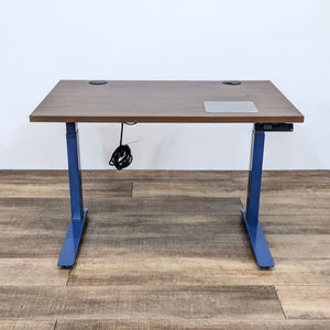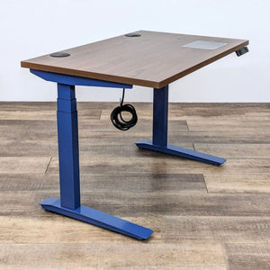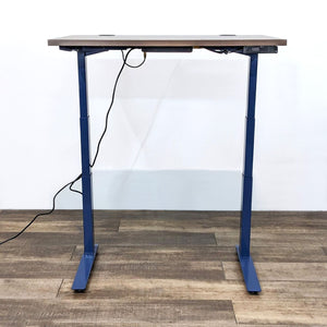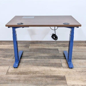 Dark Wood Finish Desk Top On Blue Steel Frame With Motorized Power Height Adjustment