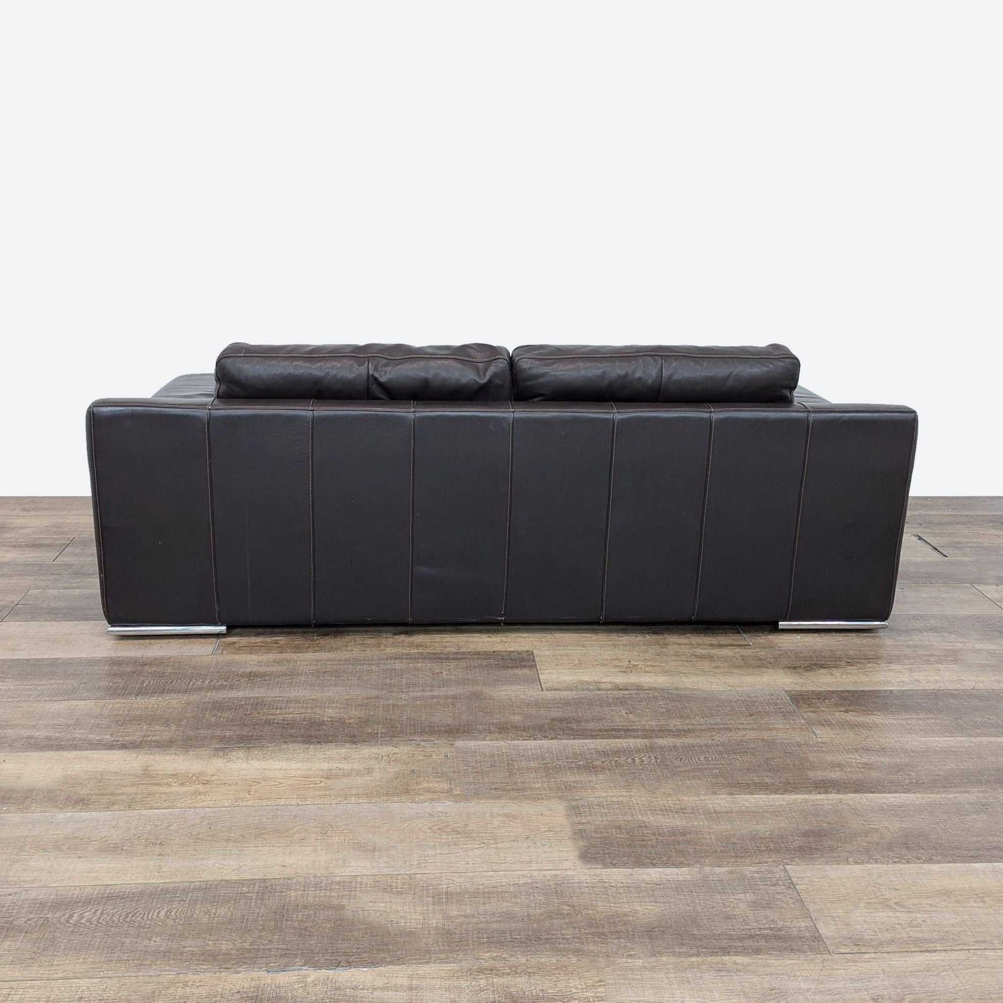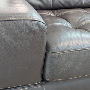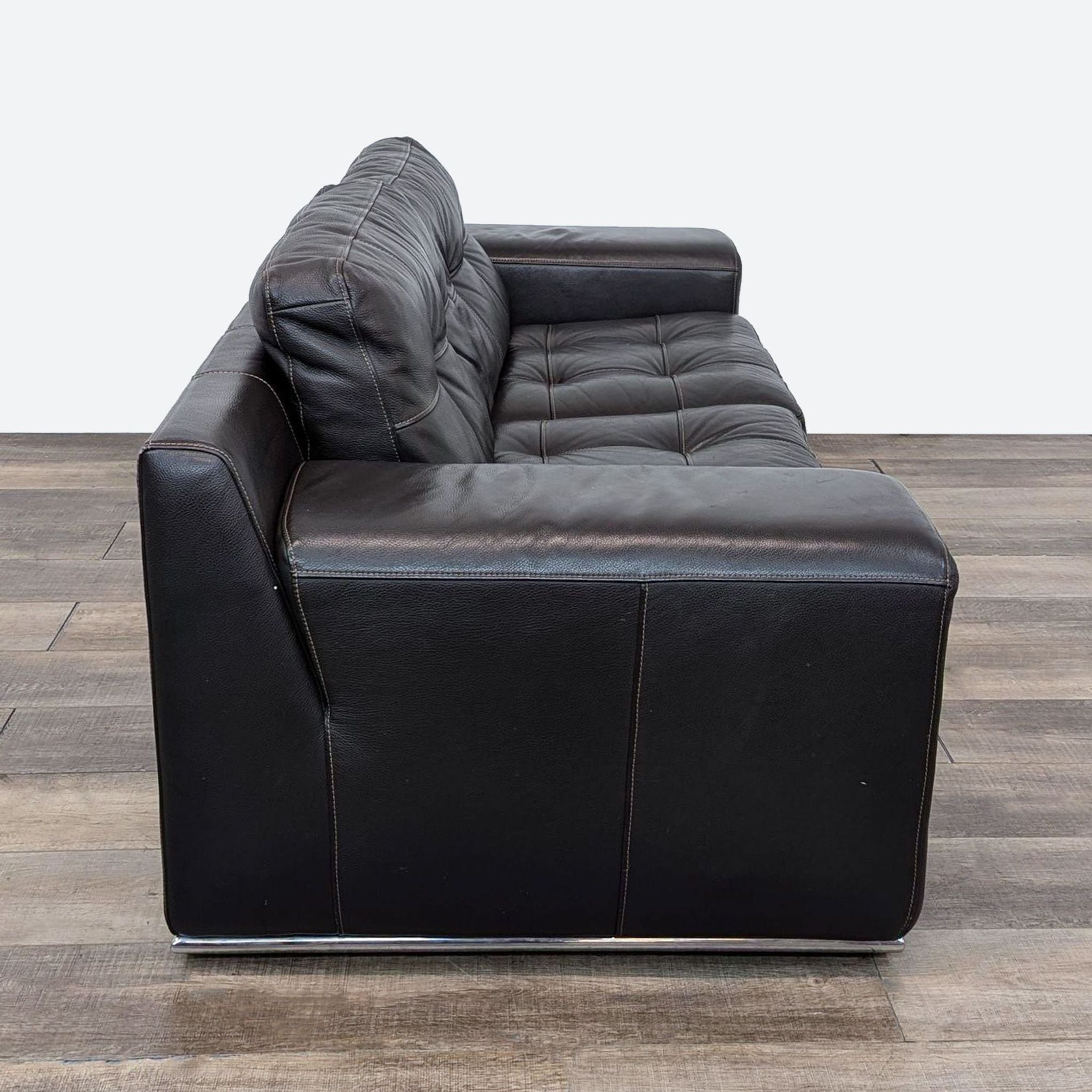 This Loveseat from Style & Form features dark brown leather upholstery with tufting and plush cushioning.