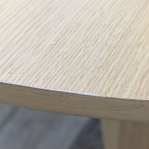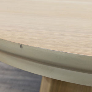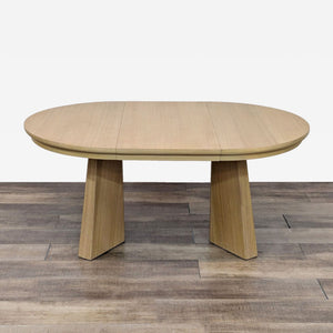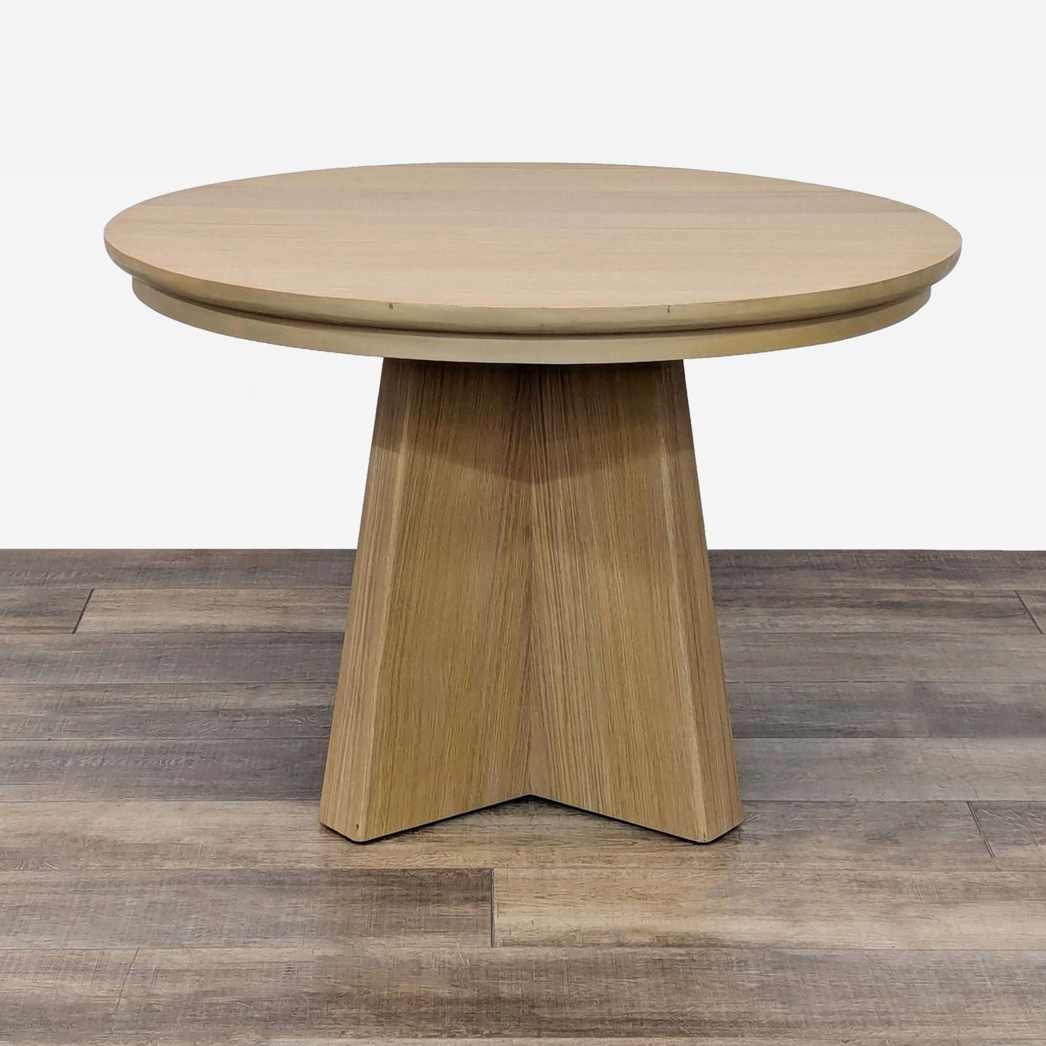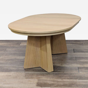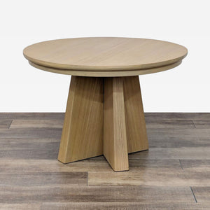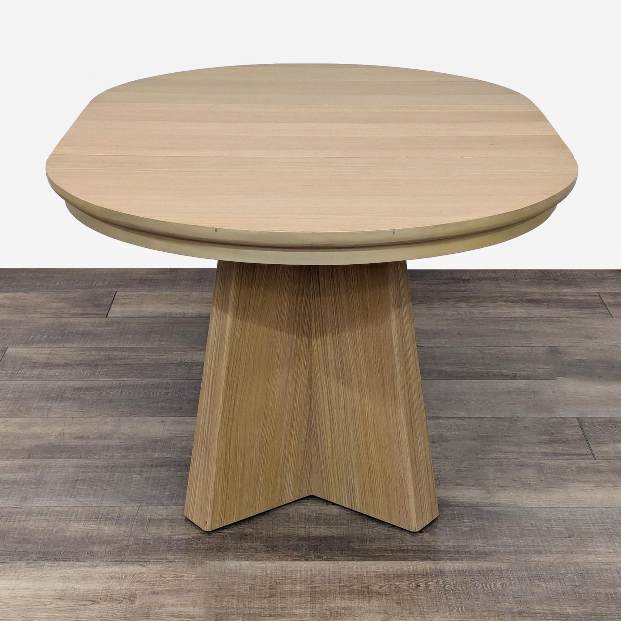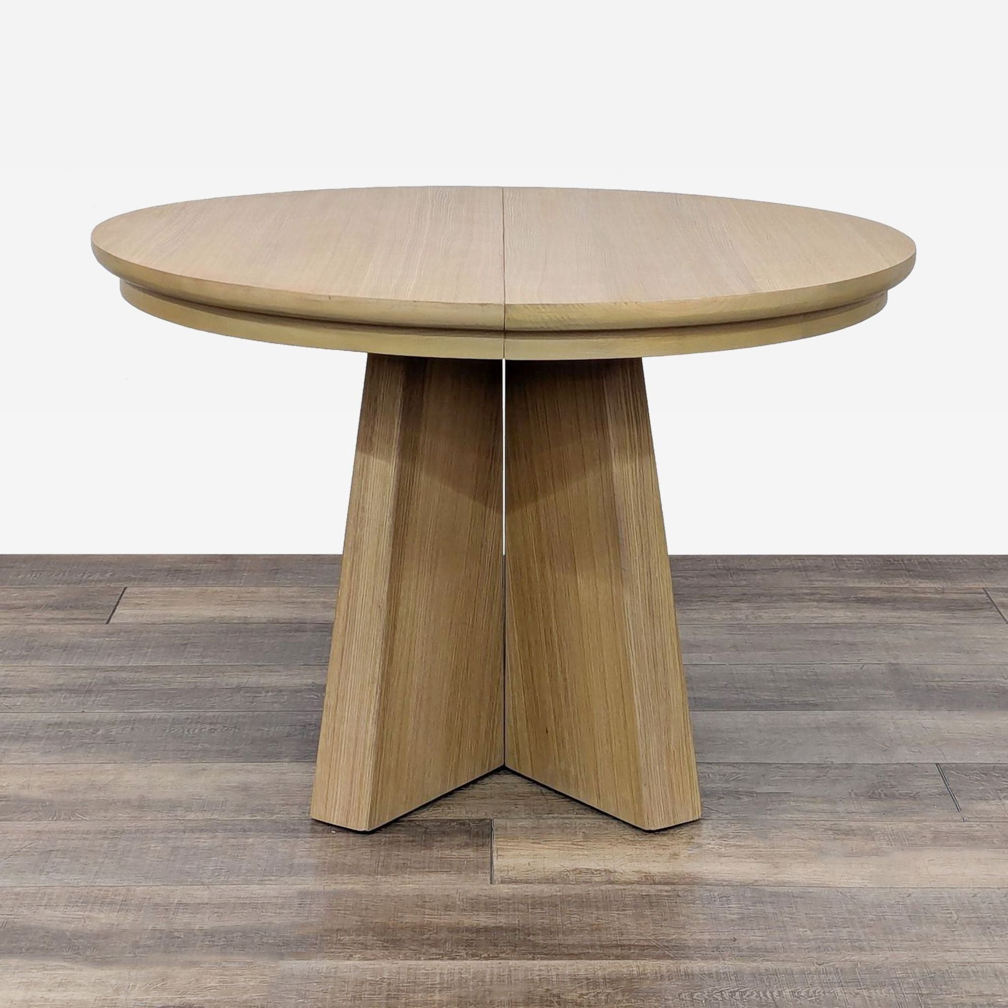 The Nycola extendable dining table by Lily & Georgia transforms from an everyday round top for four to an oval that seatings six. The table's ingenious oak wood design features a cross base pedestal that becomes two angular legs for modern appeal.