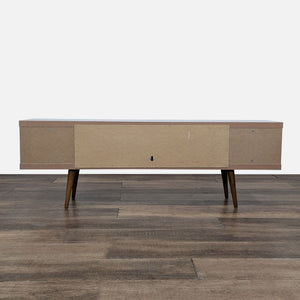 It's built from solid and engineered wood, with splayed, tapered dowel legs
