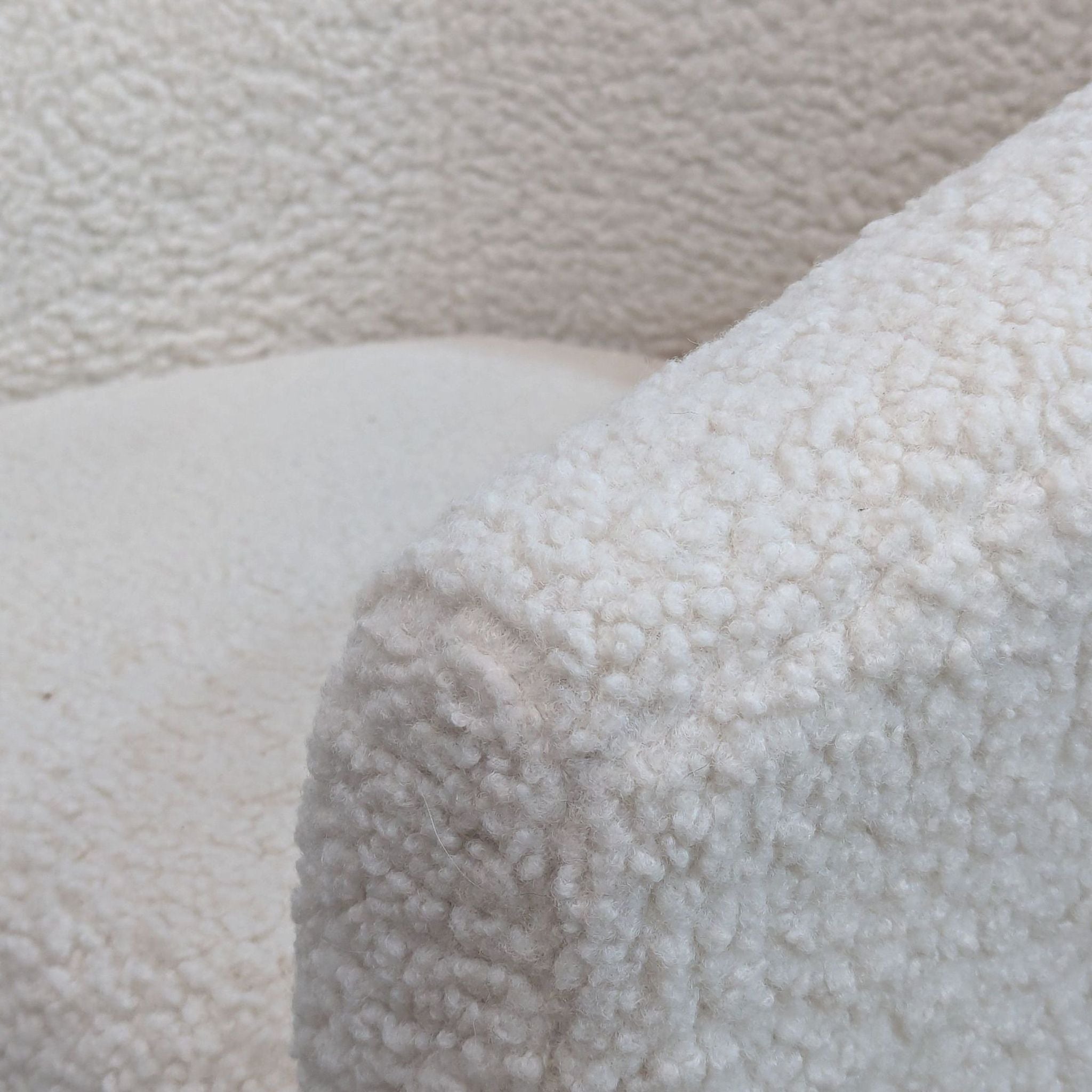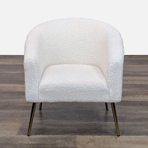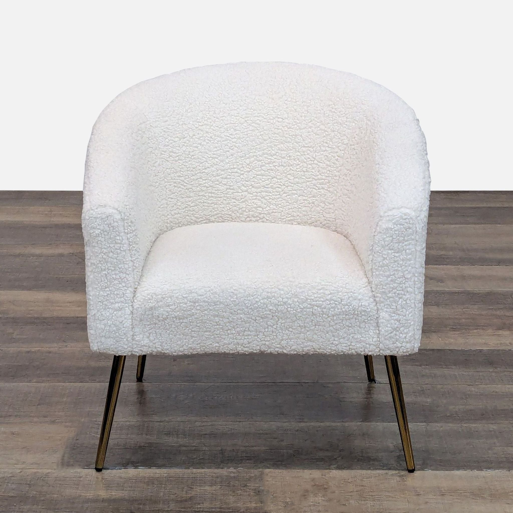 Barrel style armchair upholstered in boucle fabric with metal legs in a gold finish.