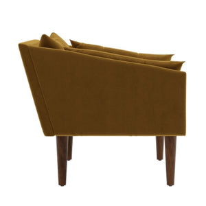 Features sloped arms and plush pillows upholstered in recycled velvet.