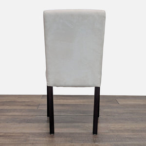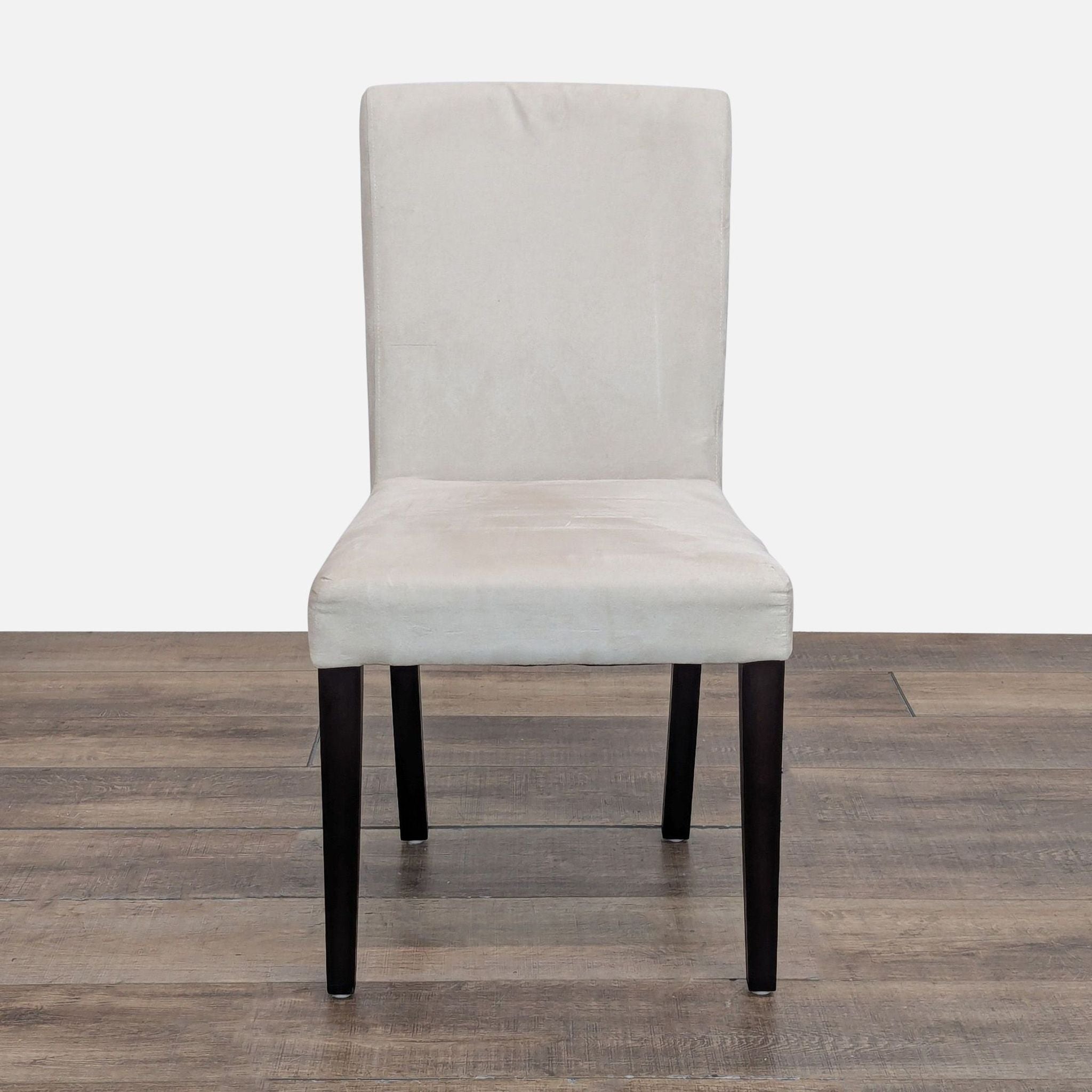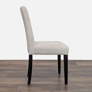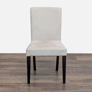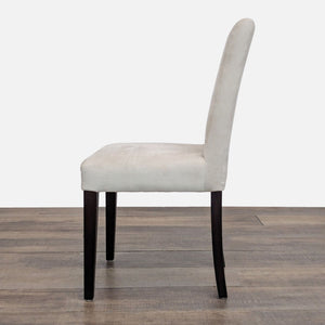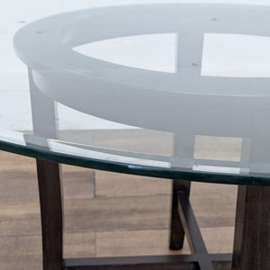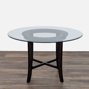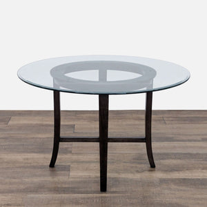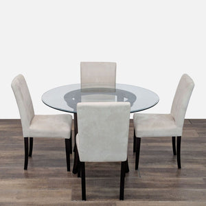 Round glass top dining table with reverse bevel on a wood base with four upholstered Lowe dining chairs.
