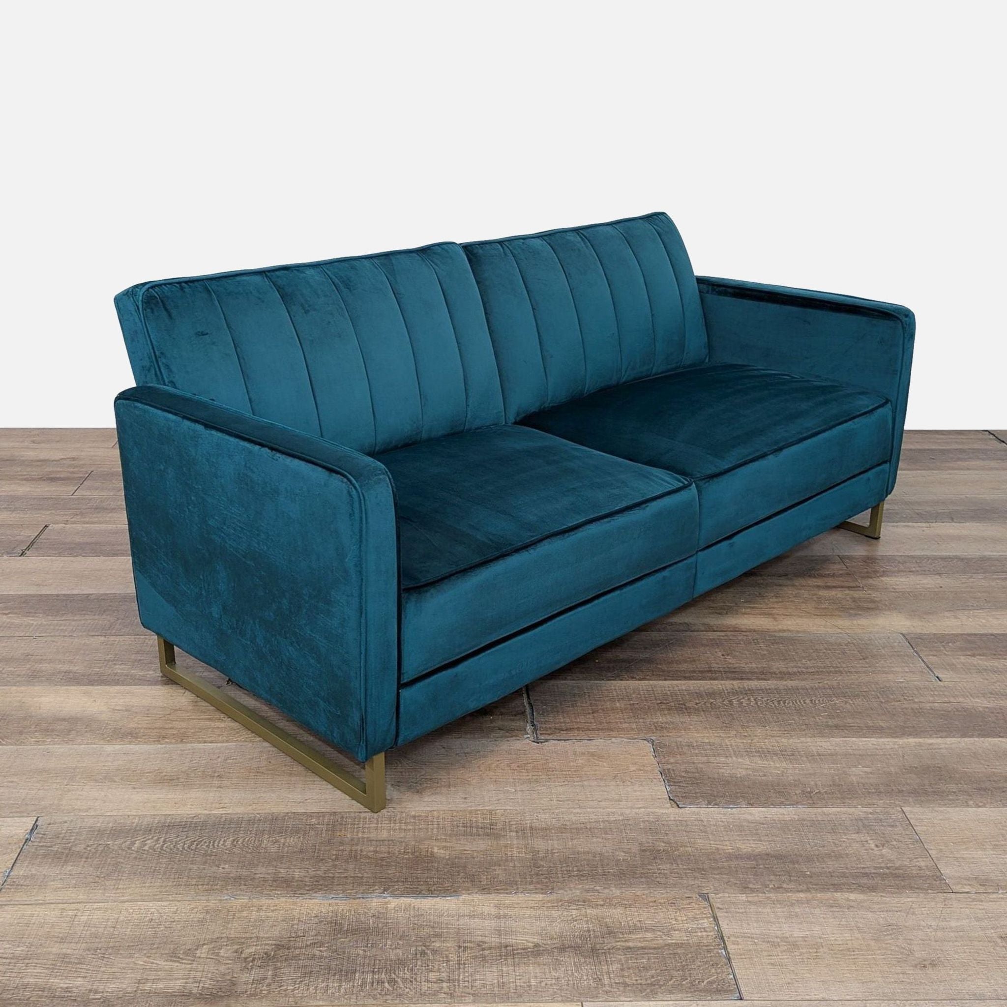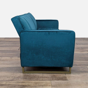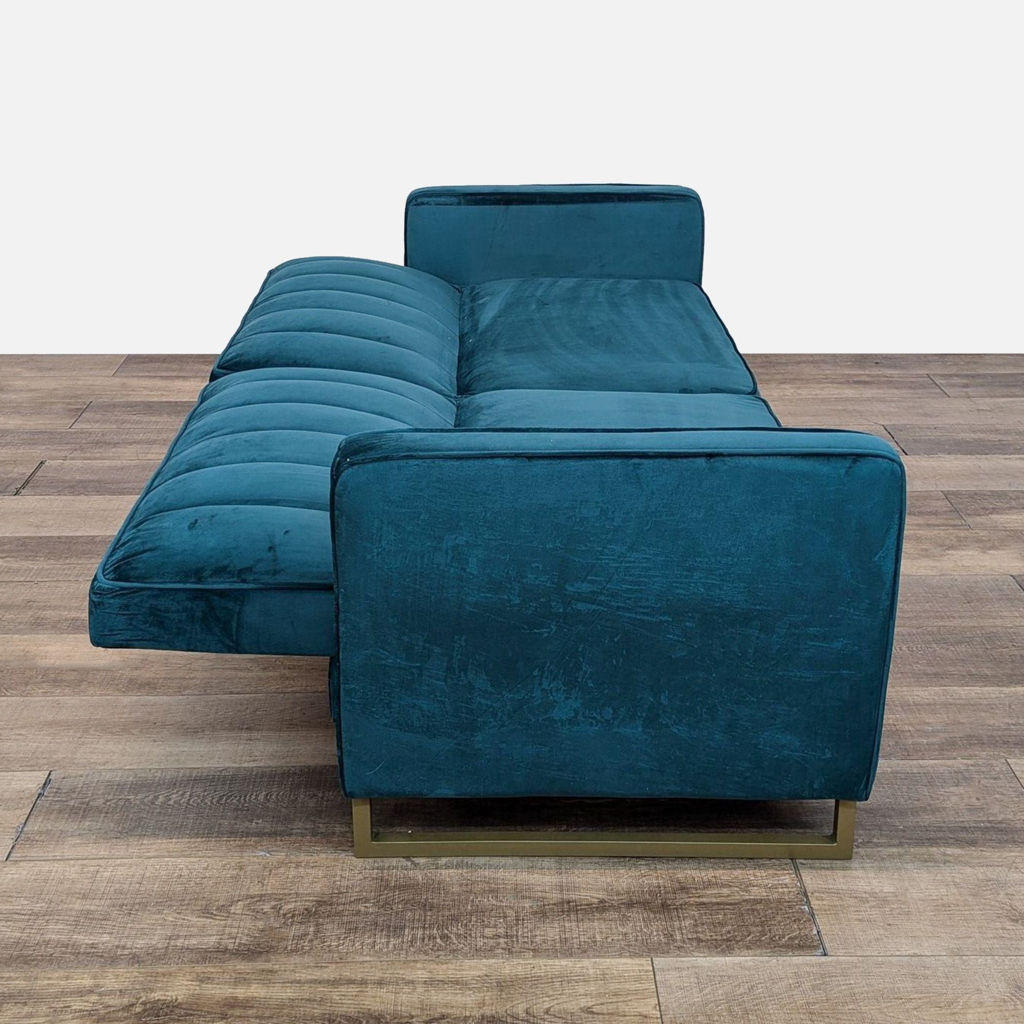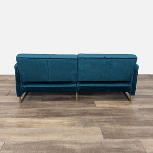 The Skylar Sofa Bed has velvet upholstery with a ribbed tufted and gold sleigh legs. The back lays back to transform the sofa into a sleeper.
