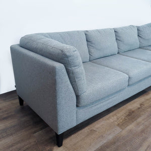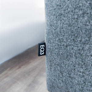 This sofa by EQ3 features fabric upholstery, tapered legs and fixed plush cushions.