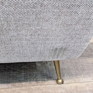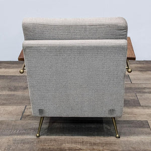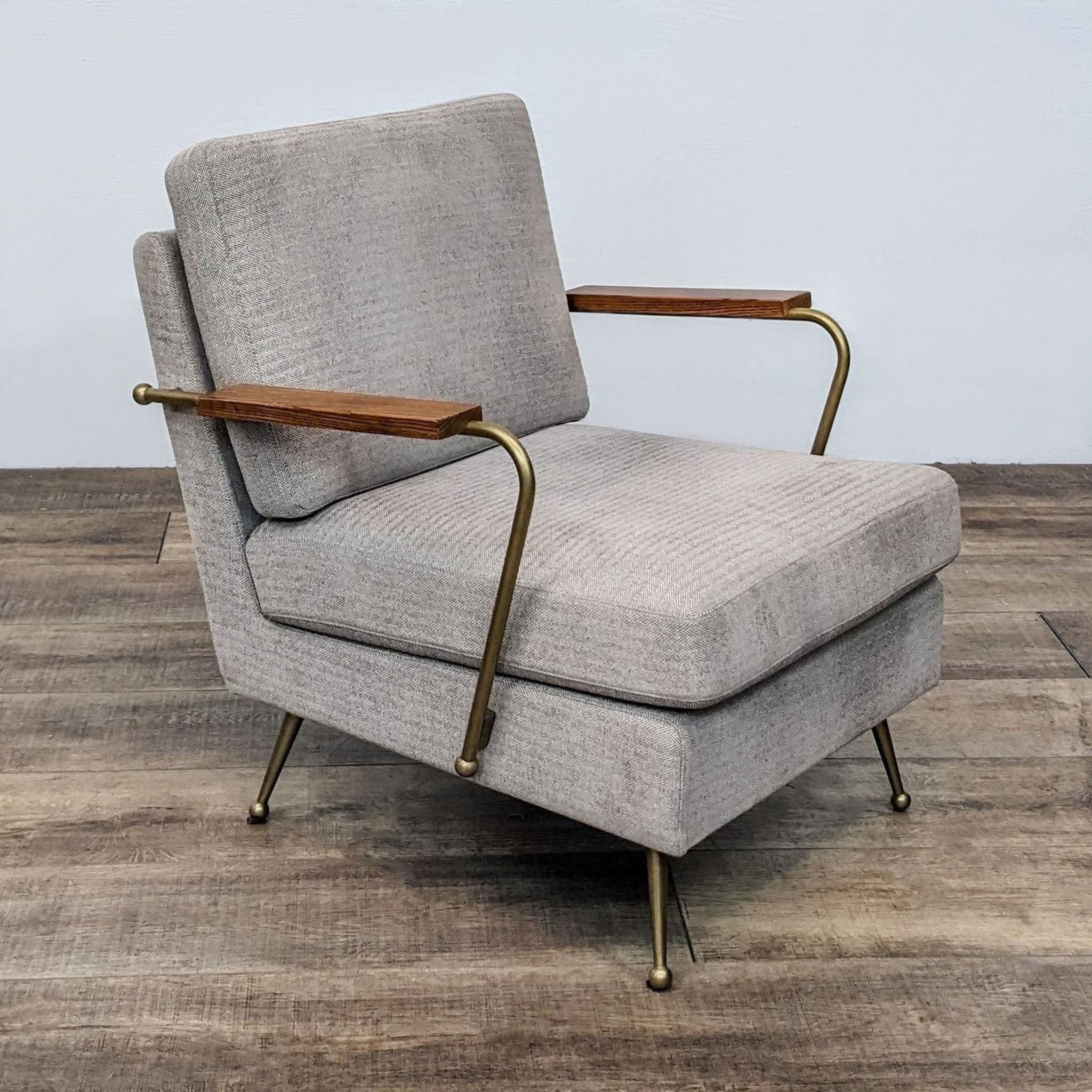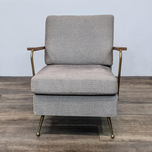 This accent chair by MXM is a sleek modern accent chair covered in soft textured woven fabric contrasted by a brass frame with walnut finished wood arms. boasts modern style with metal legs and arms in a brass finish with wood armrests. The upholstered seat