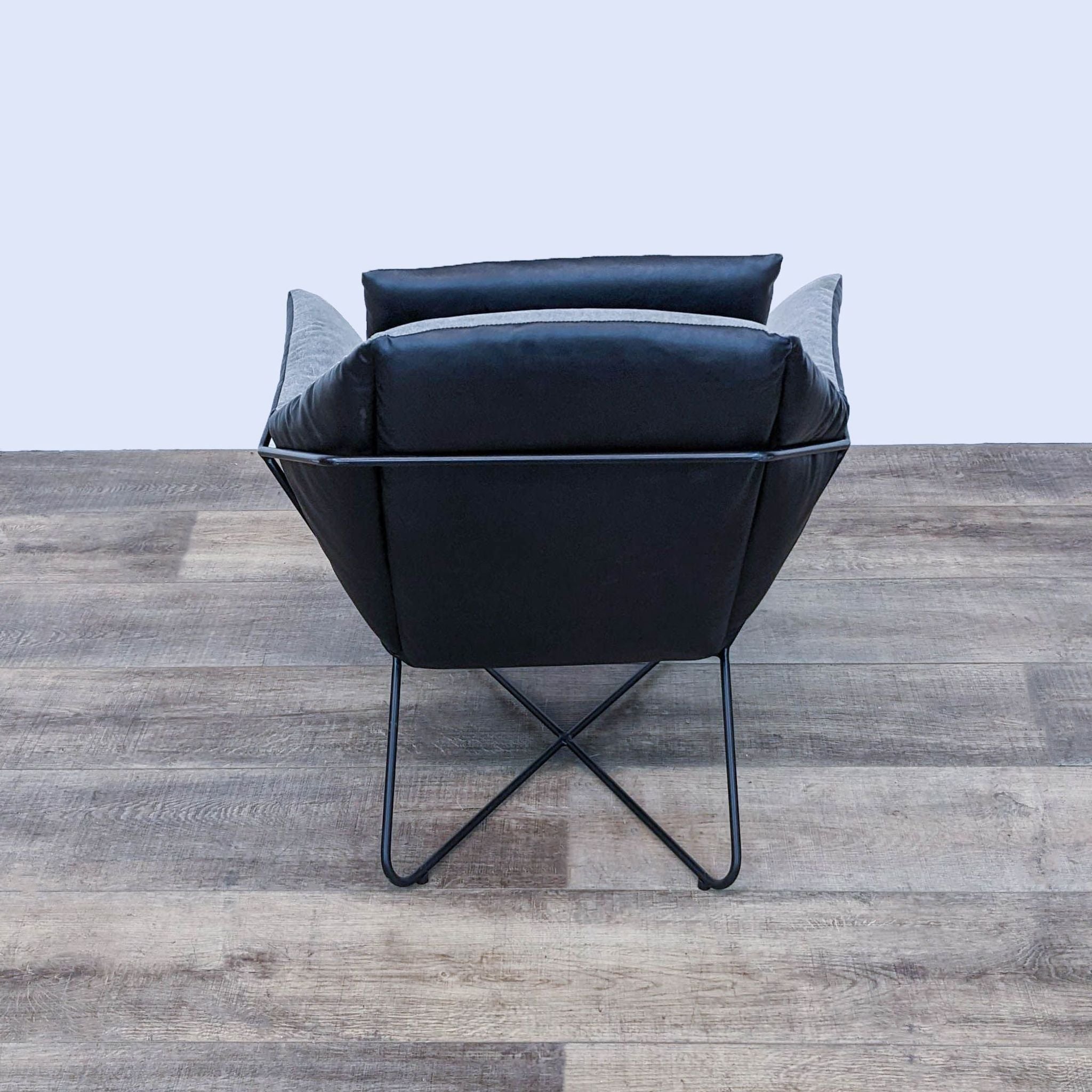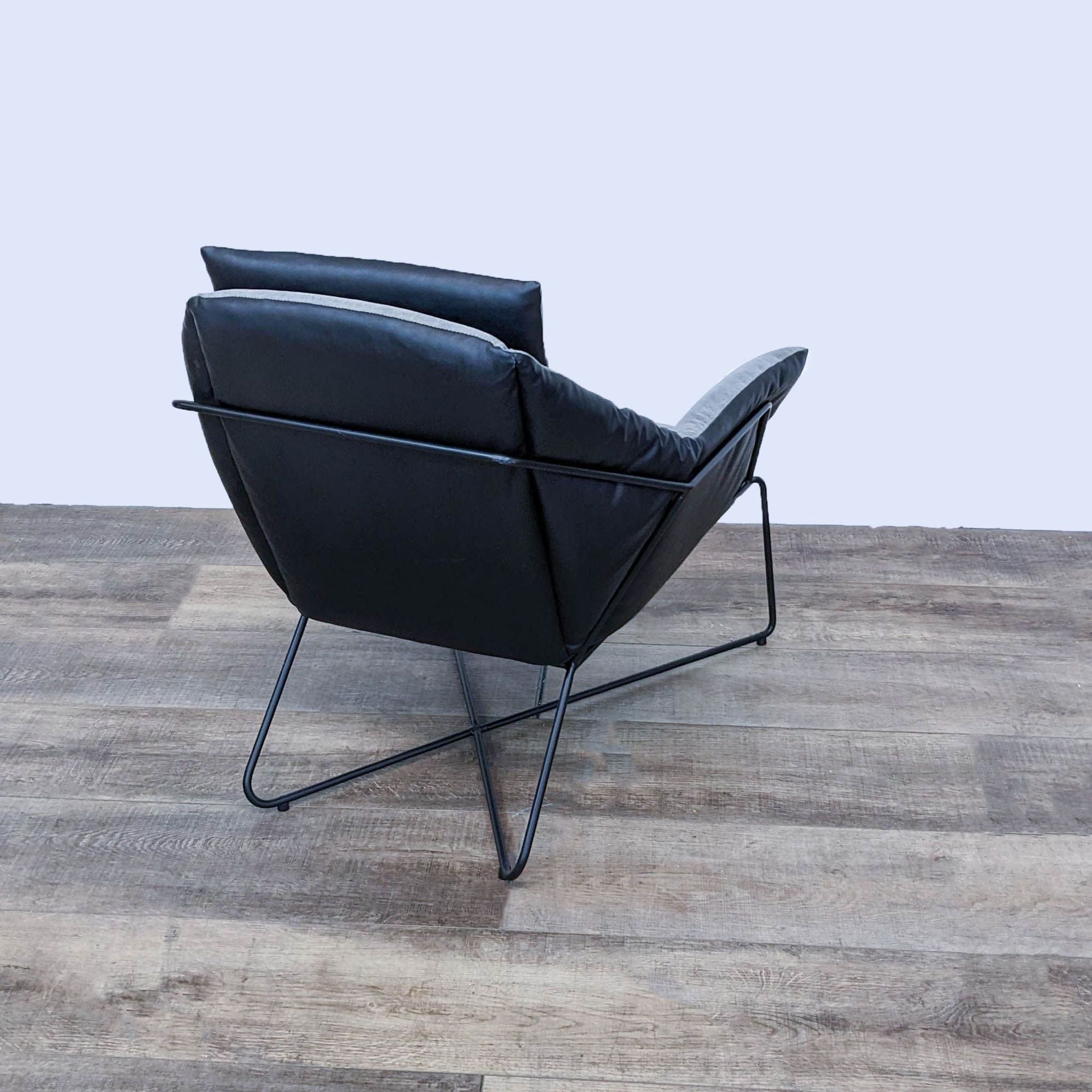 This modern lounge chair has a tubular metal frame and soft upholstered seat that leans slightly back for maximum comfort.