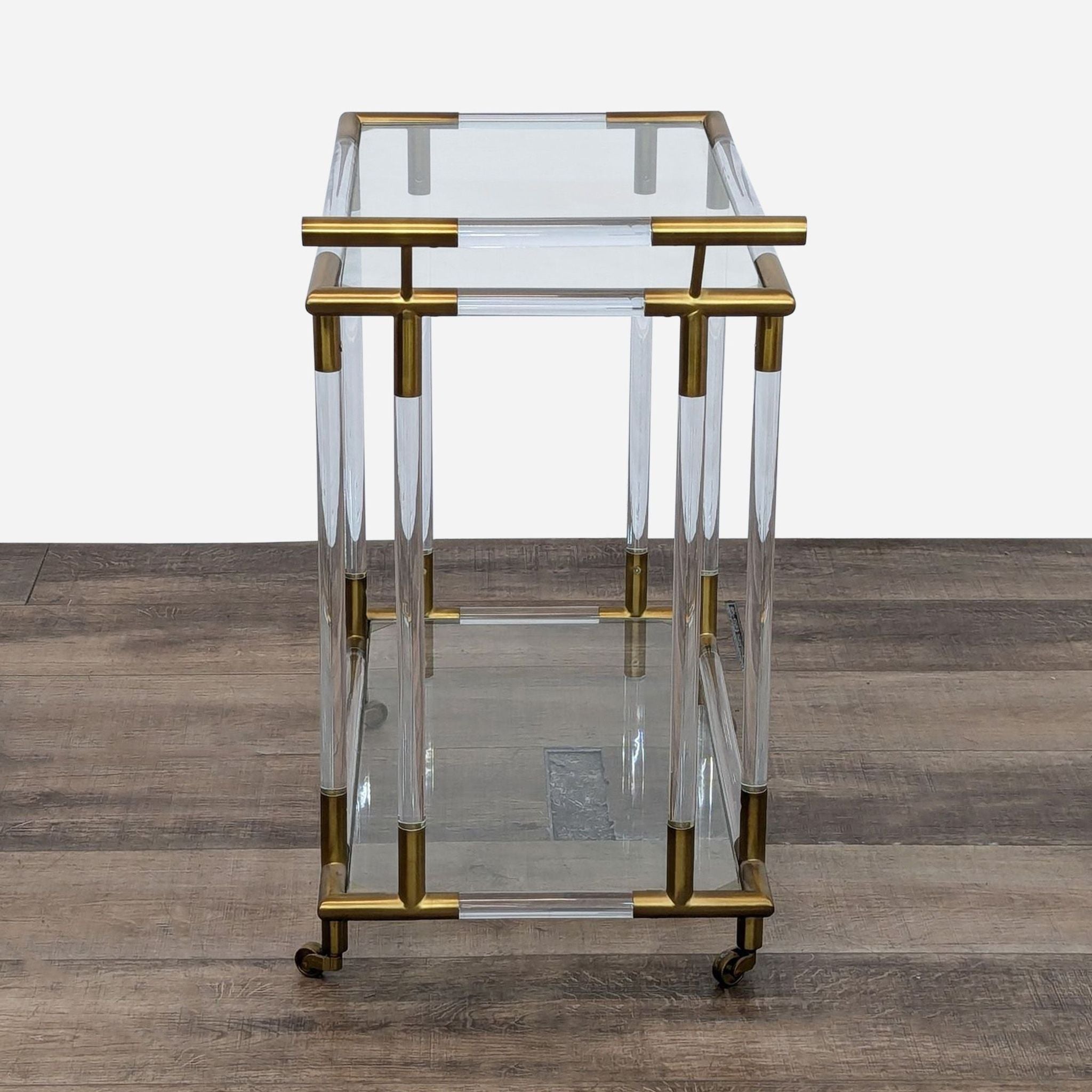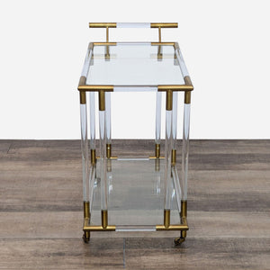 The Lucite and gleaming cast brass of this bar cart are meant to catch the light, drawing all eyes to the clean lines of this Deco-inspired piece.