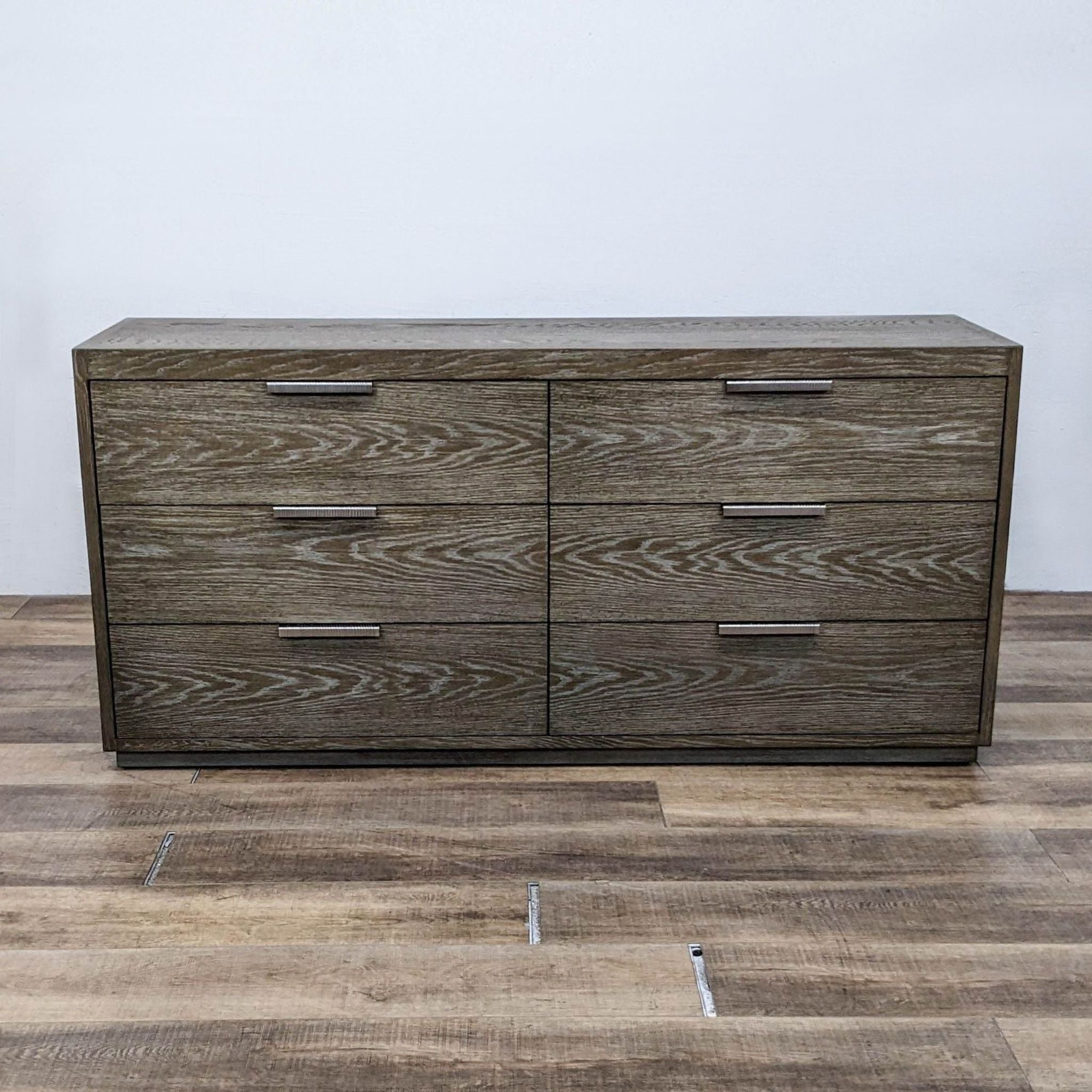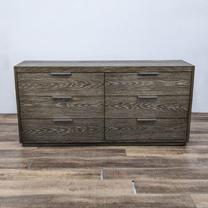 The Modern Astor Dresser from Bassett Furniture is a solid oak six drawer dresser with soft close drawers, metallic metal pulls and finished in Normandy Grey.