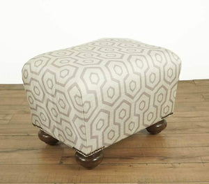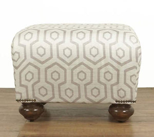 Rests on bun form legs. Upholstery is a silk blend keyhole pattern