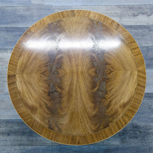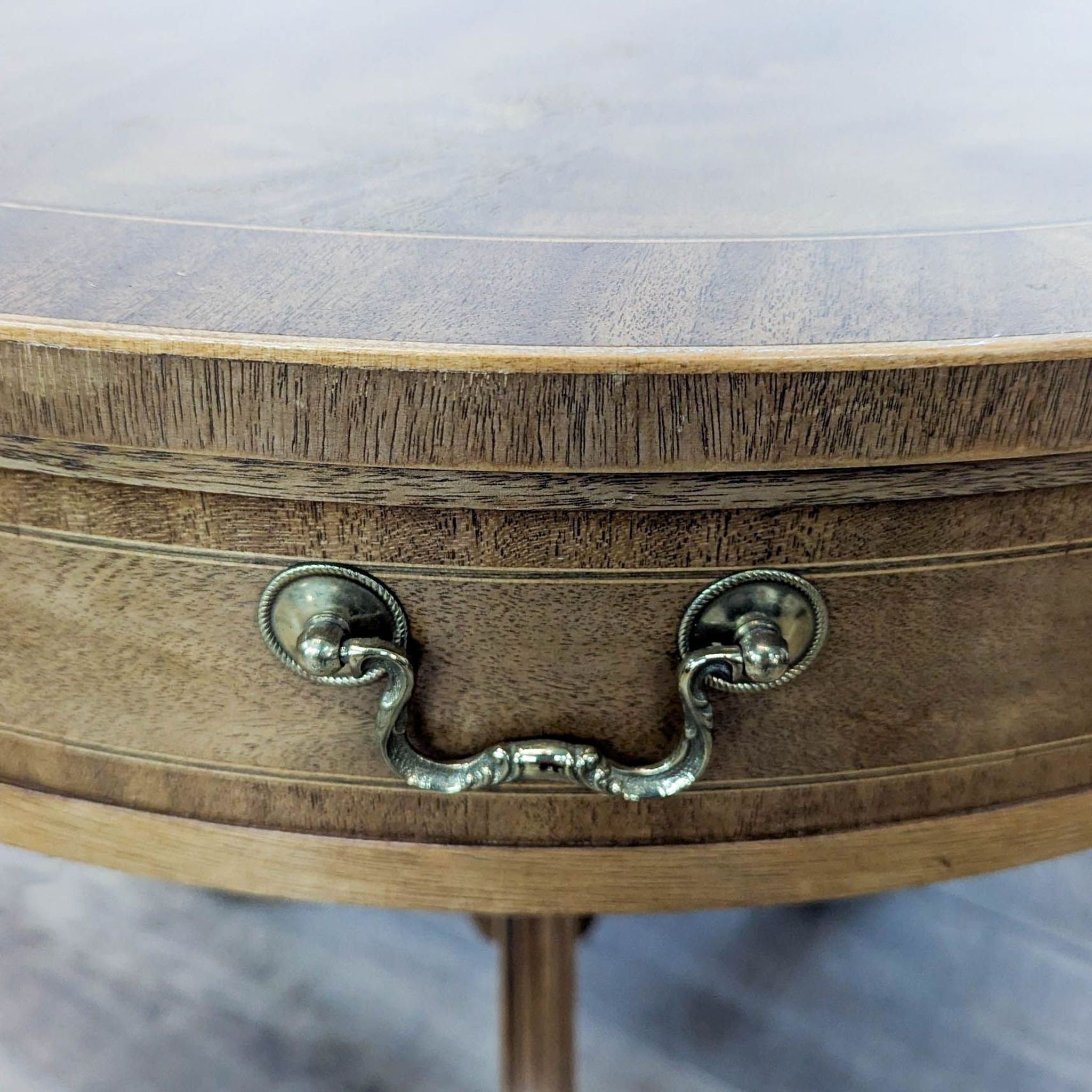 The table has two drawers with foliate brass pulls, and several other faux drawers just under the tabletop. It has a vase-turned stem and stands on three splayed legs, capped with brass feet. Burled and inlaid top and drawers.