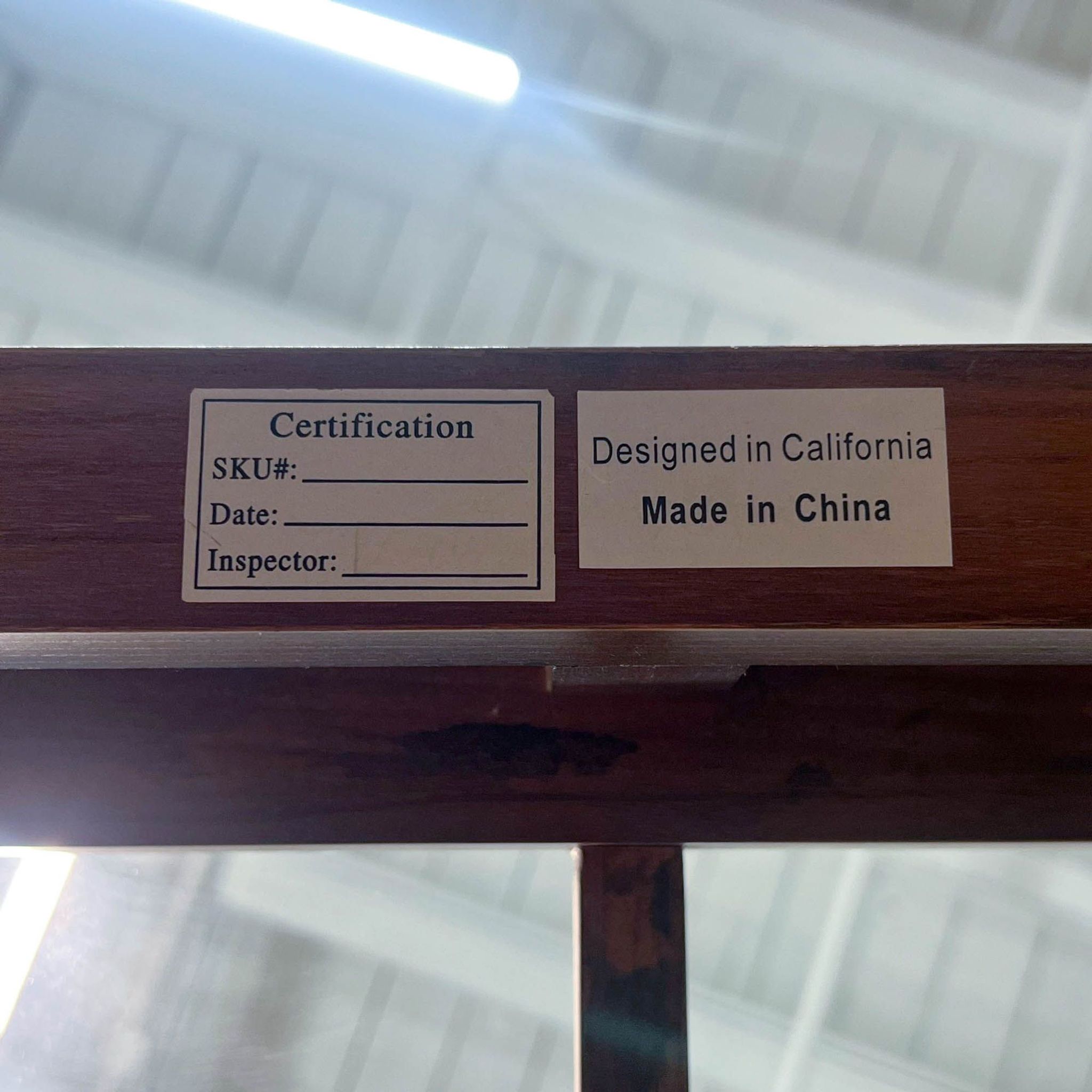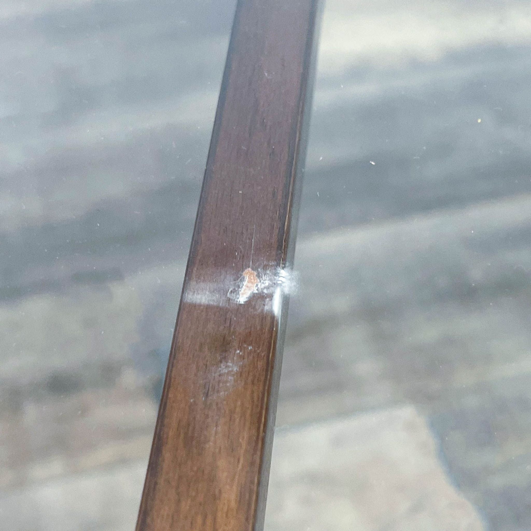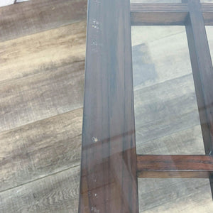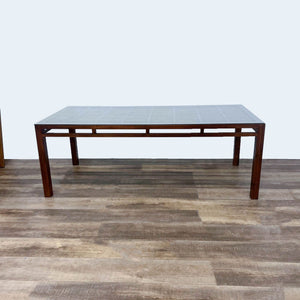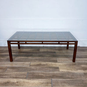 This wood framed rectangle dining features an elongated rectangular pierced apron and repeating geometric rectangular motif on top supporting a tempered glass top.