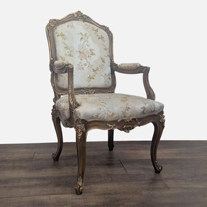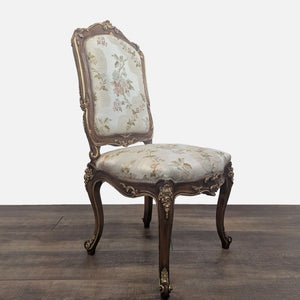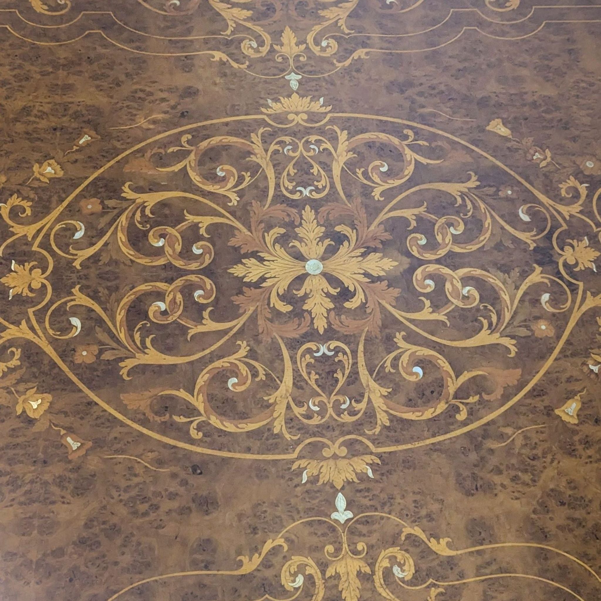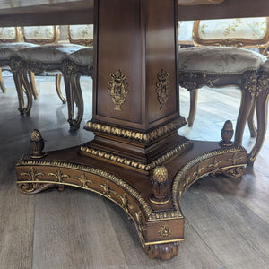 This exquisite 15-piece custom Italian made dining set includes a stunning oval table and intricately designed chairs. The table features a beautiful inlaid wood pattern, while the chairs are upholstered in a delicate floral fabric.