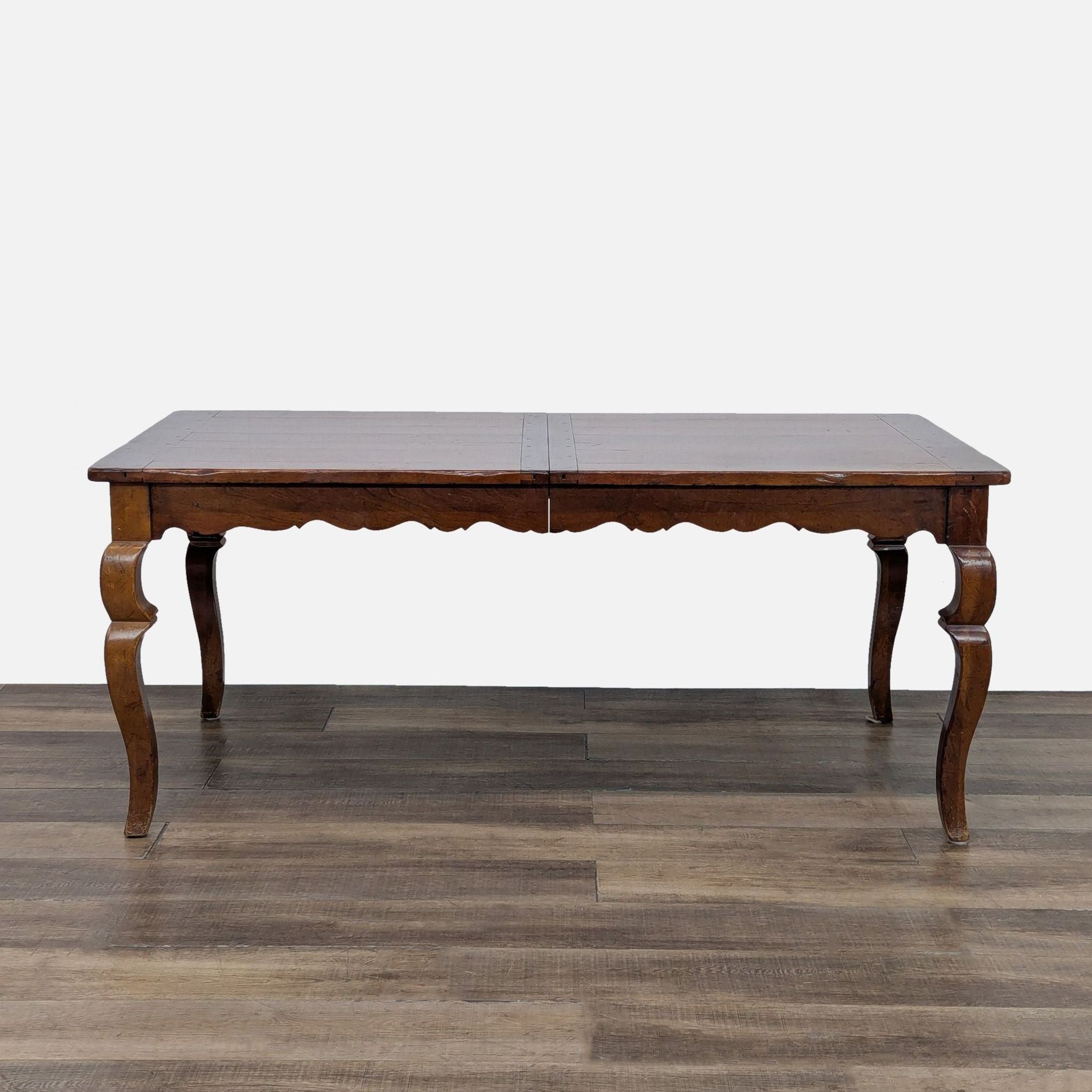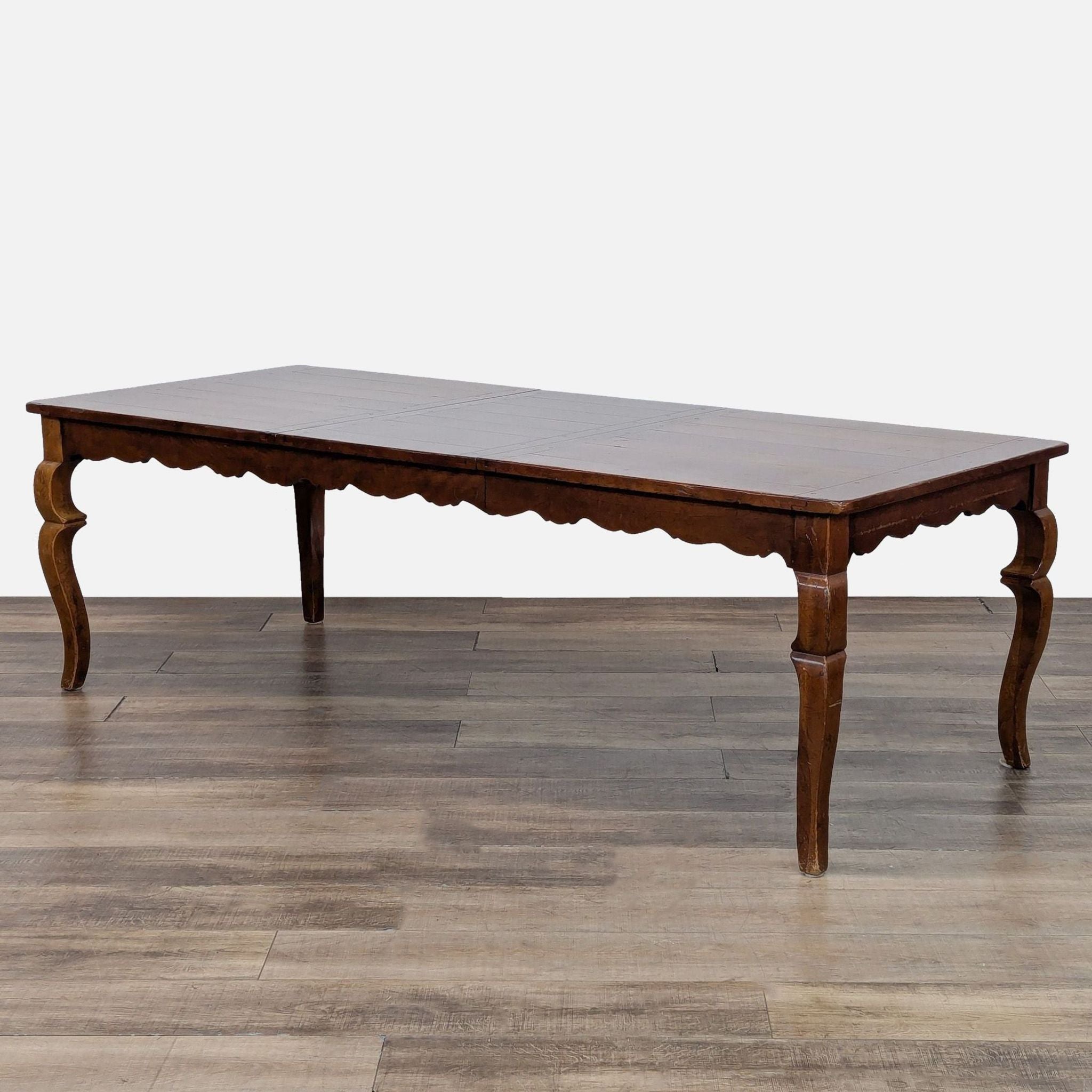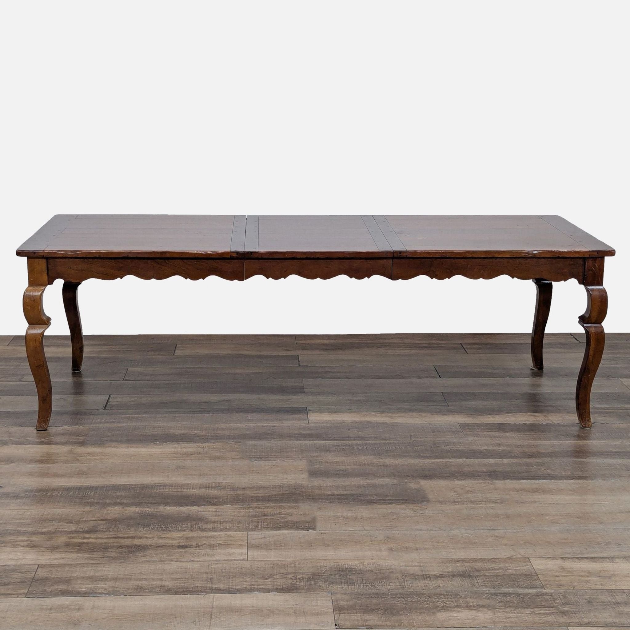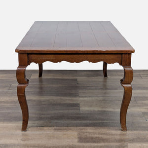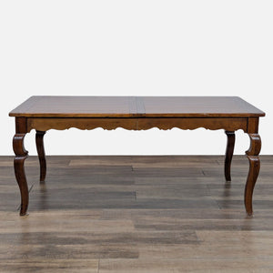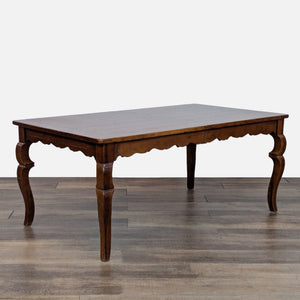 Breadboard top table with dried apple antiquing and a scalloped apron. The table rests on double curved cabriole legs. It is 72 inches without the leaf and 96 inches when the leaf is included.