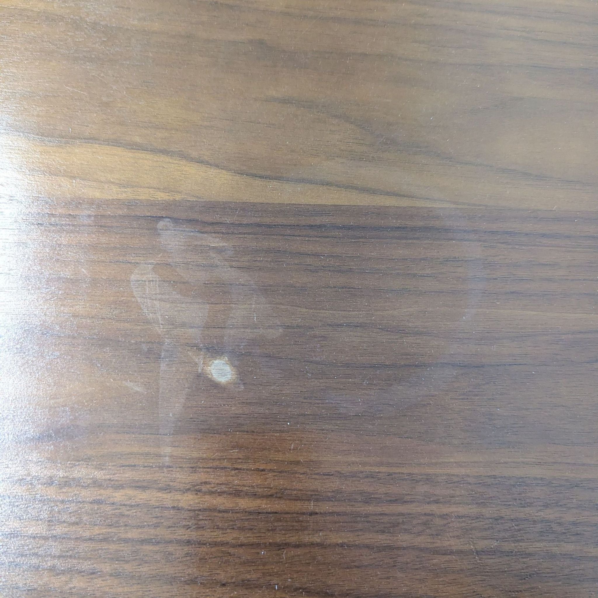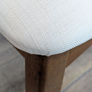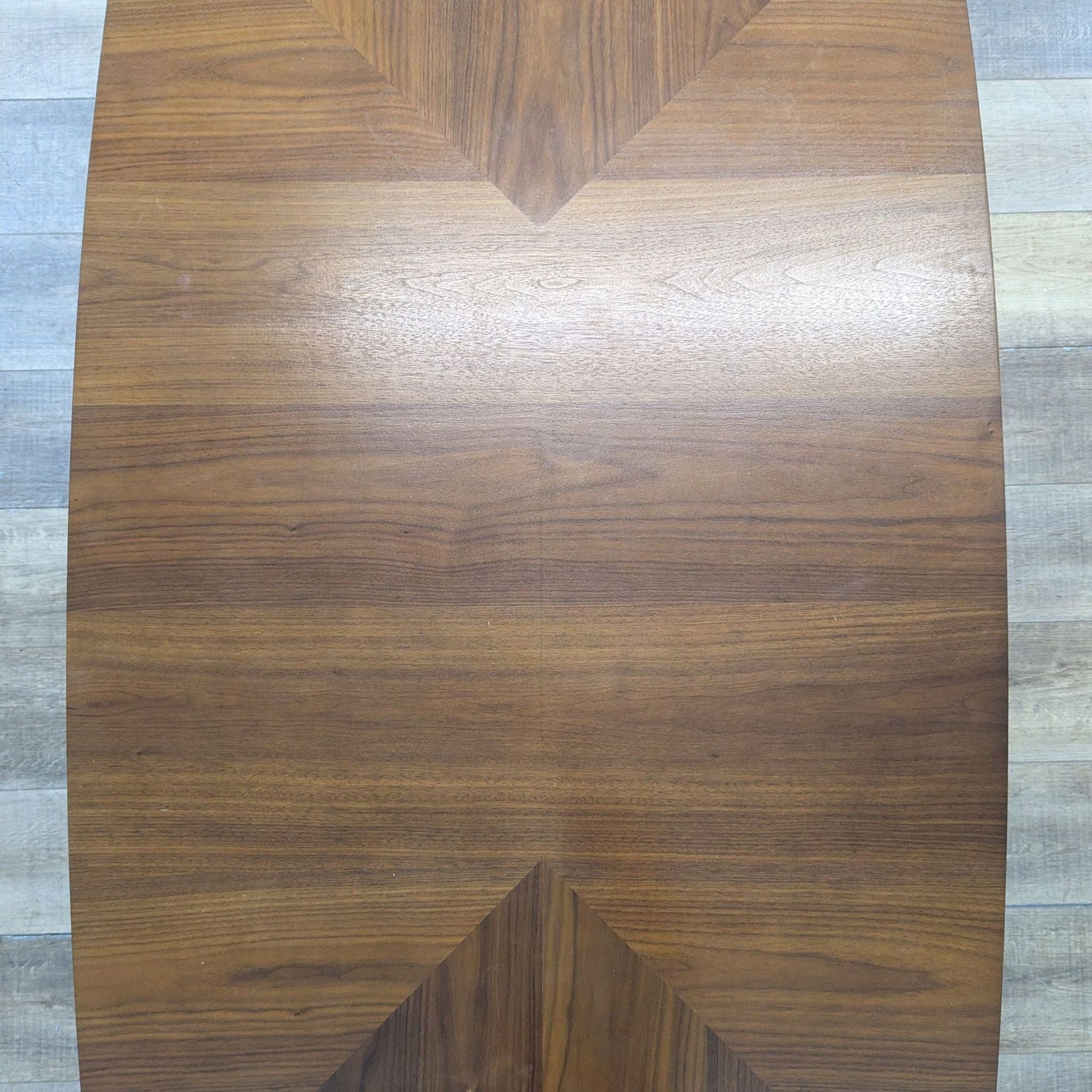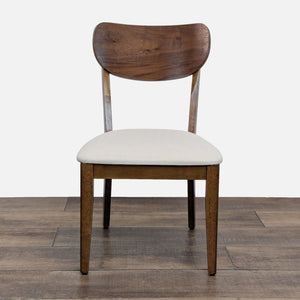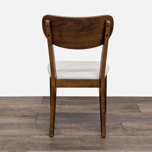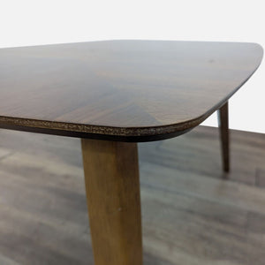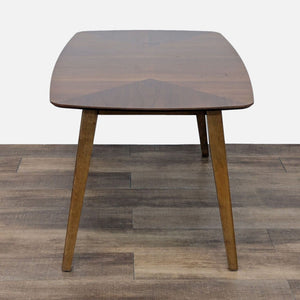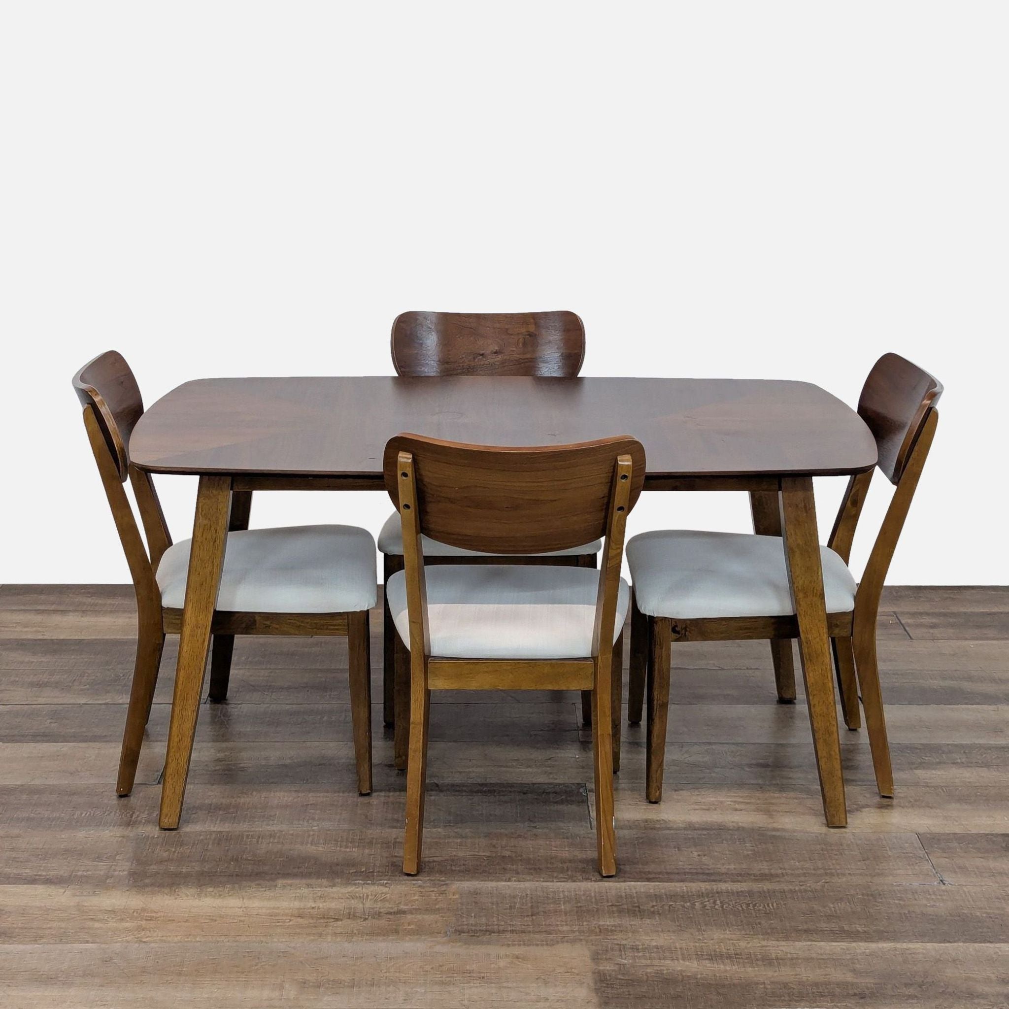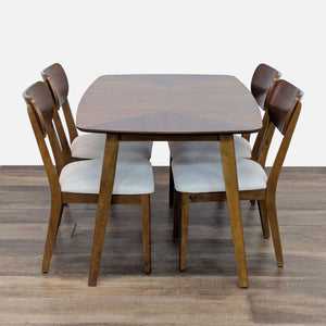 Mid-century modern dining set featuring a sleek wooden table and four matching chairs with comfortable cushioned seats.