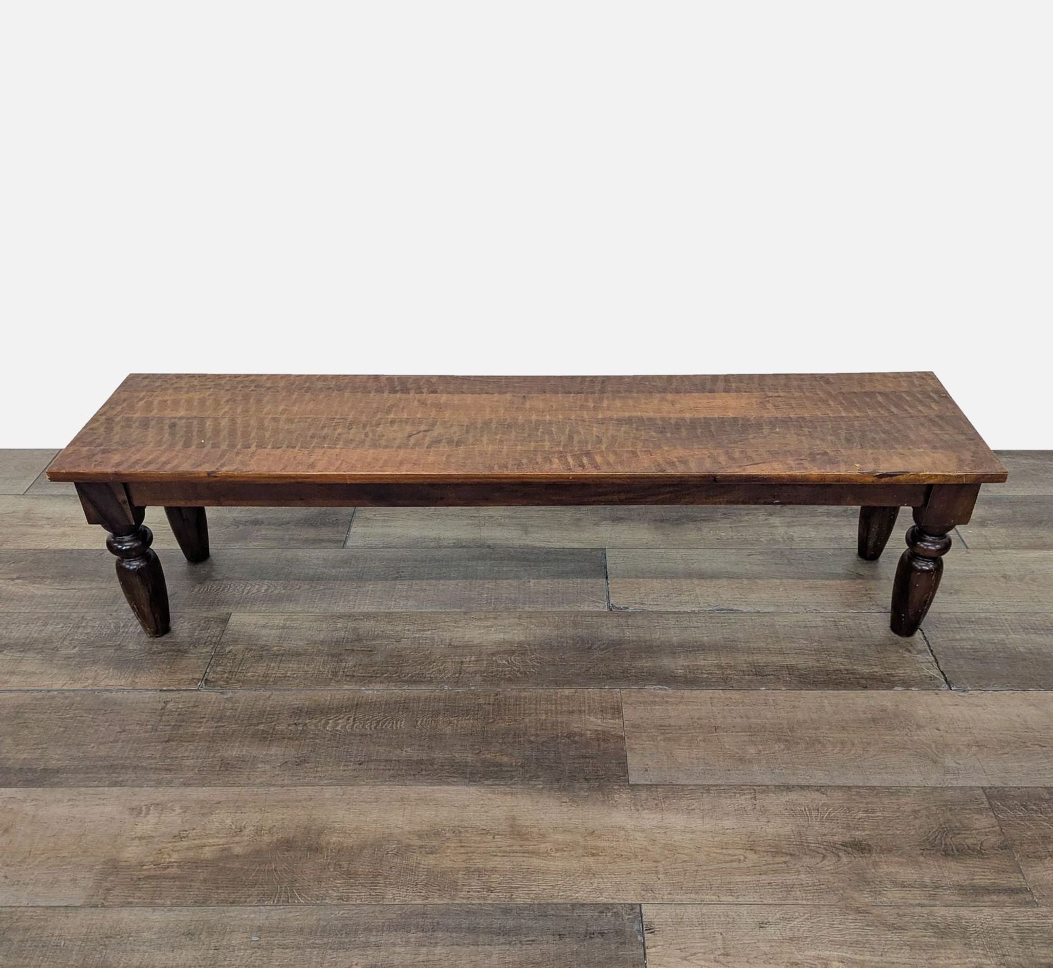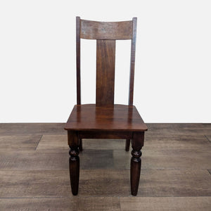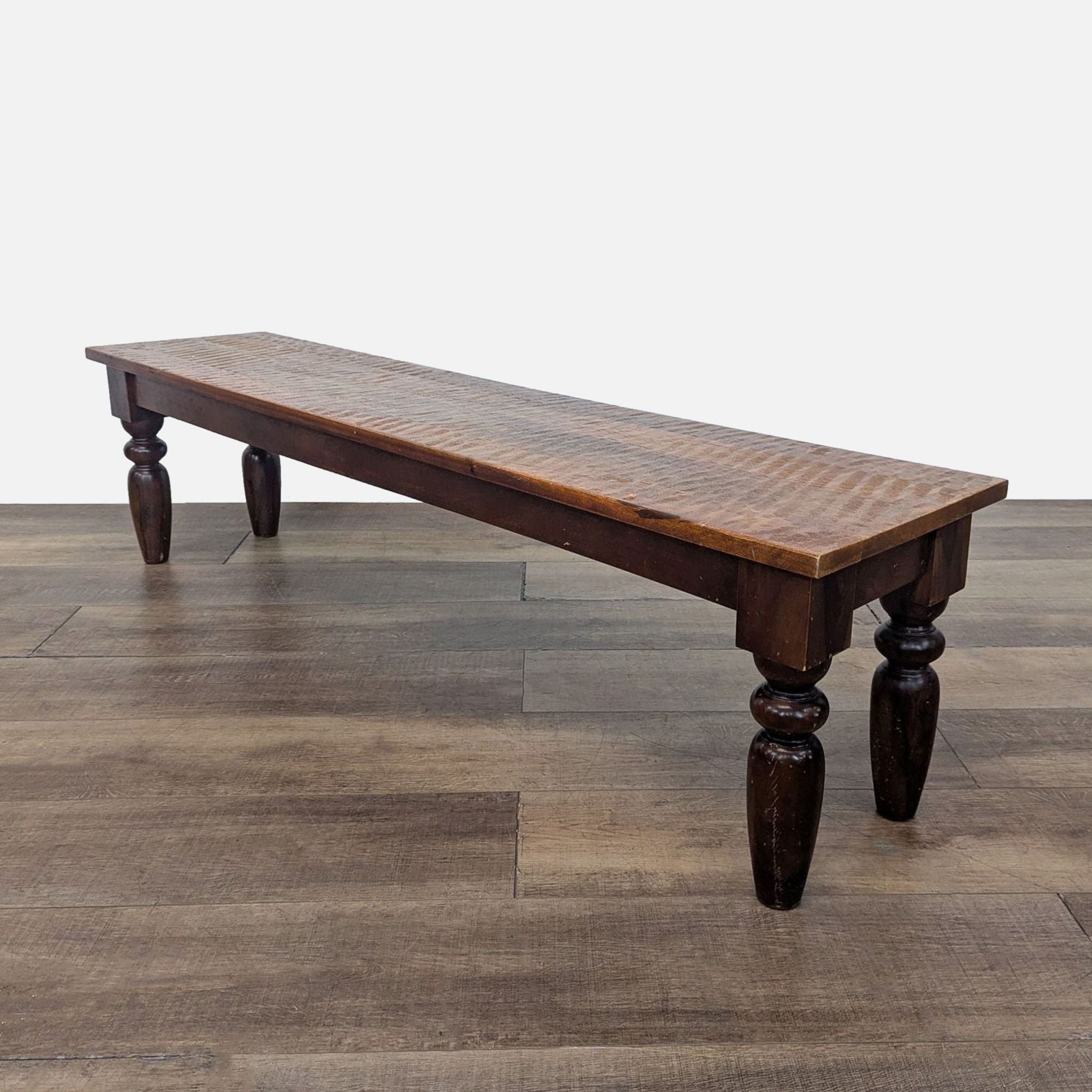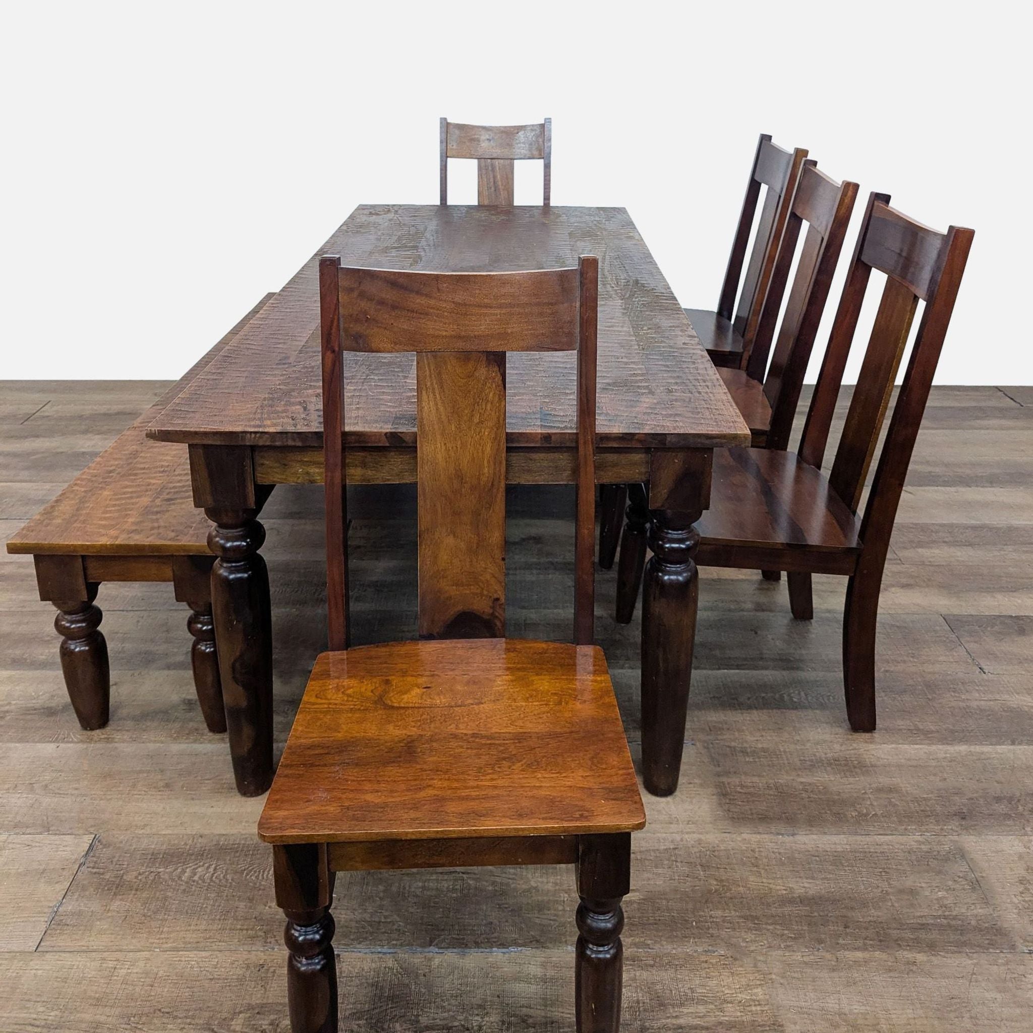 This set features a solid wood dining table with turned legs, matching bench and 5 dining chairs.
