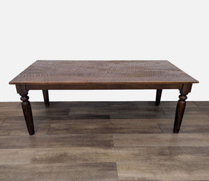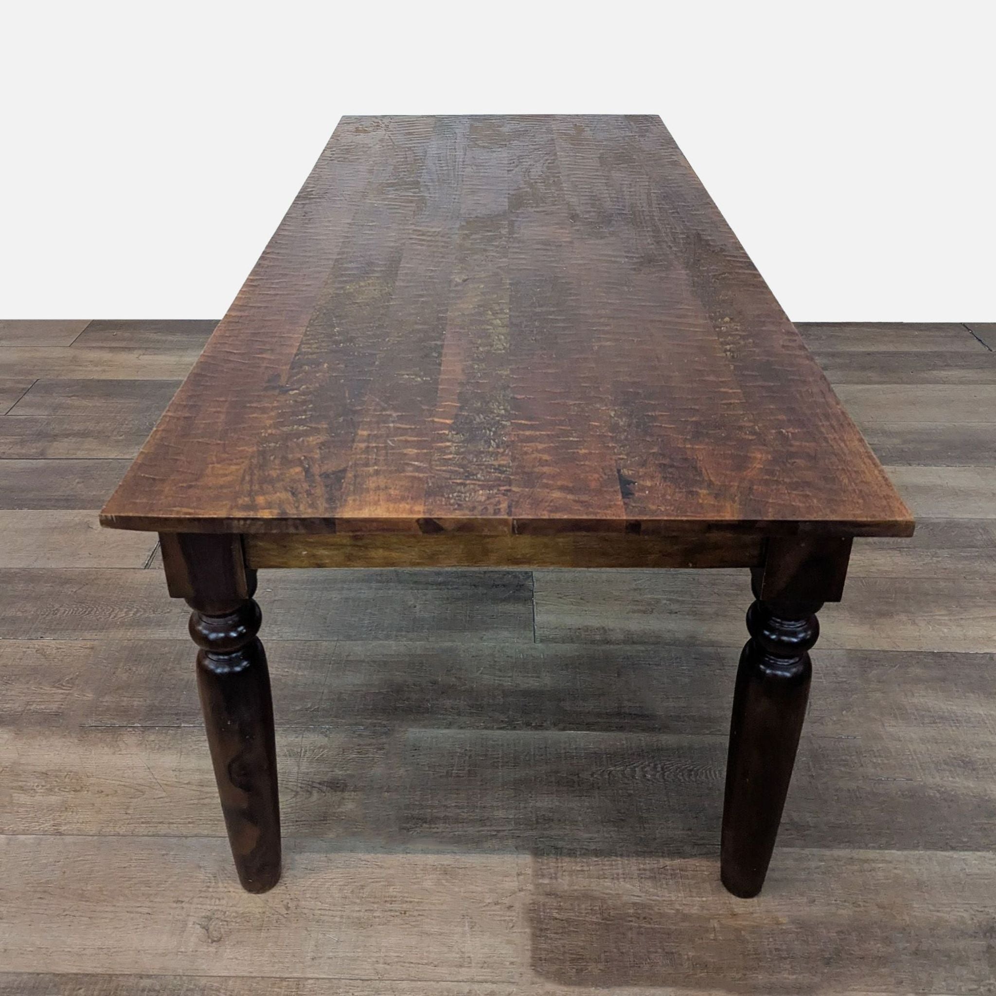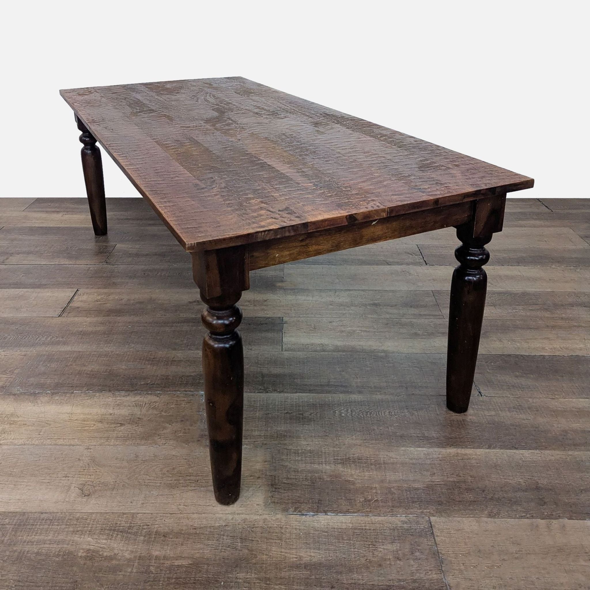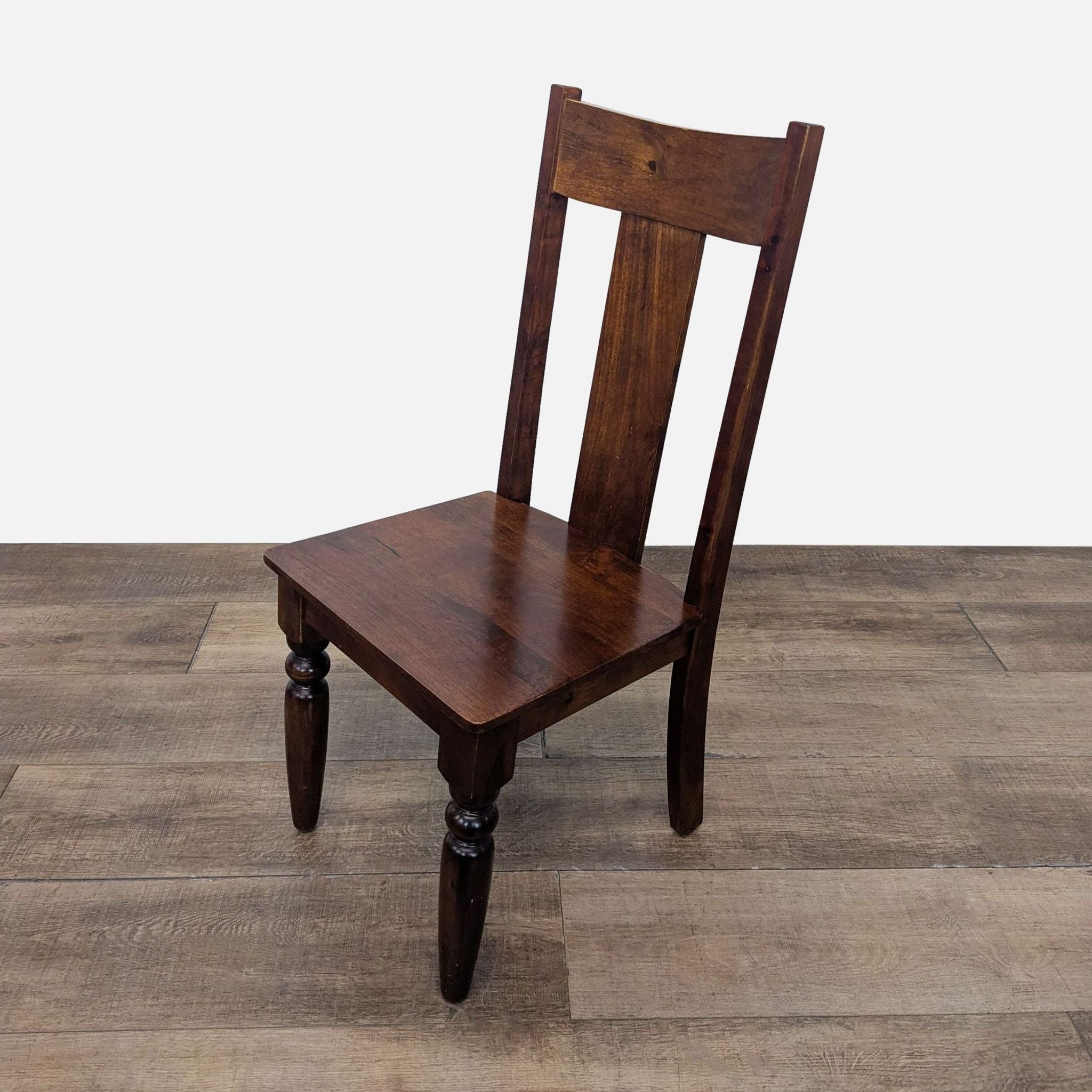 This set features a solid wood dining table with turned legs, matching bench and 5 dining chairs.