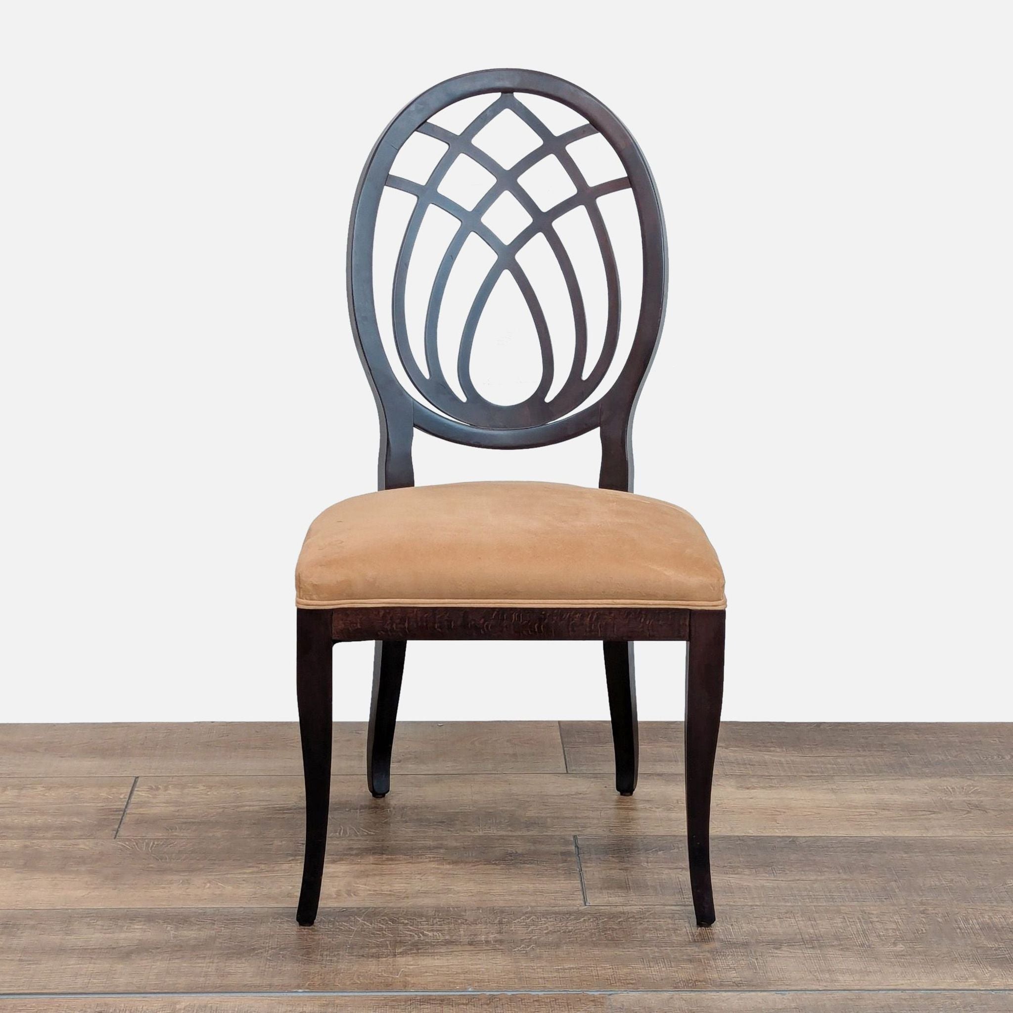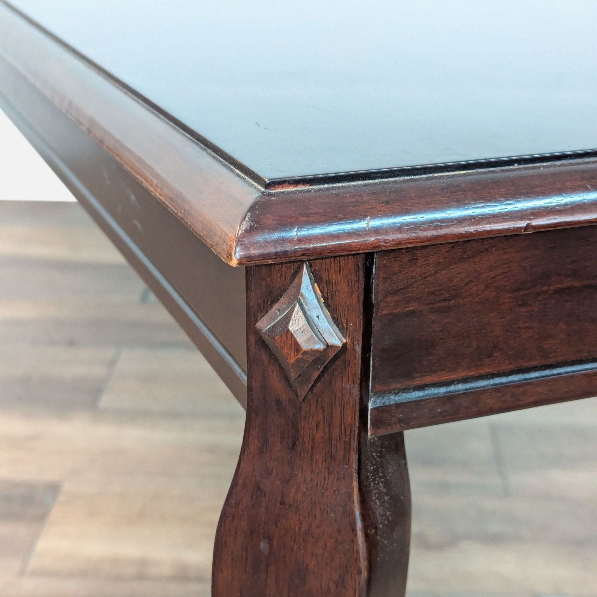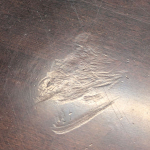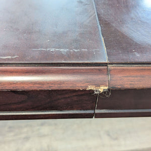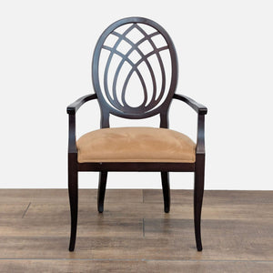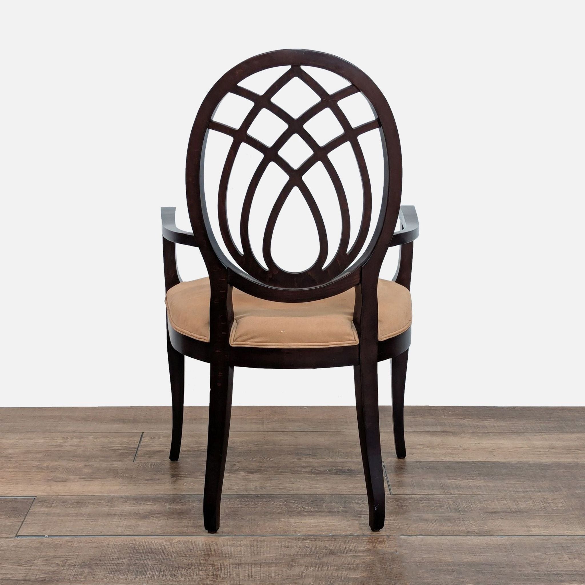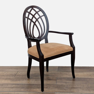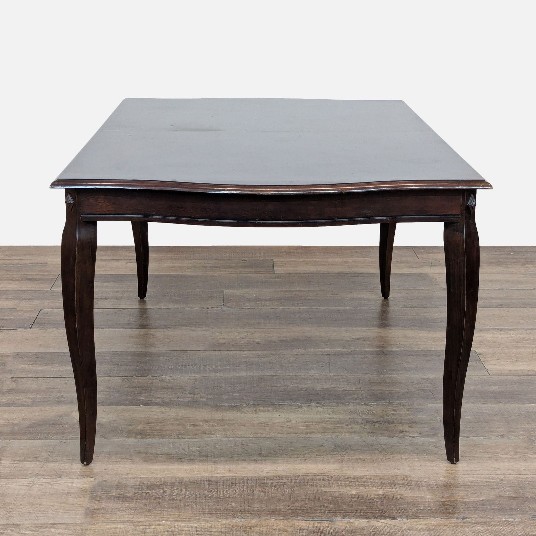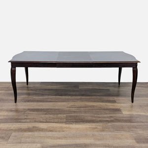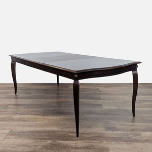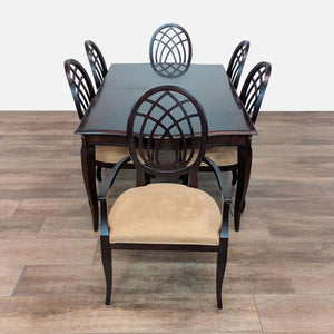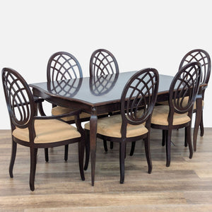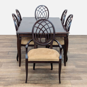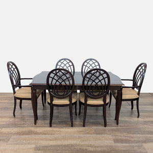 Extendable mahogany dining table with two armchairs and four side chairs with upholstered seats.