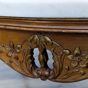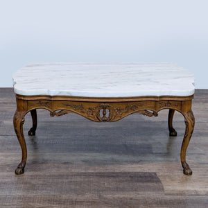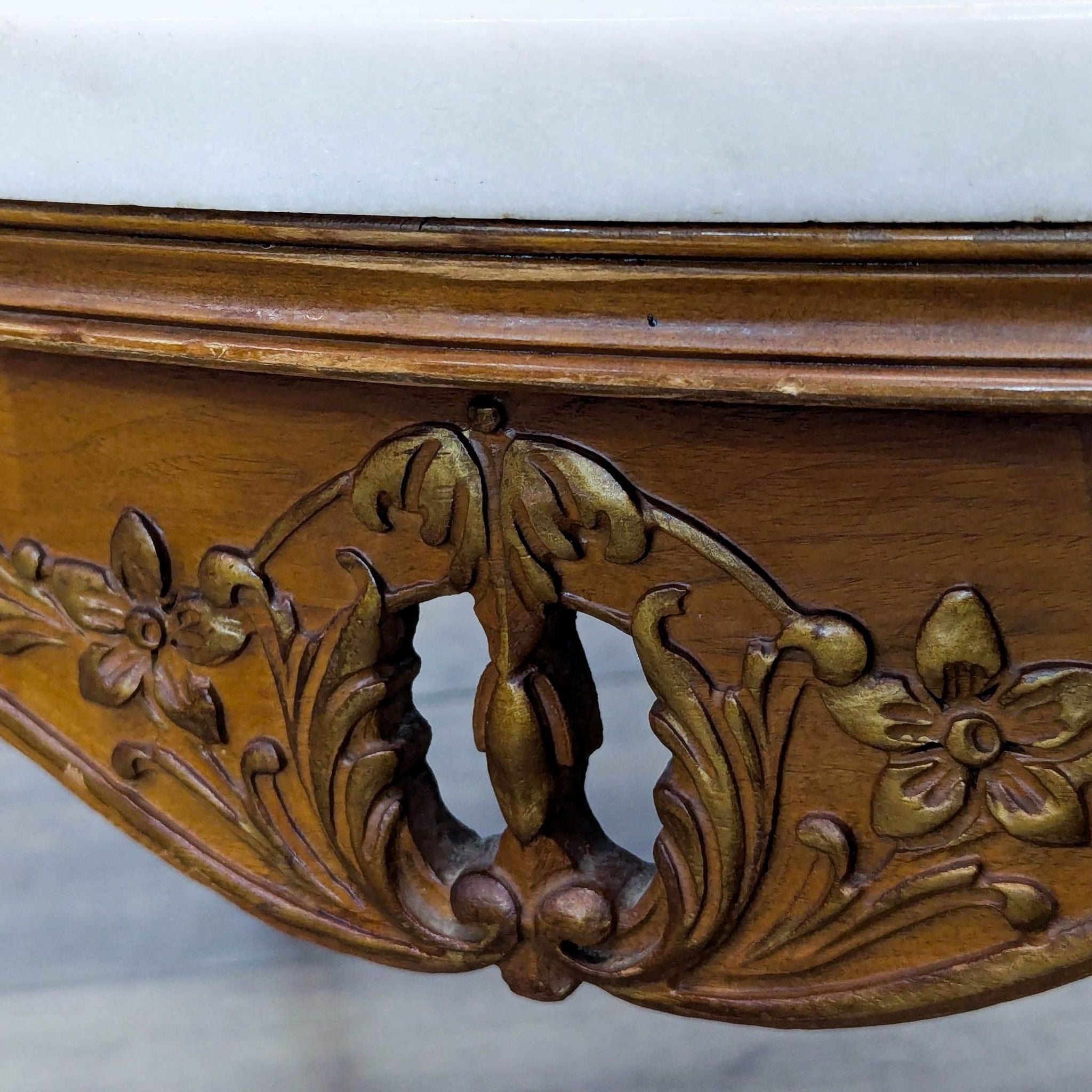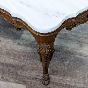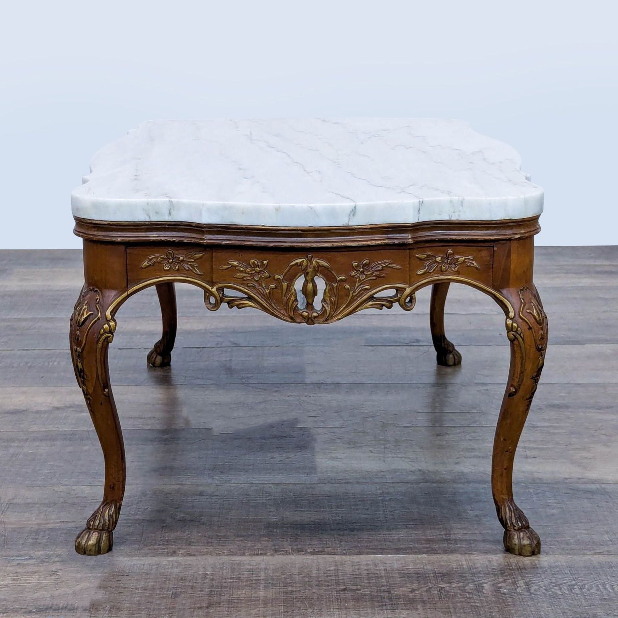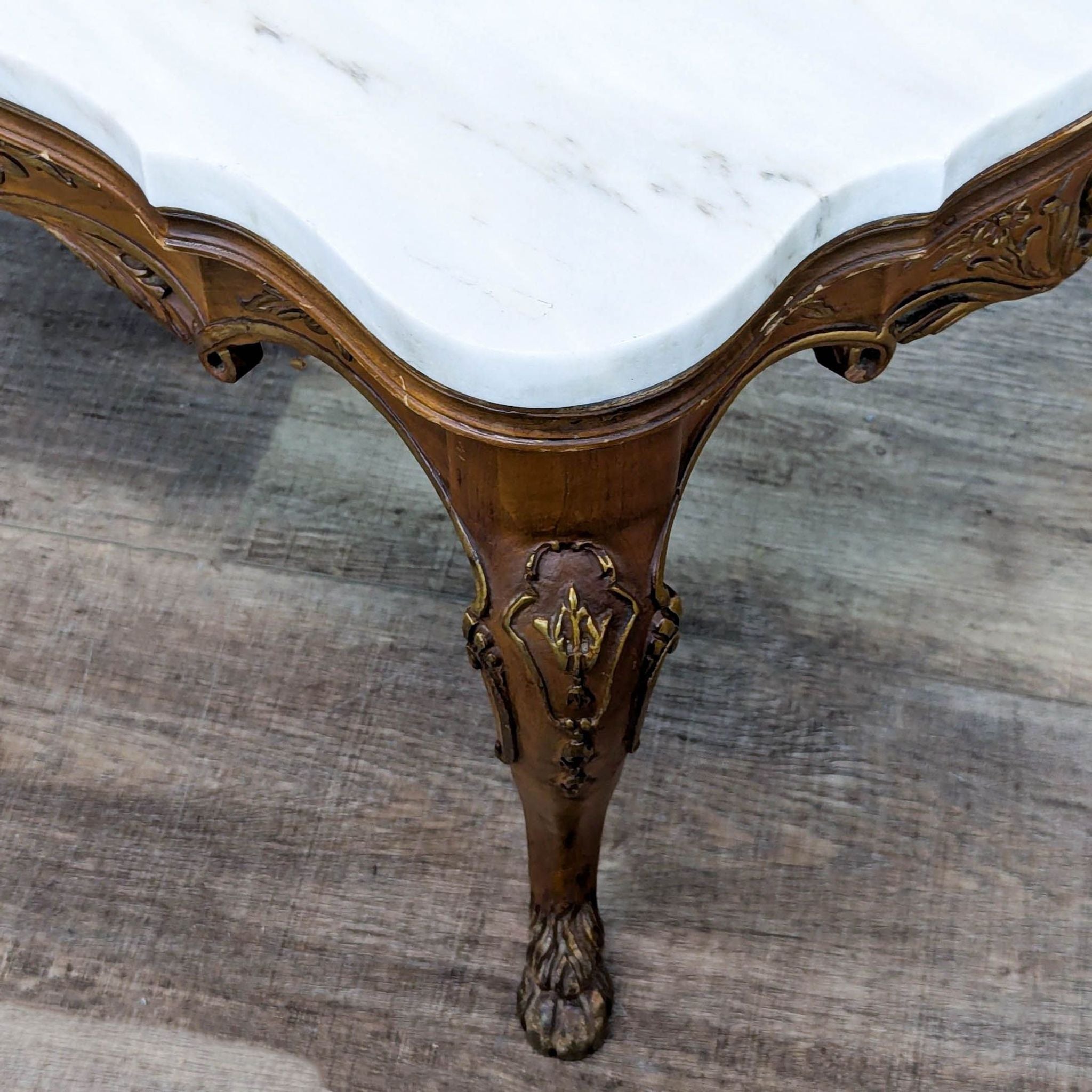 Carved wood base with floral motifs, cabriole legs resting on paw feet