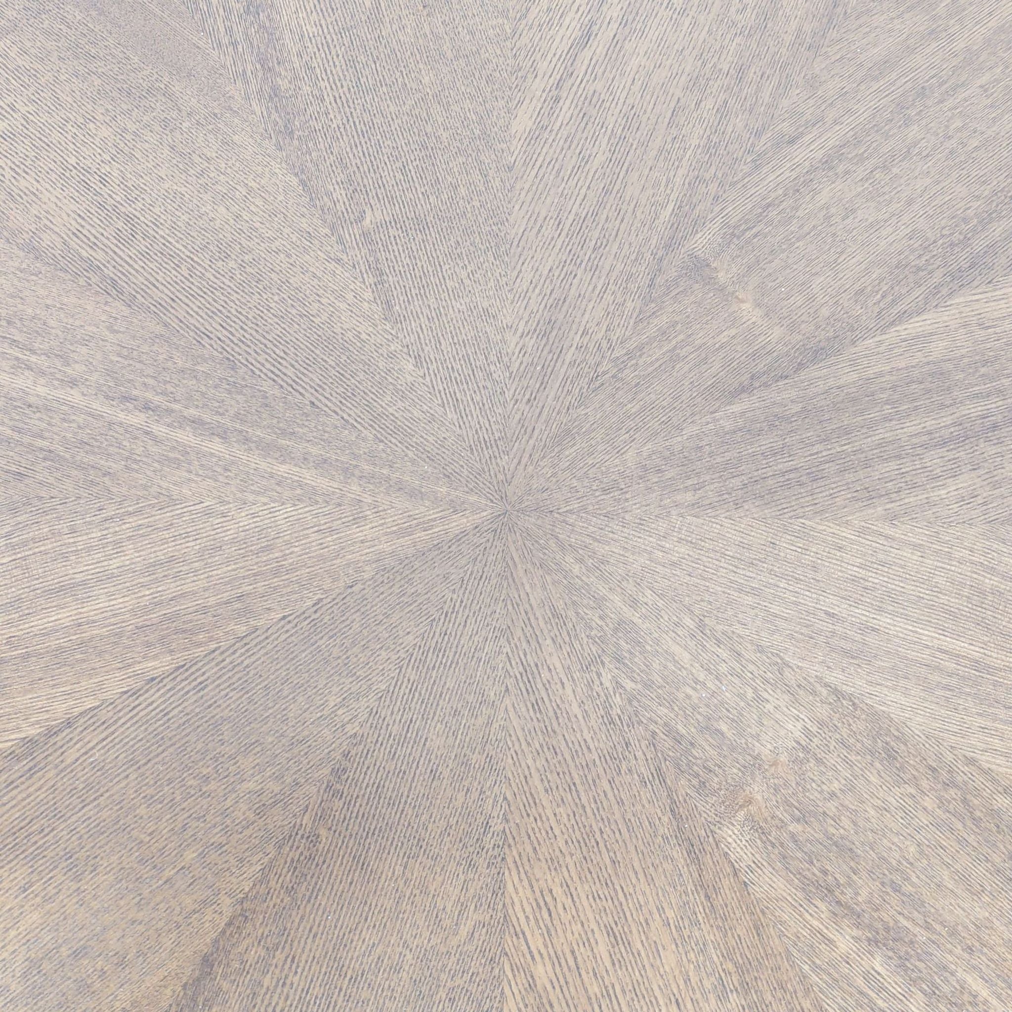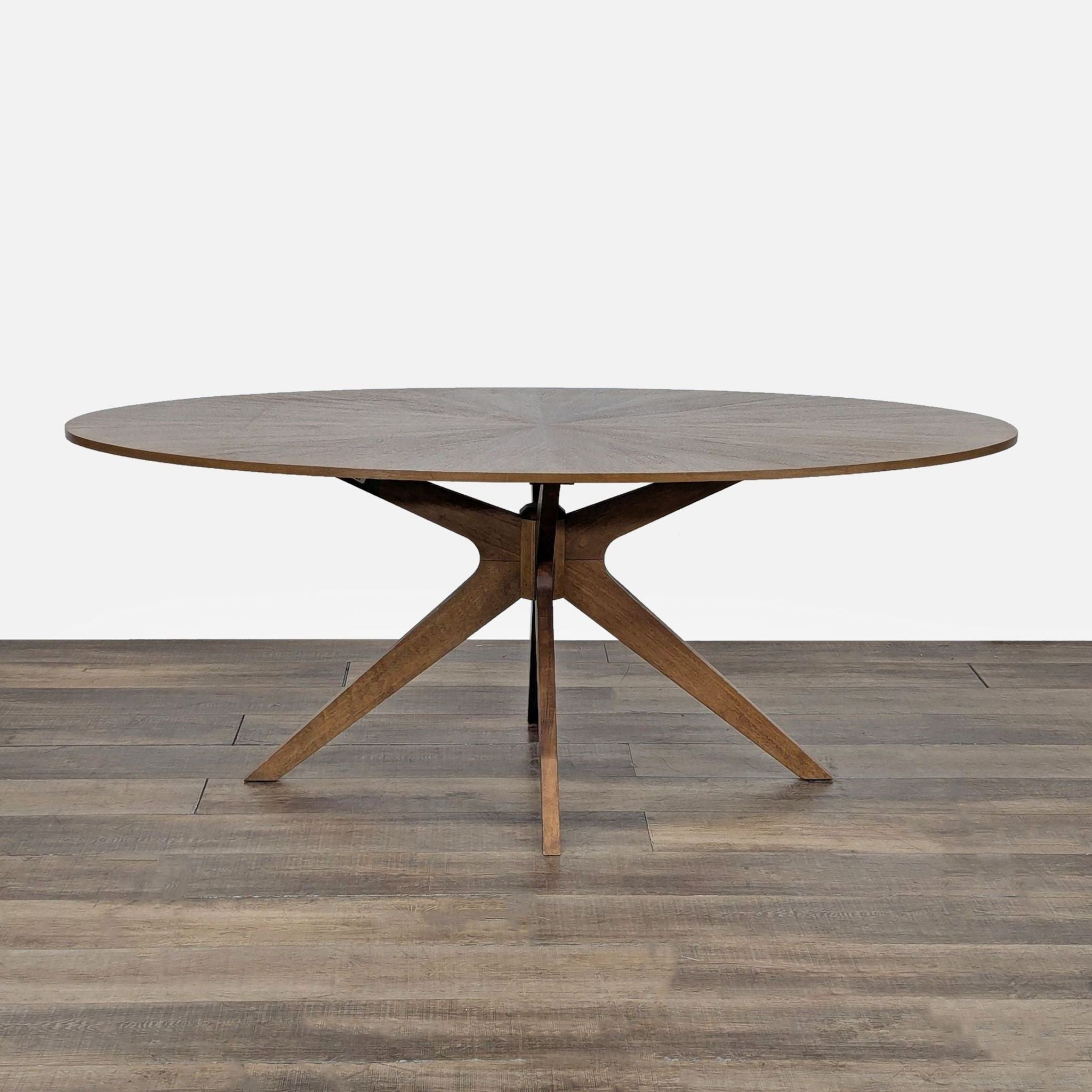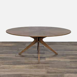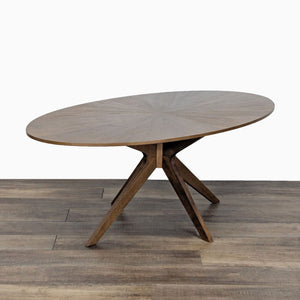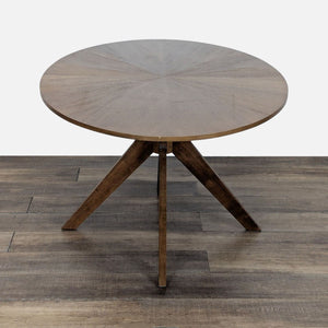 This mid-century style walnut finish dining table is set atop solid wood legs and features a veneered starburst-style design on the top.