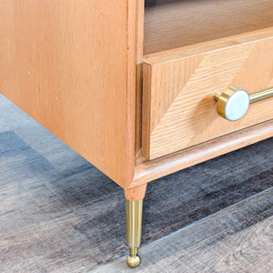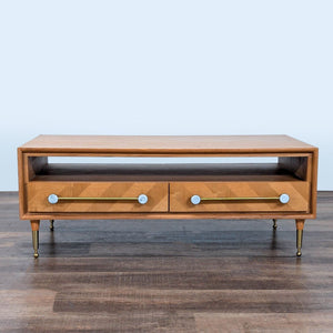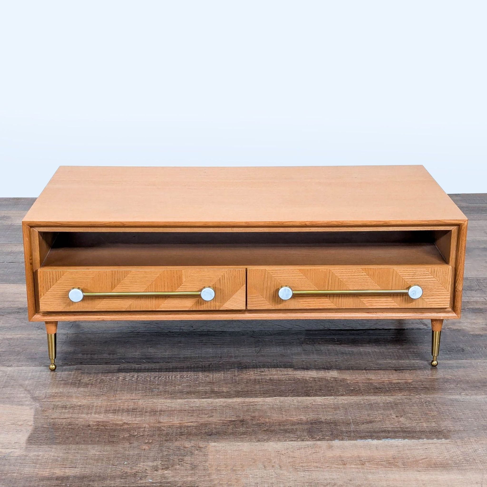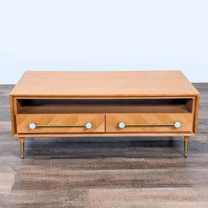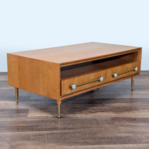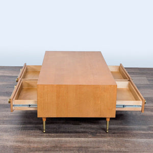 Four inlaid drawers opening at opposite sides of the table with metal hardware
