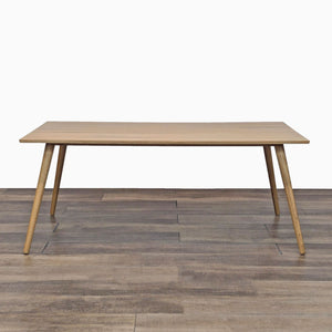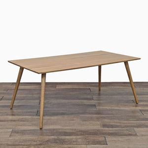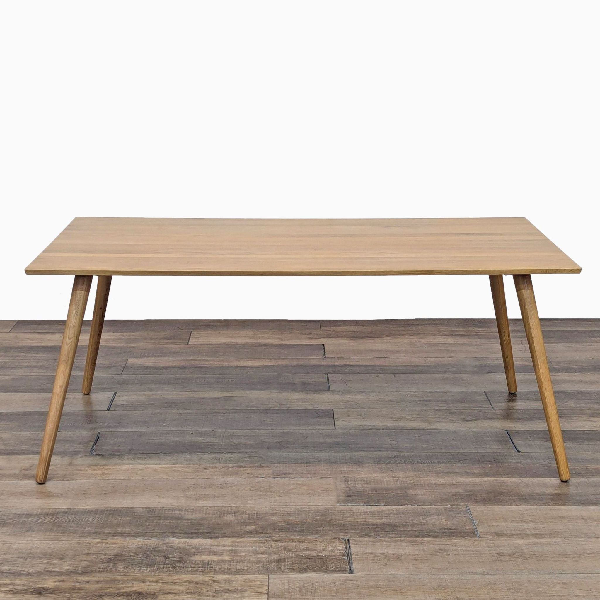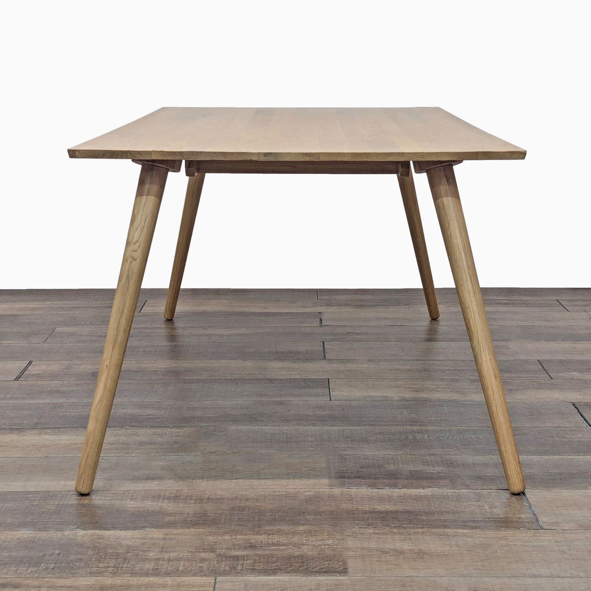 Table is oak veneer and rubberwood in an oak stain. It seats 6.