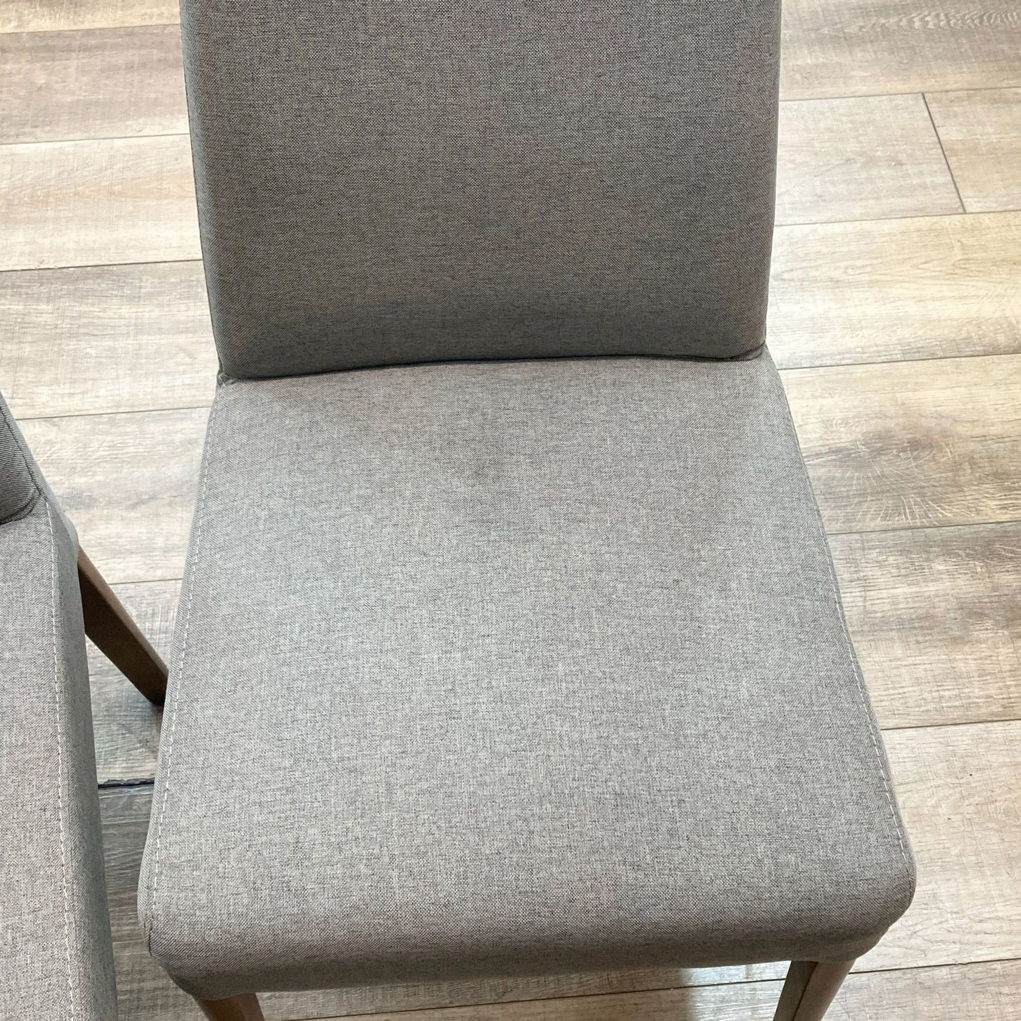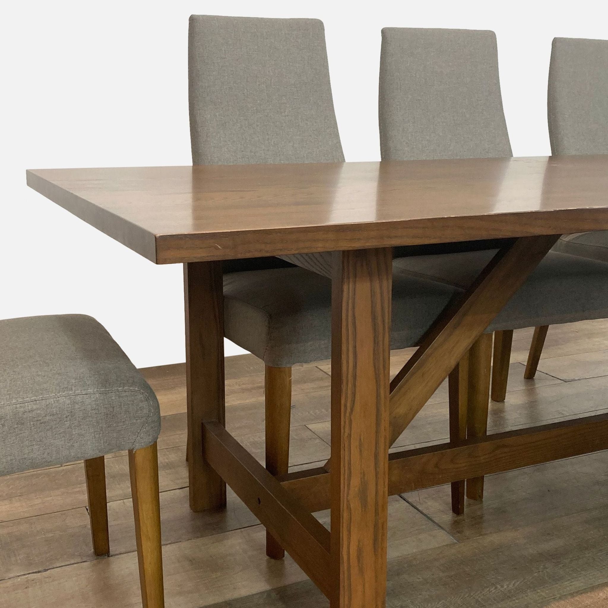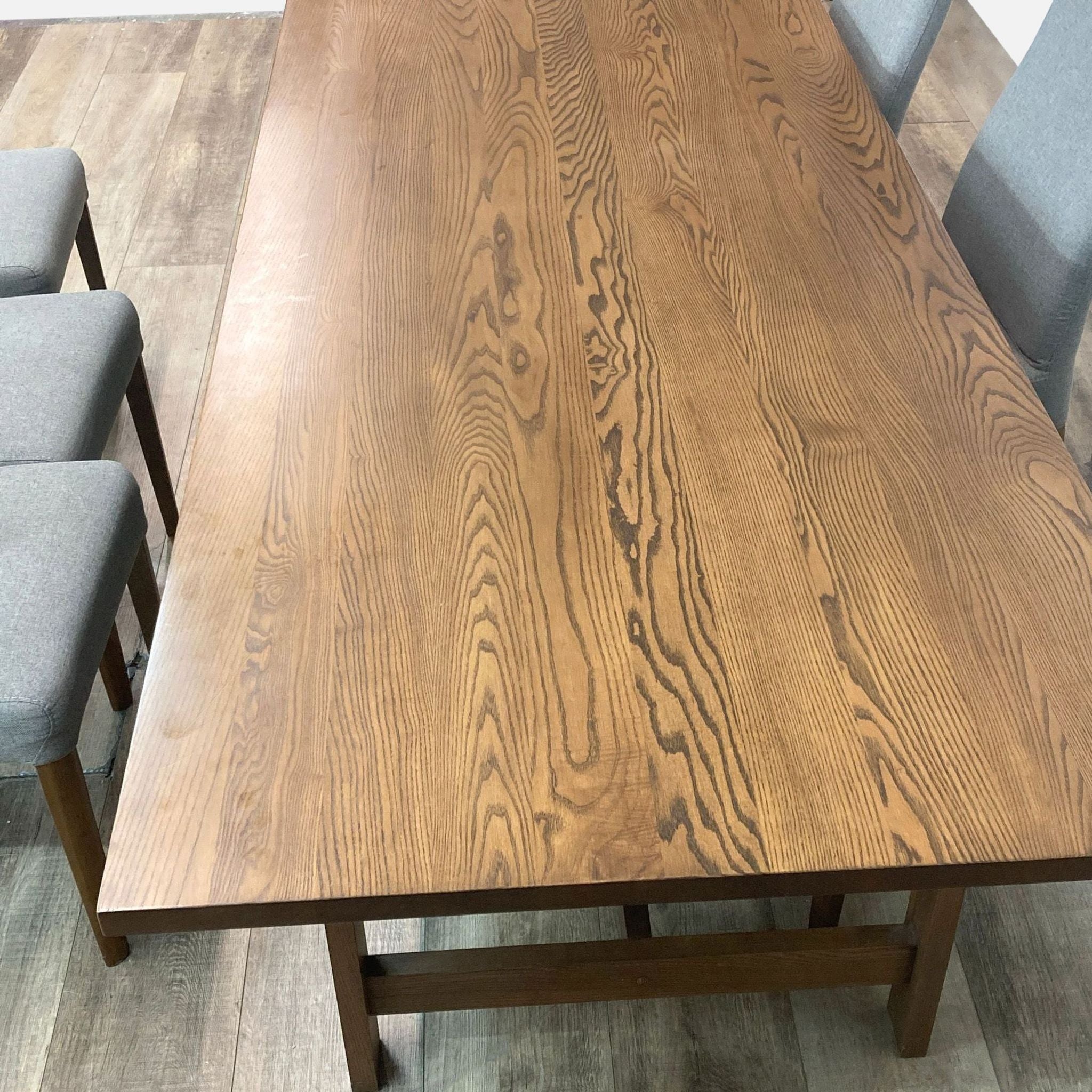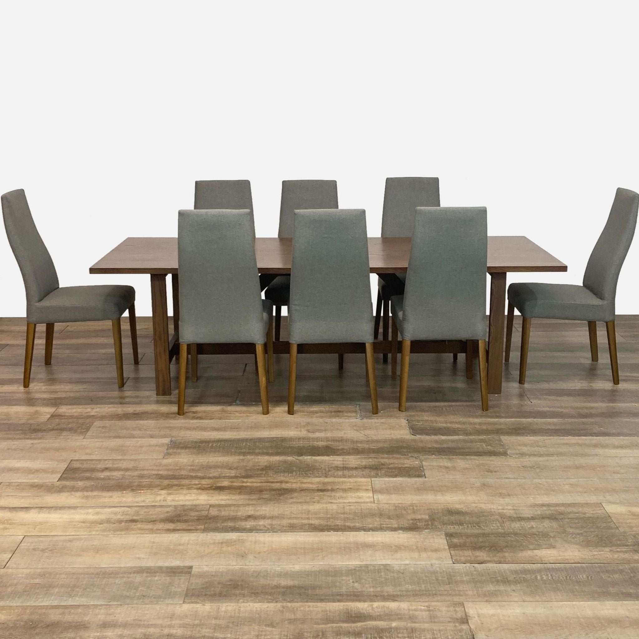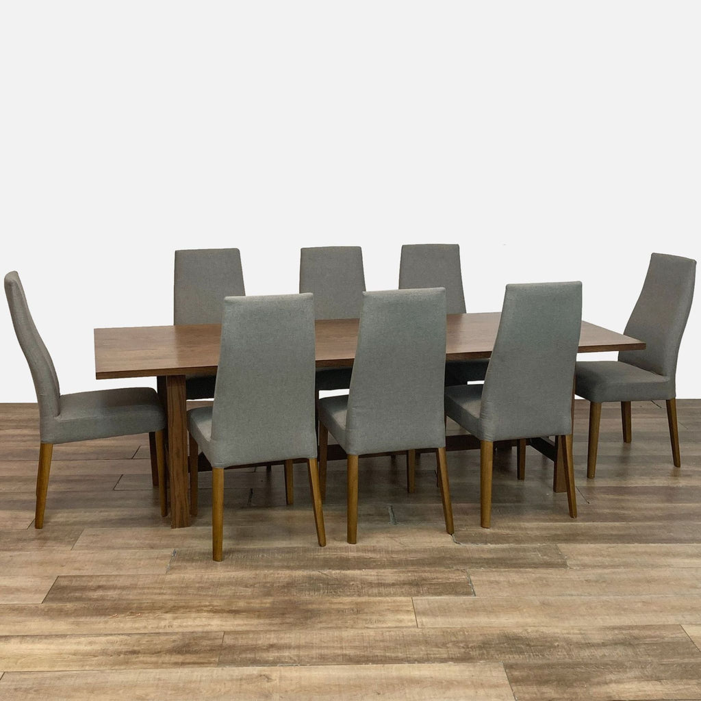 This dining set features a sturdy rectangular wooden table and eight comfortable grey upholstered chairs with high backs.