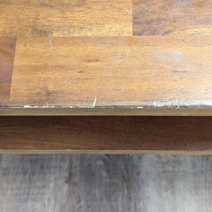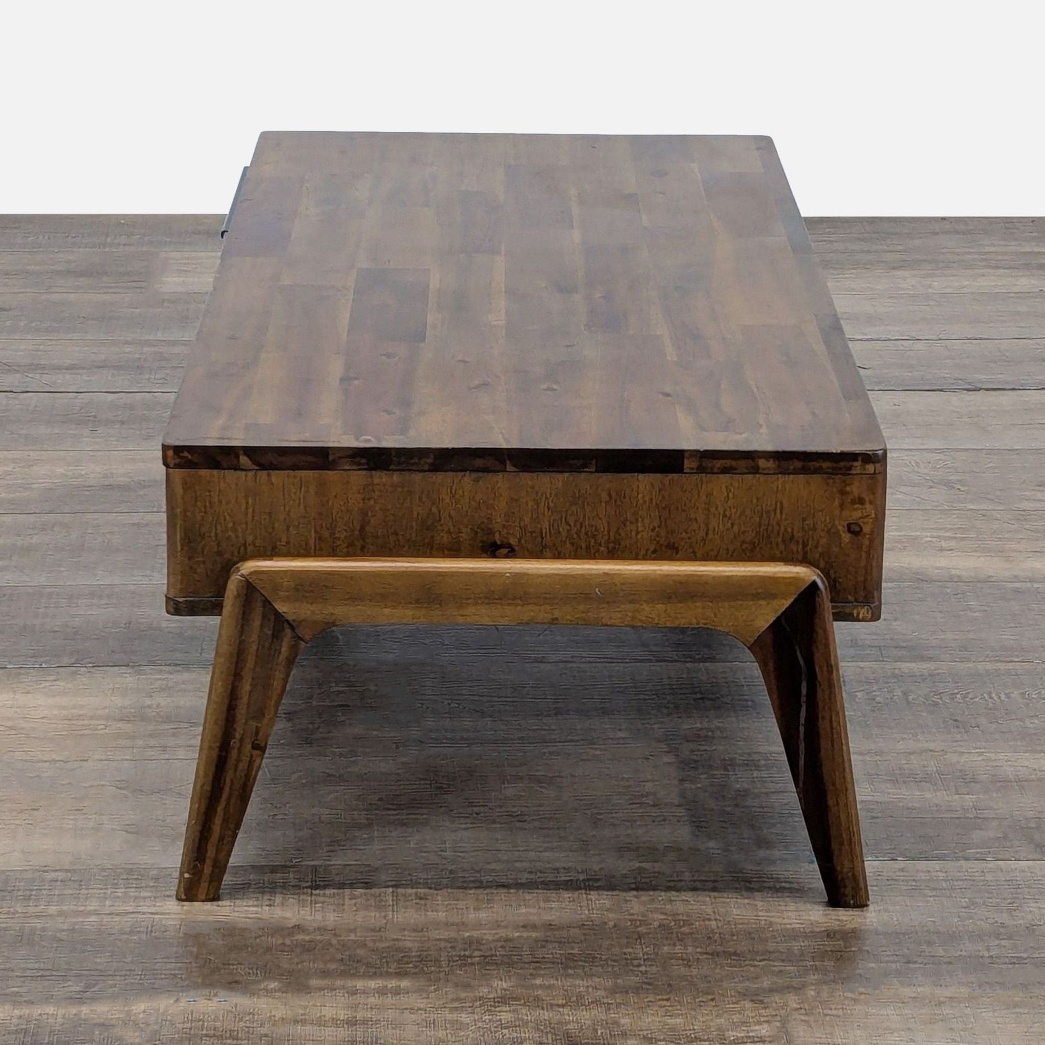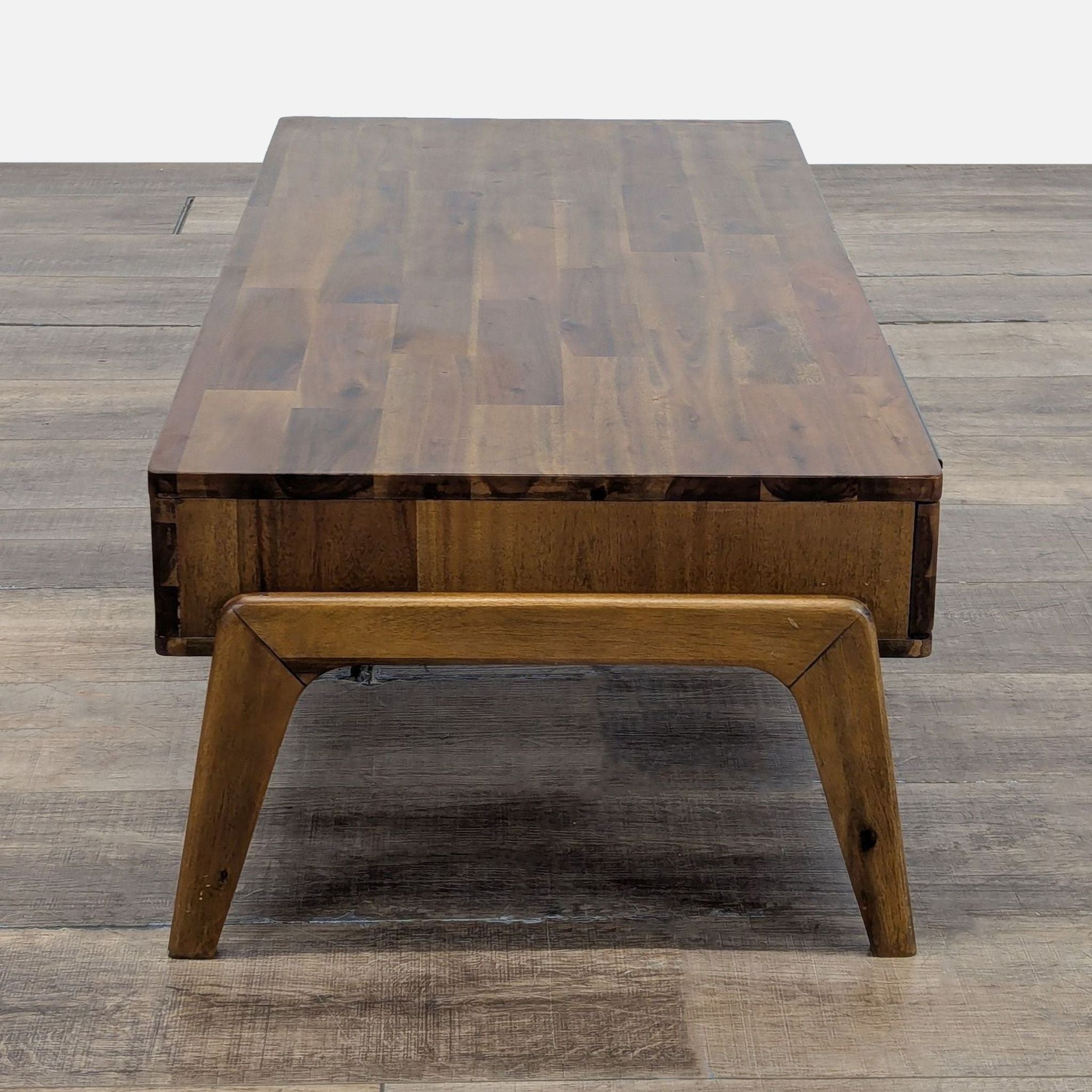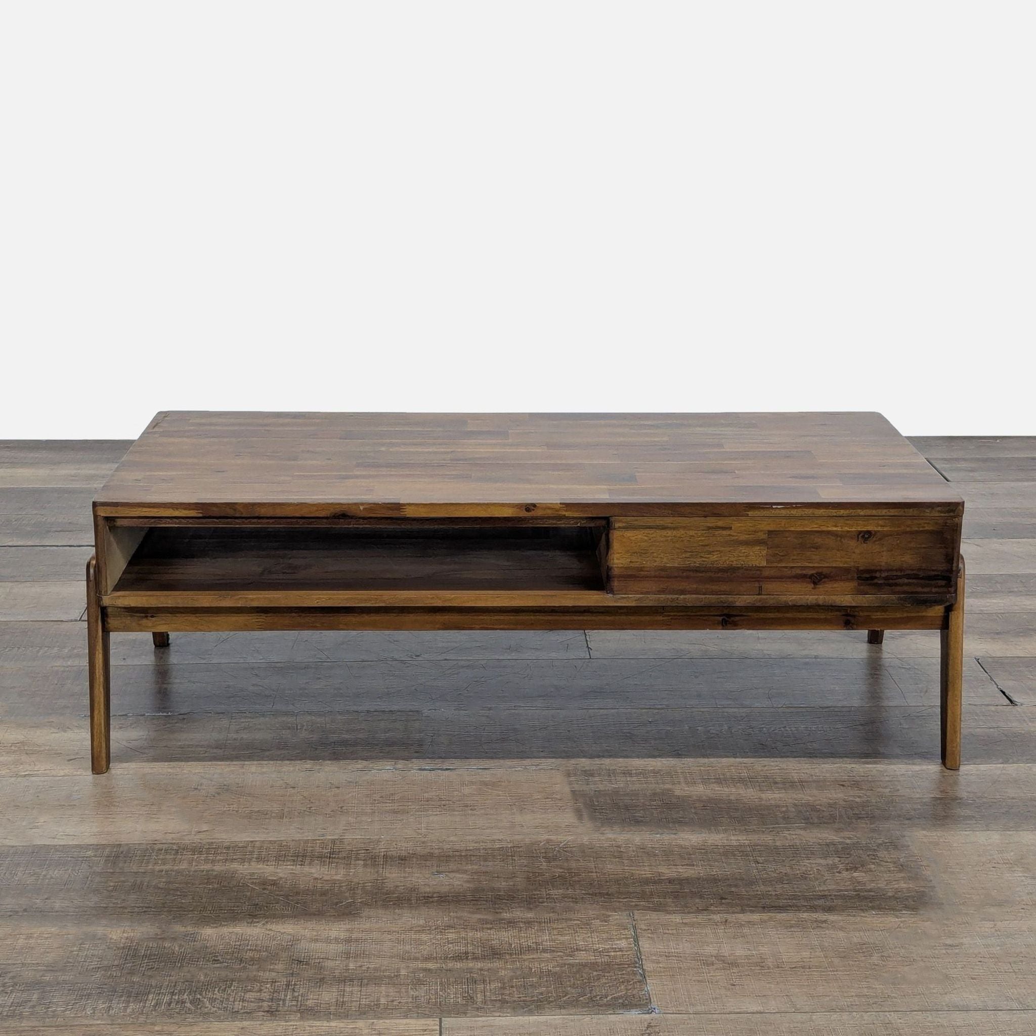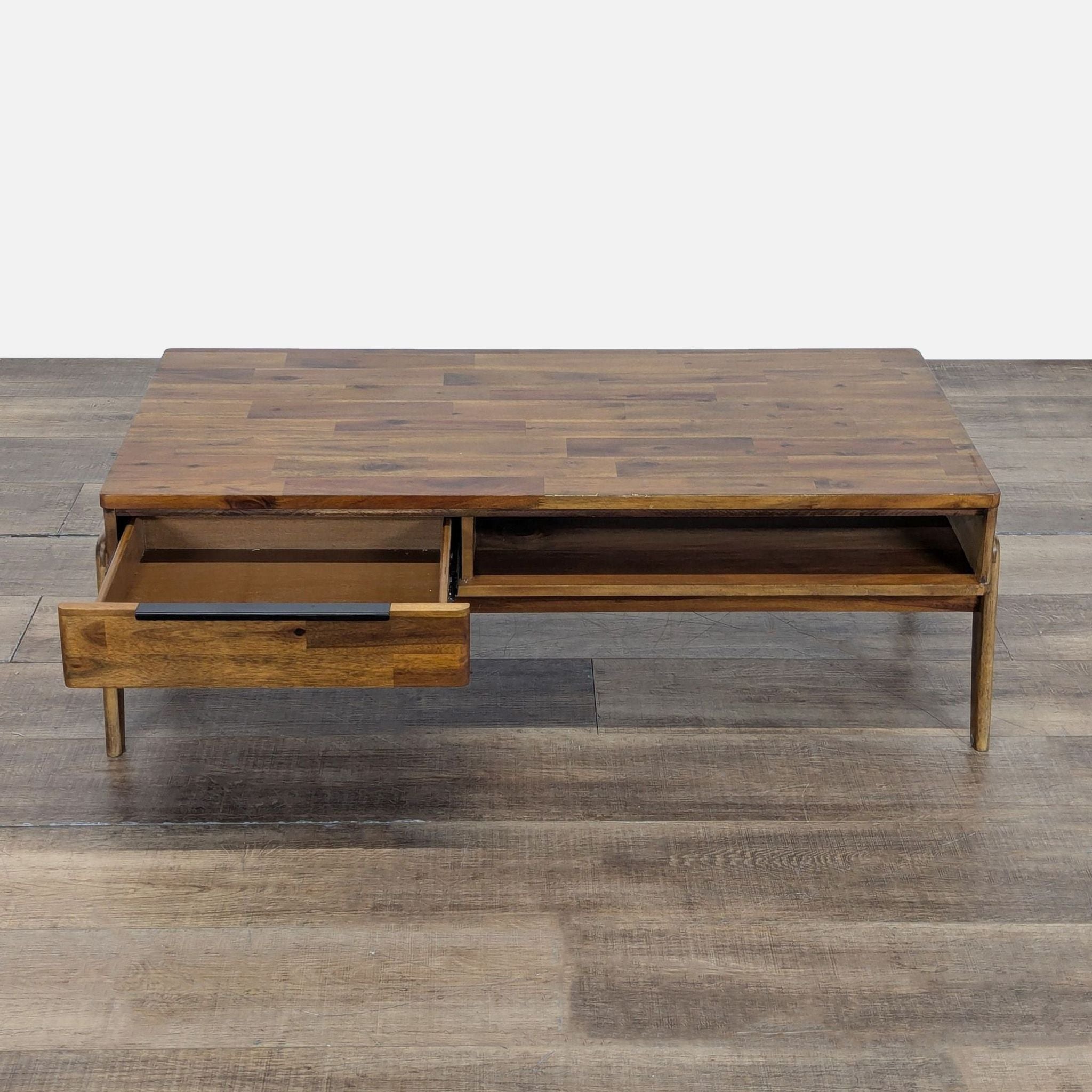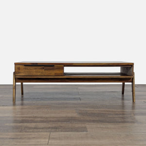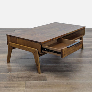 Inspired by Scandinavian design, this Mid-Century style table is made of Acacia wood and has one drawer and an open storage shelf.