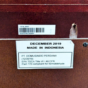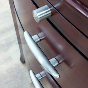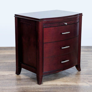 The nightstand is crafted from tropical mahogany solids and cherry veneers. It comes with a pull-out tray.