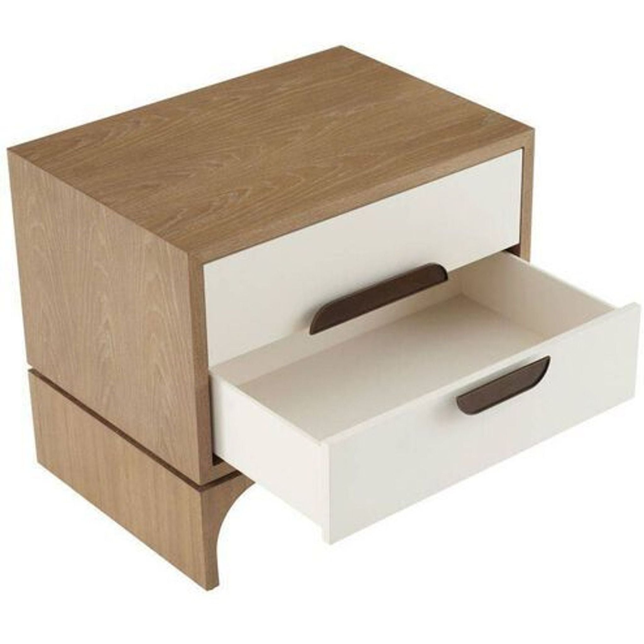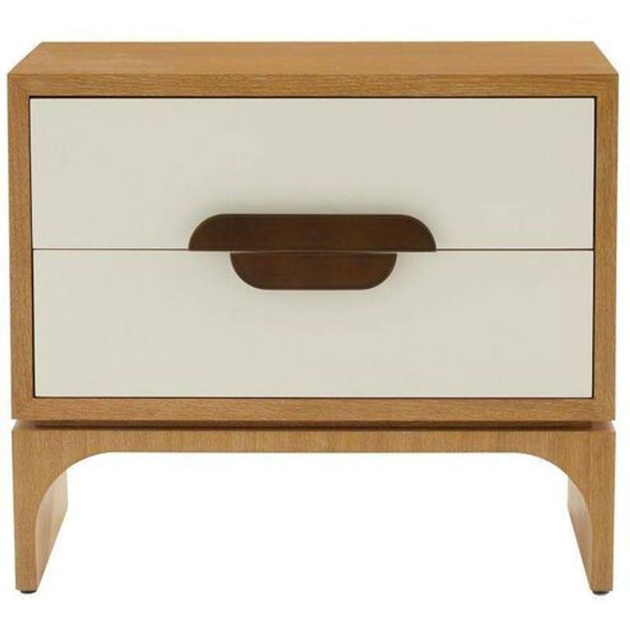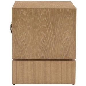 A white lacquer face is set within a veneered oak wood frame in an oyster finish. Inspired by modernist sculpture, the curved door pulls are crafted in heritage brass, while the exaggerated base features a racing stripe reveal visible from every angle.