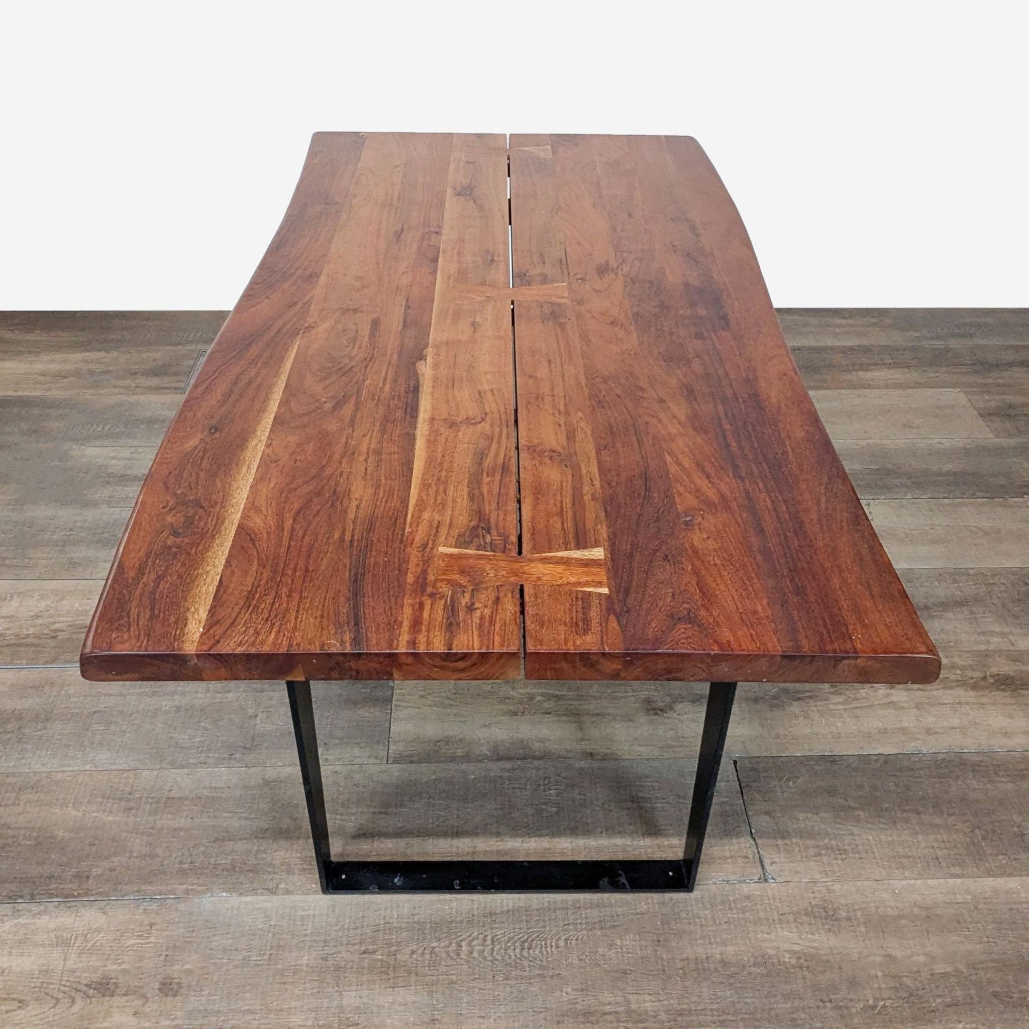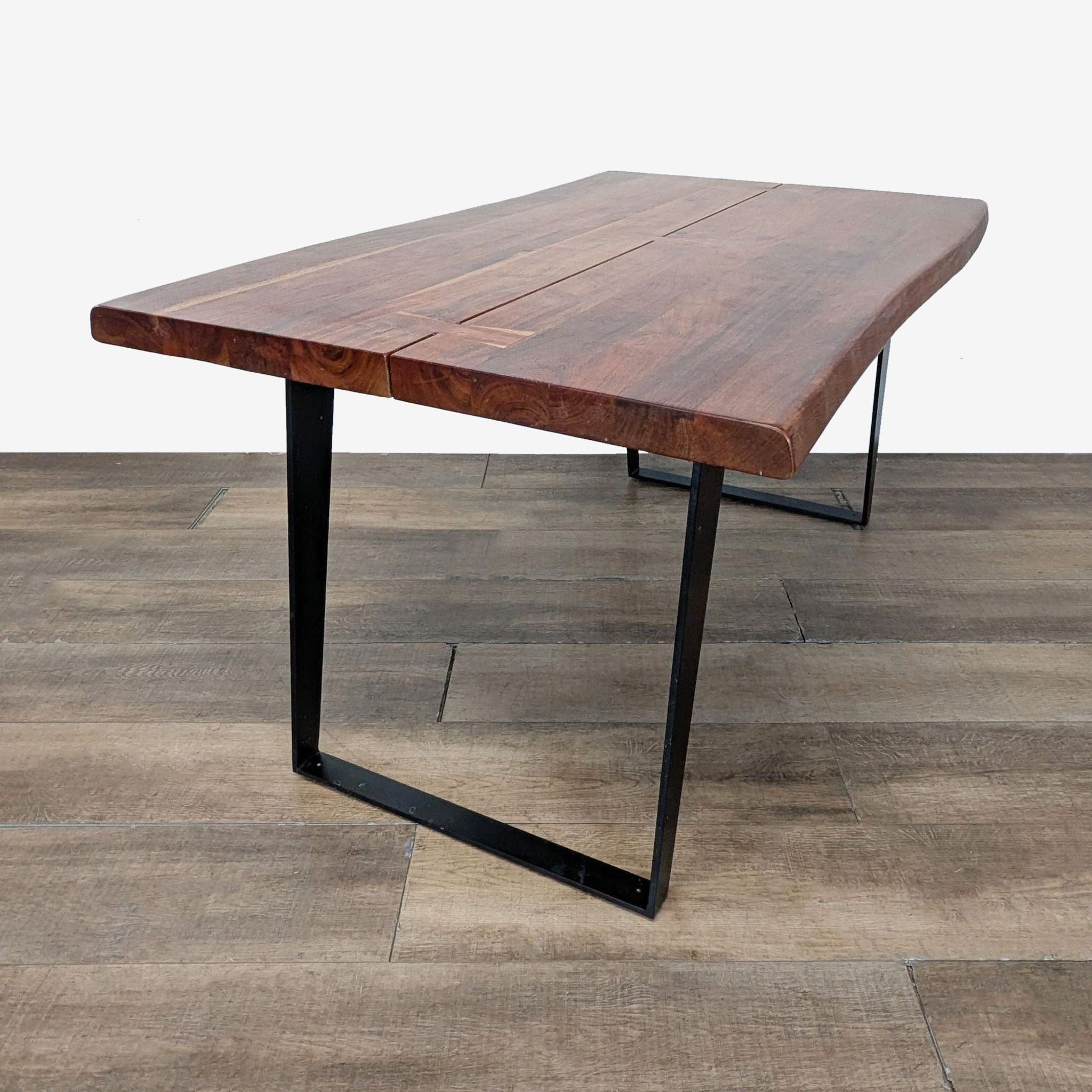 The table features planks of live-edge acacia wood braced with butterfly joints. Angled, U-shaped steel legs finished in matte antique black provide sturdy support and modern counterpoint to the organically shaped top.