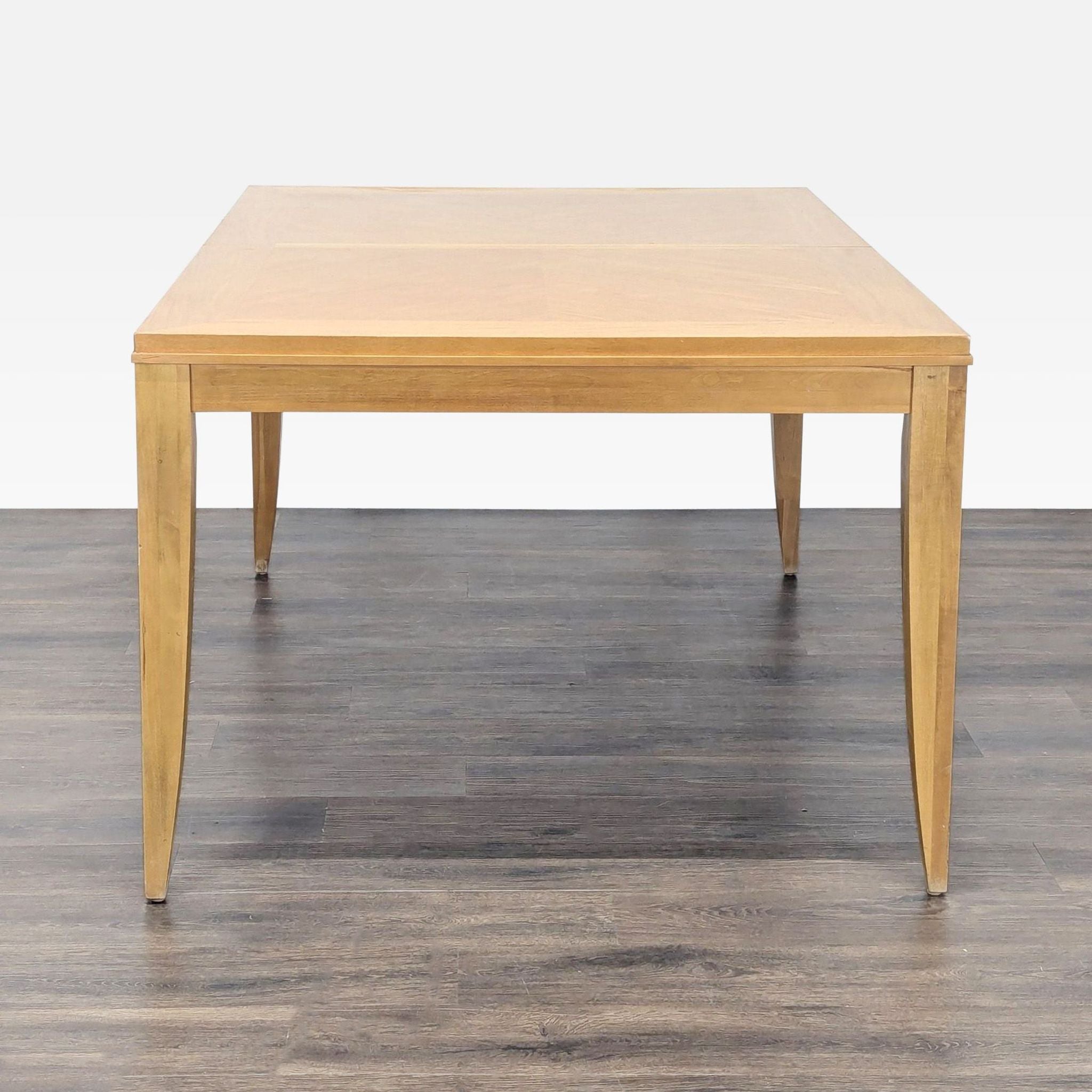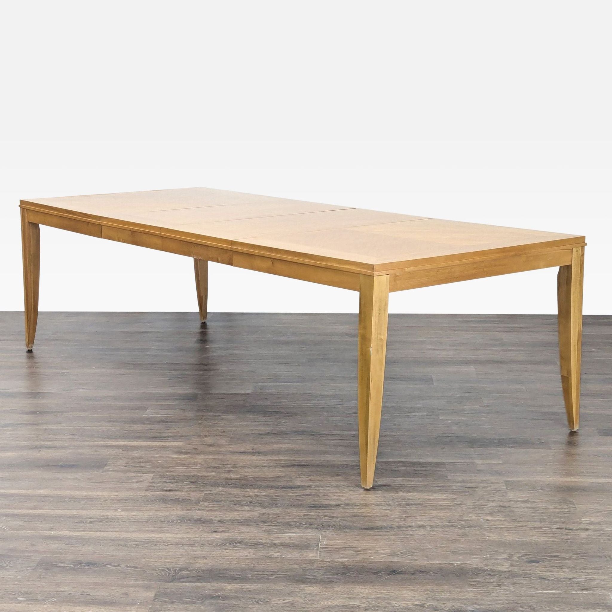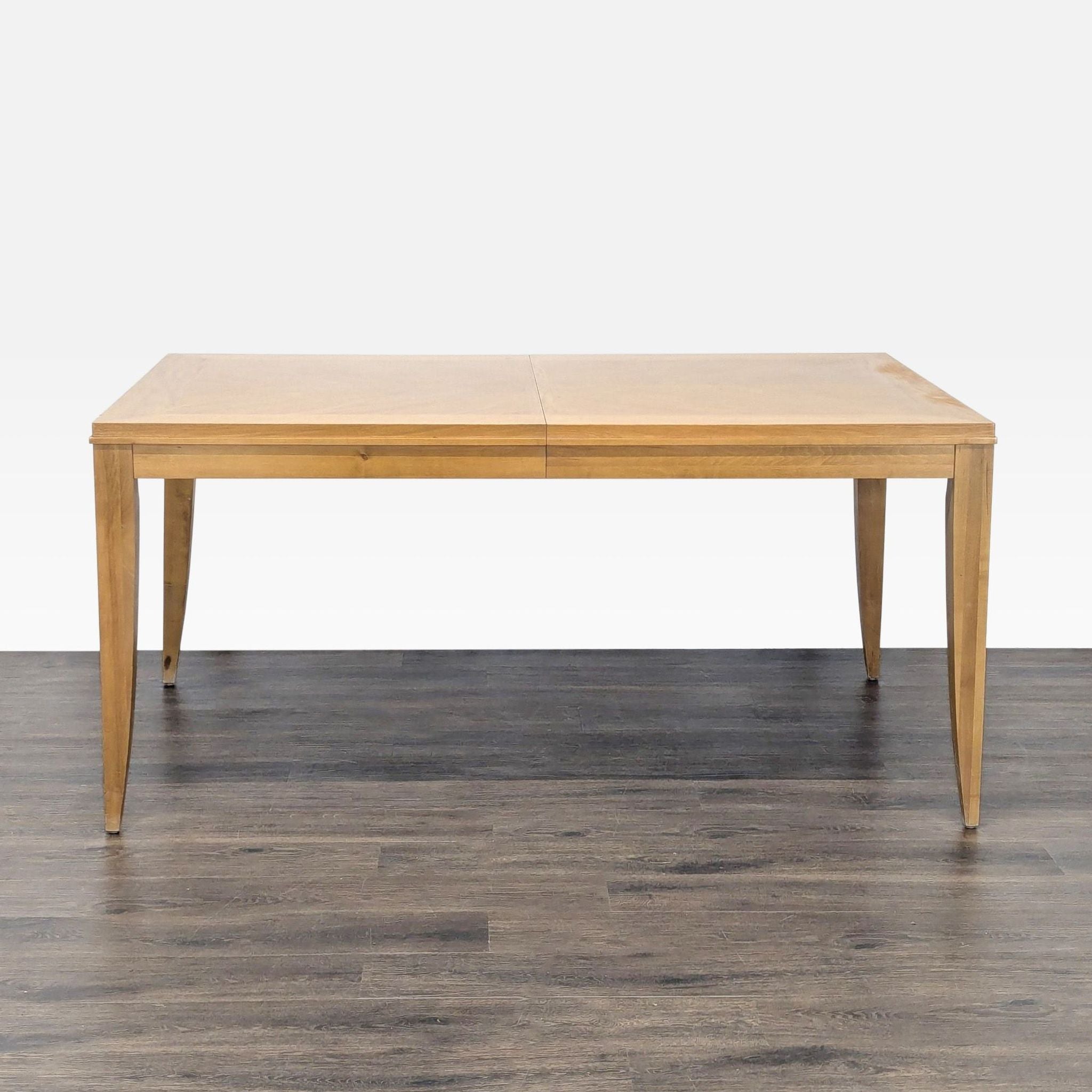 This Ethan Allen dining set includes a sturdy expandable rectangular table and five chairs with comfortable black upholstered seats. The natural wood finish adds a warm touch to any dining area. Perfect for family meals or entertaining guests, this set combines style and durability.
