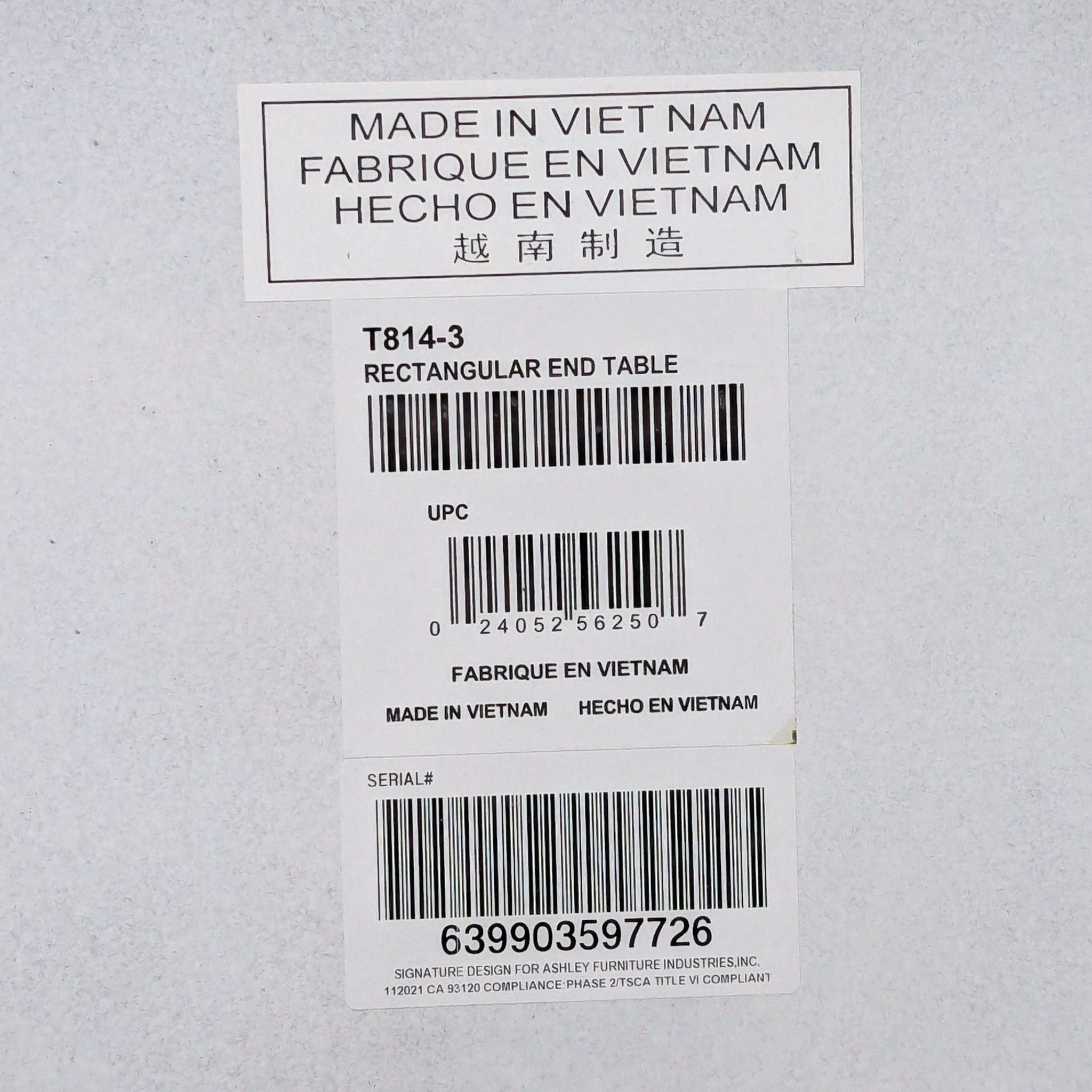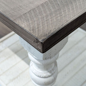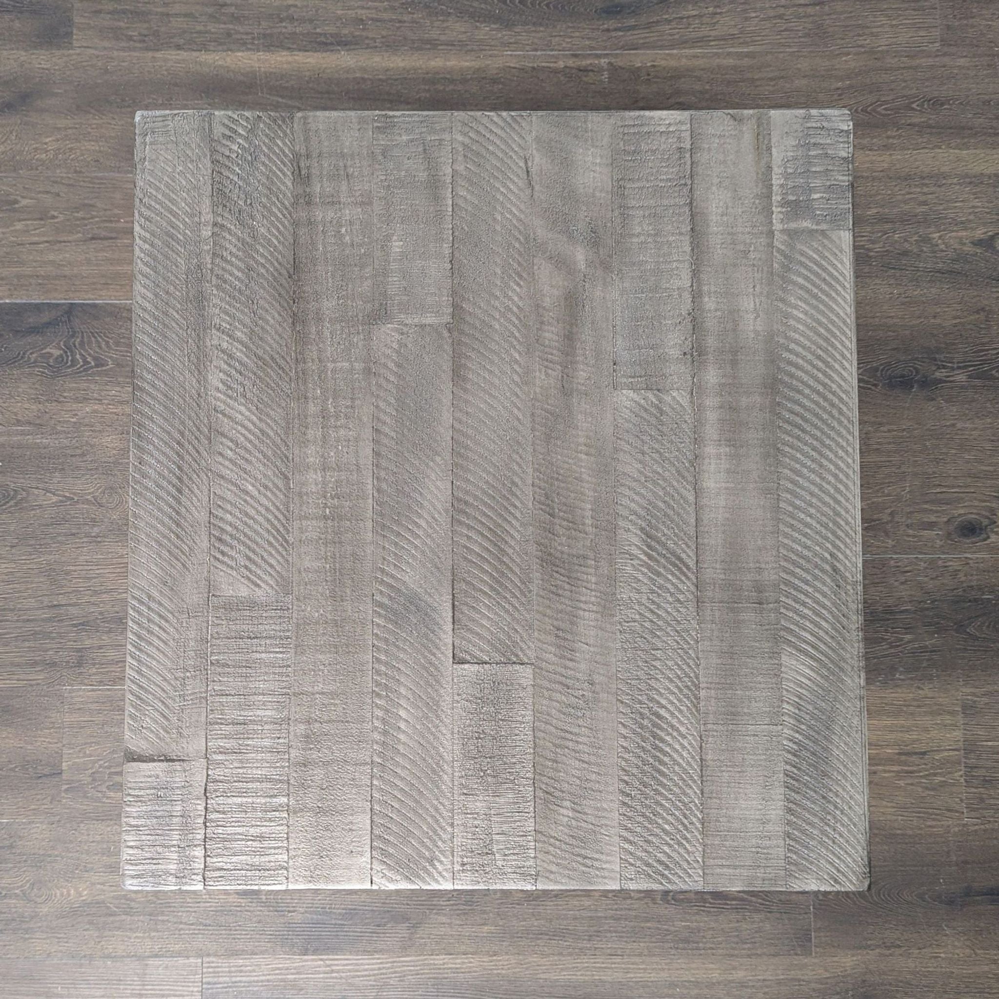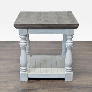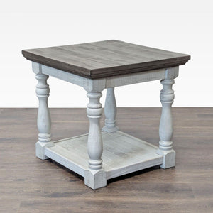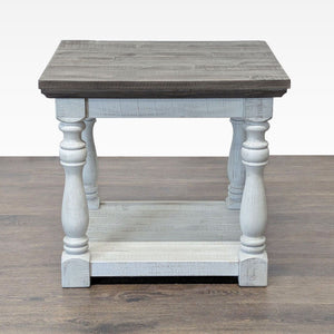Two tone farmhouse style end table made of pine wood, pine veneer and engineered wood.