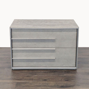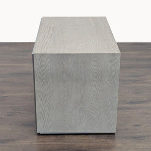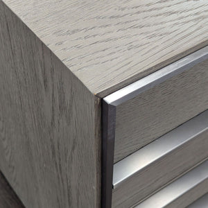 Designers Thomas Bina and Ed Robinson combine metal and wood with clean lines and striking asymmetry. White oak is framed by raised metal hardware and trim. The wood is sandblasted, wire brushed, stained and waxed for a warm patina. Raised metal framing and hardware highlights the simple, linear forms, and the stainless-steel finish is also brushed.