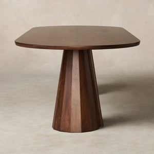 The Bank Table has a beveled-edge tabletop and conical base encircled by facets and a distinctive overlap. It is handcrafted at a family-owned workroom in upstate New York.