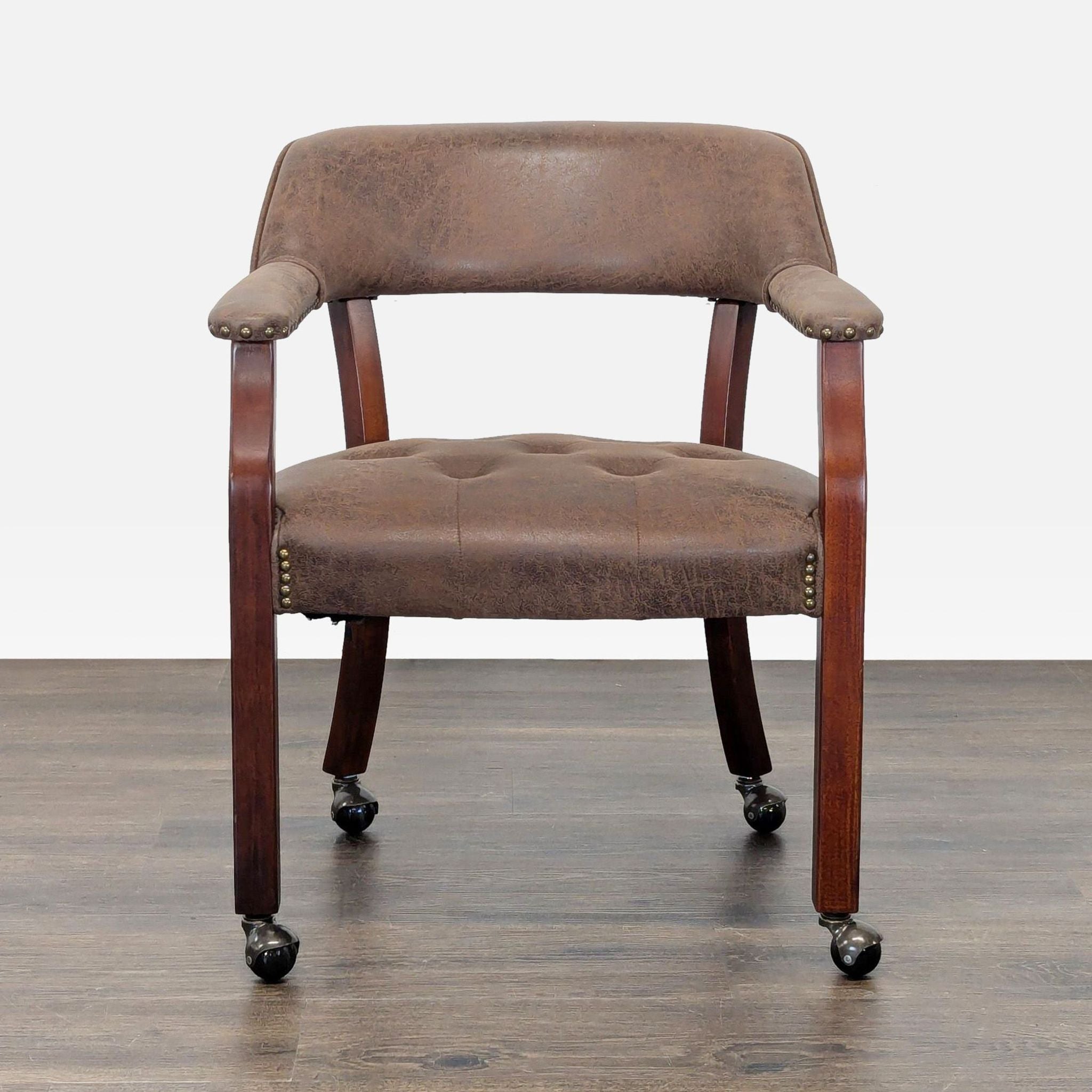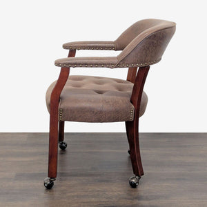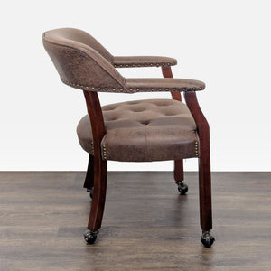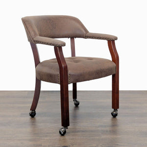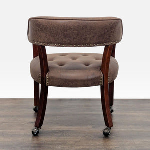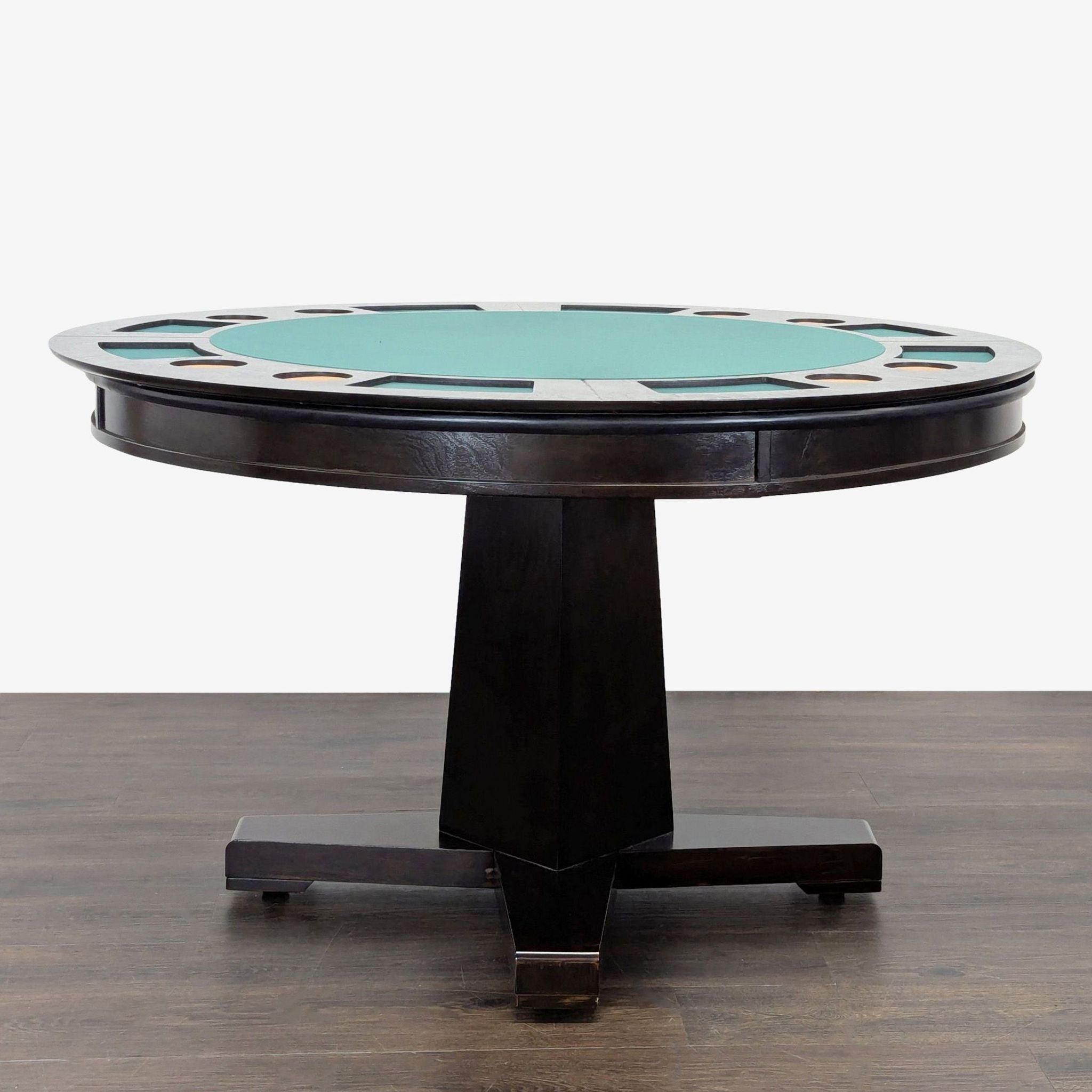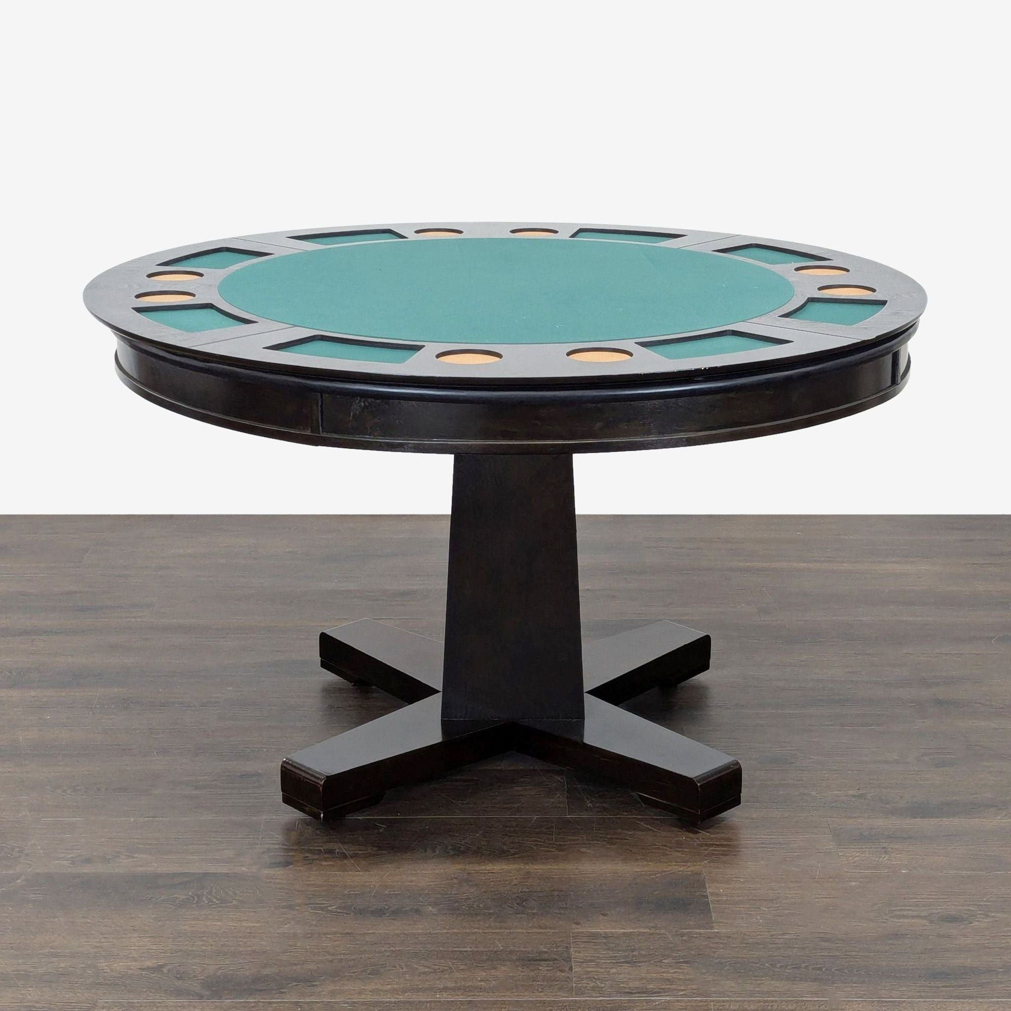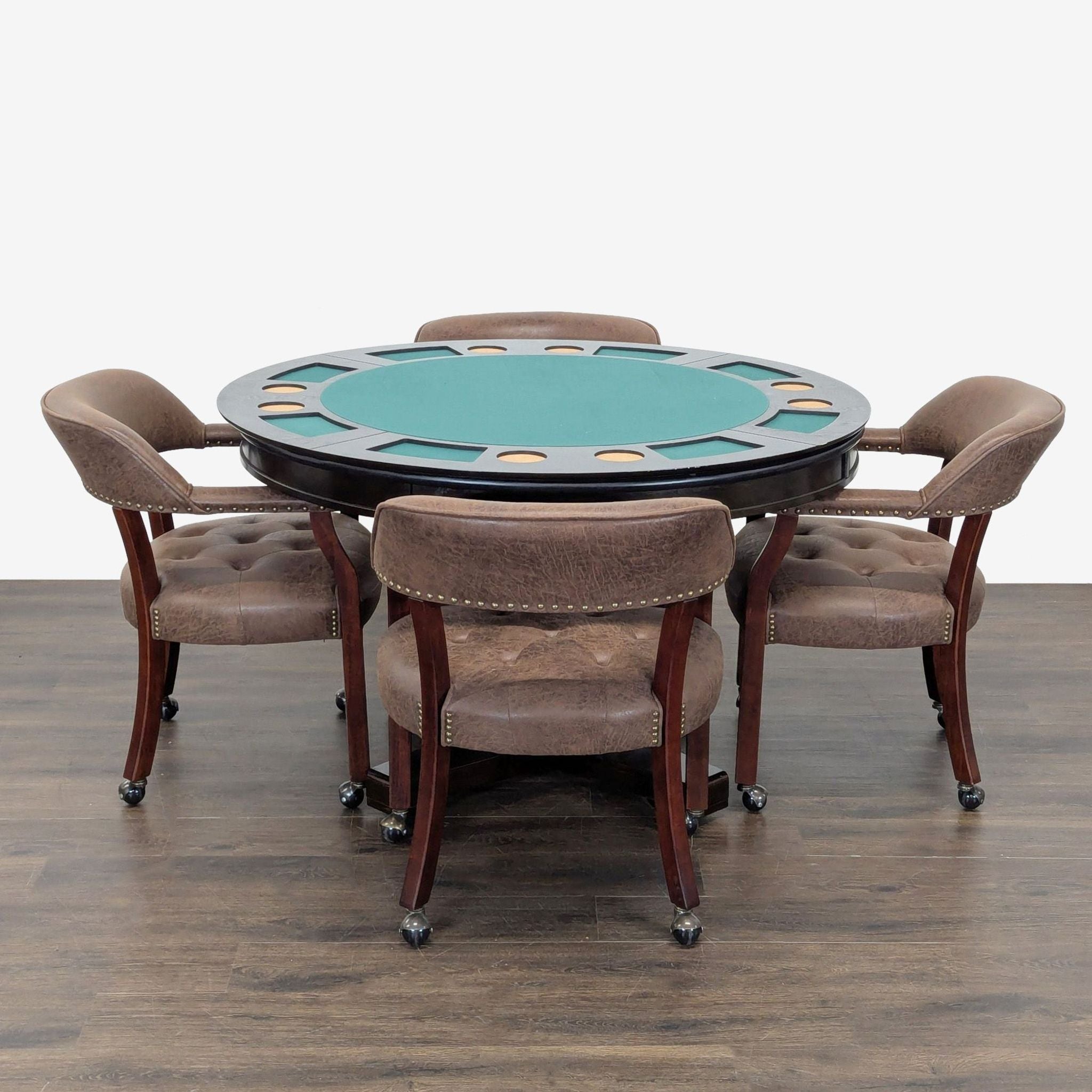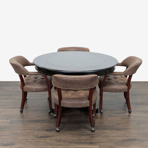 This versatile dining set includes a round table that easily converts from a dining surface to a poker table. The poker side features a green felt playing area, built-in cup holders, and chip trays for convenience. The set comes with 4 cushioned chairs on wheels, upholstered in brown faux leather for comfort and easy movement. Perfect for dining, game nights, or gatherings.