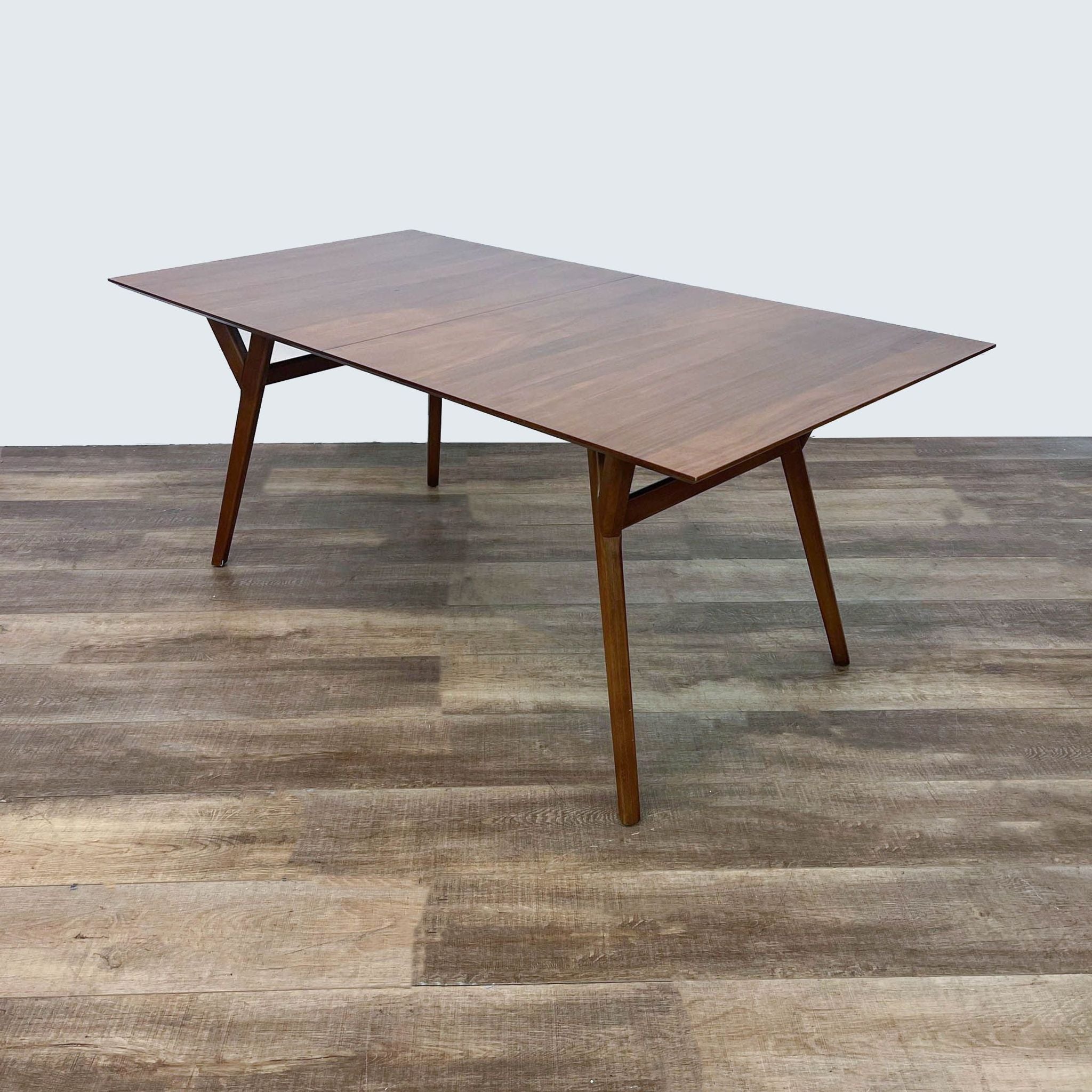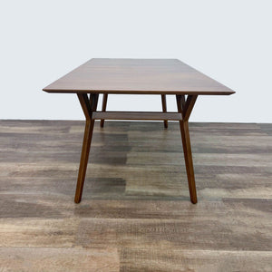 For sale is a West Elm dining table with a sleek mid-century design. Made with high-quality wood, this table features a warm finish and sturdy, angled legs for a timeless look. Its rectangular top provides ample space and expands with a drop in leaf.